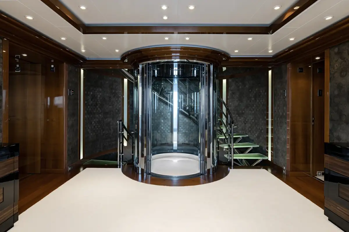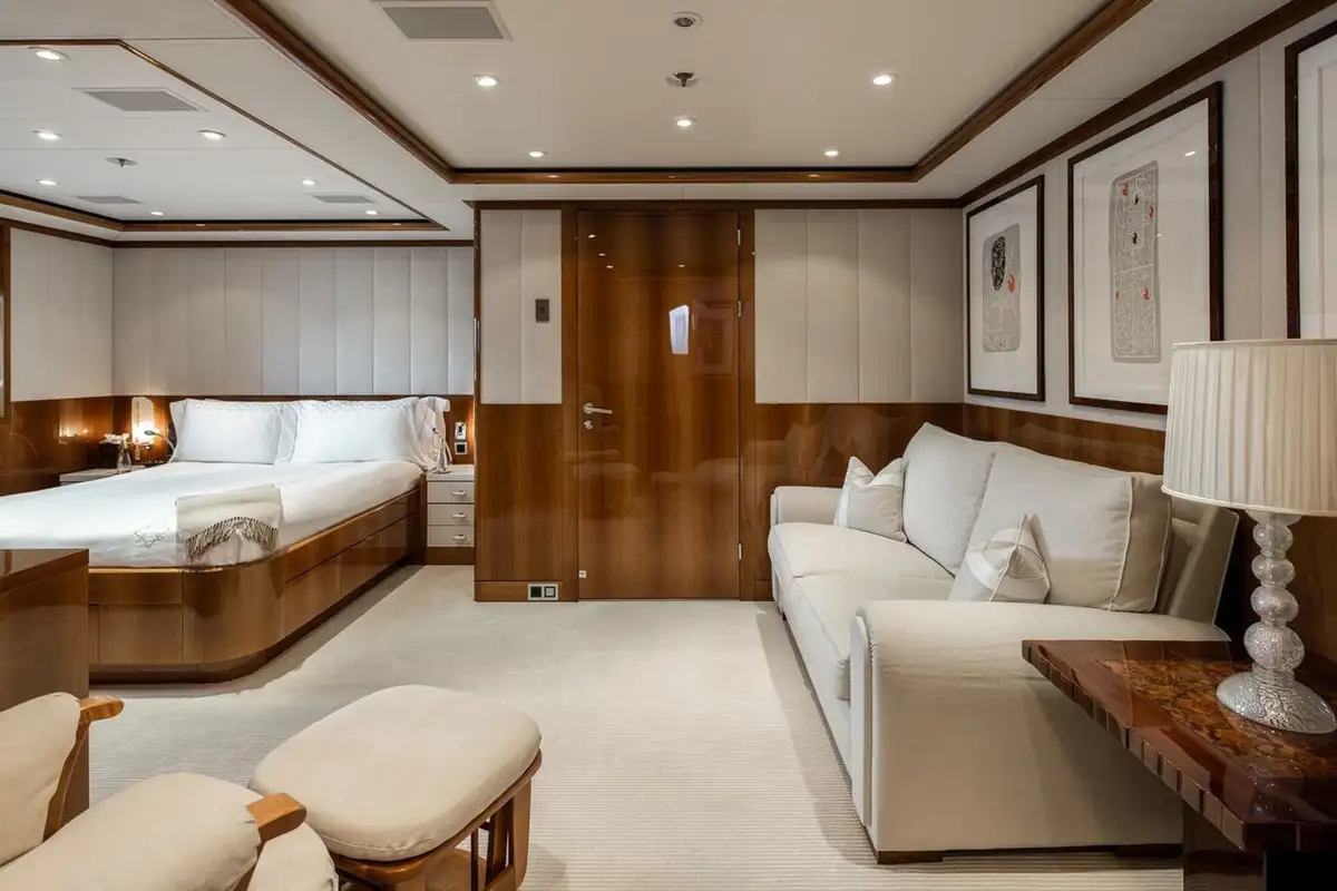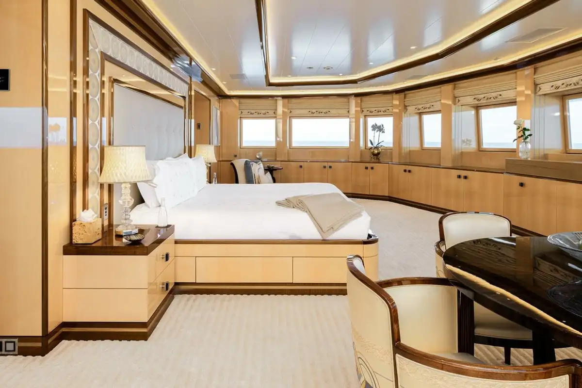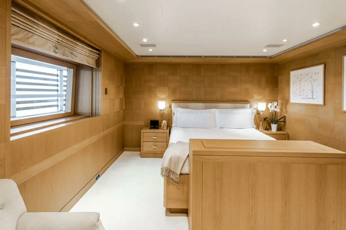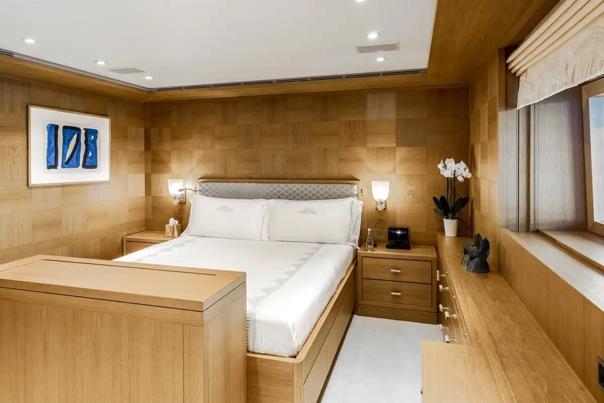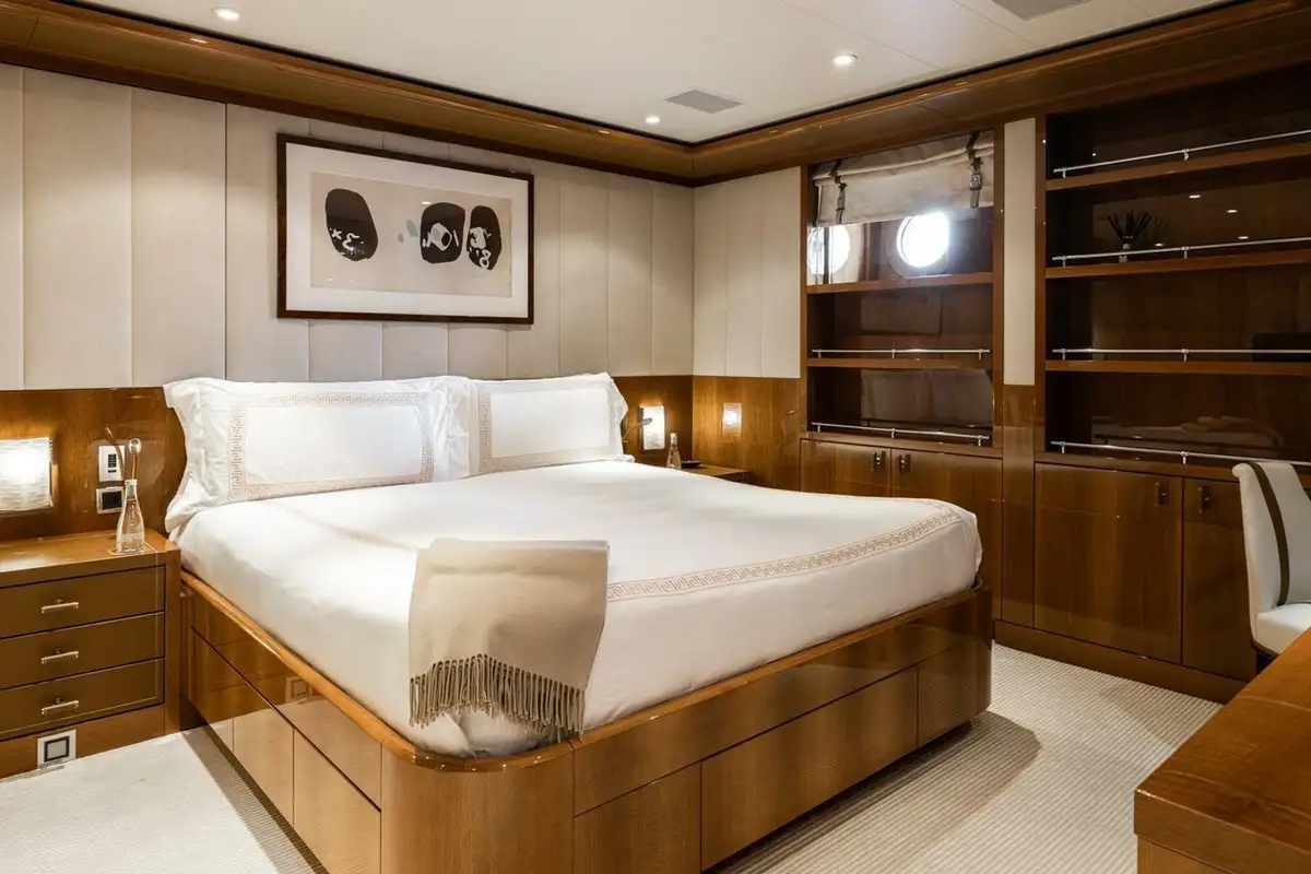 She welcomes up to 18 guests in nine cabins. The owner's cabin takes up almost half of the upper deck's interior. It features a private owner's lounge with office, his-and-hers bathroom around a huge central bath, a very large walk-in wardrobe, a bedroom with access to a Portuguese bridge and a private terrace with two jacuzzis. The main deck has three VIP cabins and two twin cabins, and there are a further two double cabins on the lower deck forward of the lobby, which has its own sea terrace. She also sleeps 24 crew.