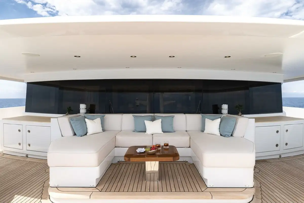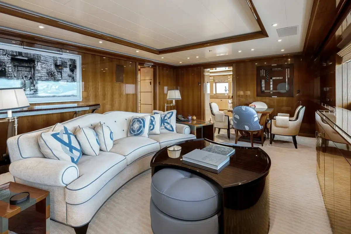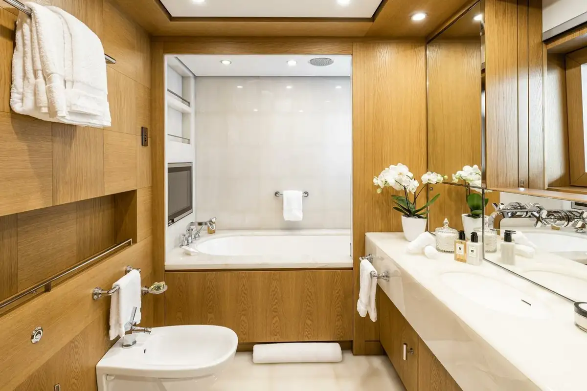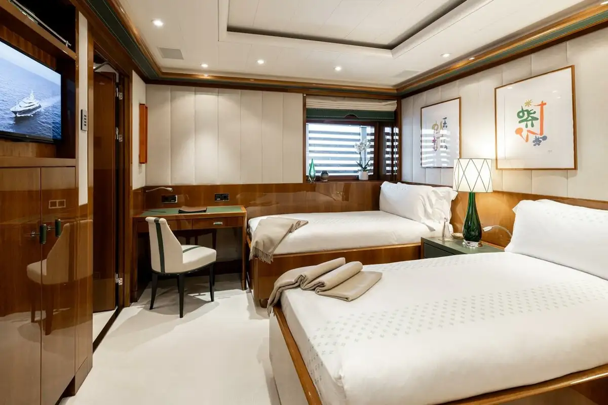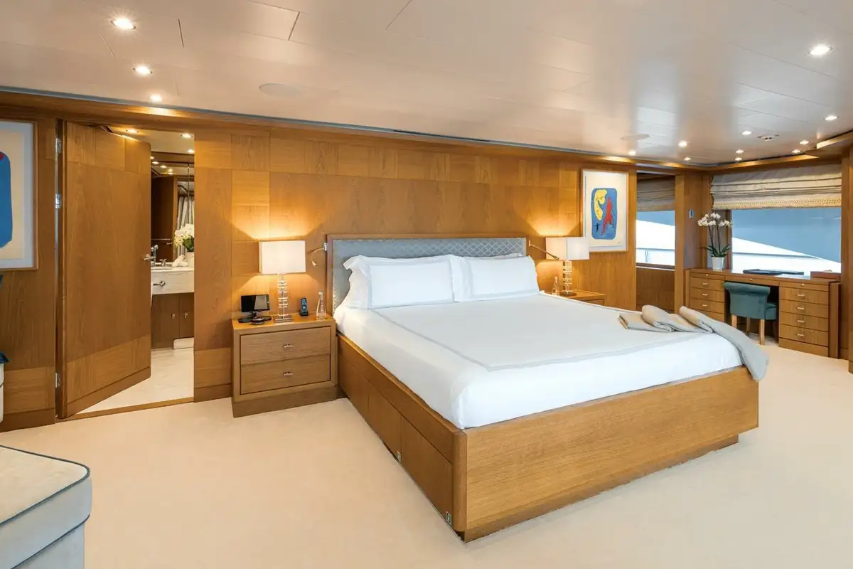 She welcomes up to 18 guests in nine cabins. The owner's cabin takes up almost half of the upper deck's interior. It features a private owner's lounge with office, his-and-hers bathroom around a huge central bath, a very large walk-in wardrobe, a bedroom with access to a Portuguese bridge and a private terrace with two jacuzzis. The main deck has three VIP cabins and two twin cabins, and there are a further two double cabins on the lower deck forward of the lobby, which has its own sea terrace. She also sleeps 24 crew.
