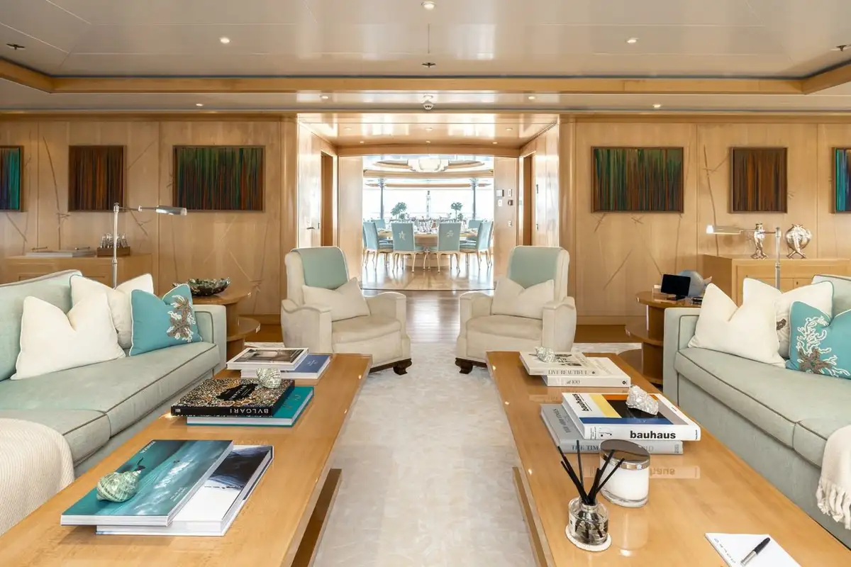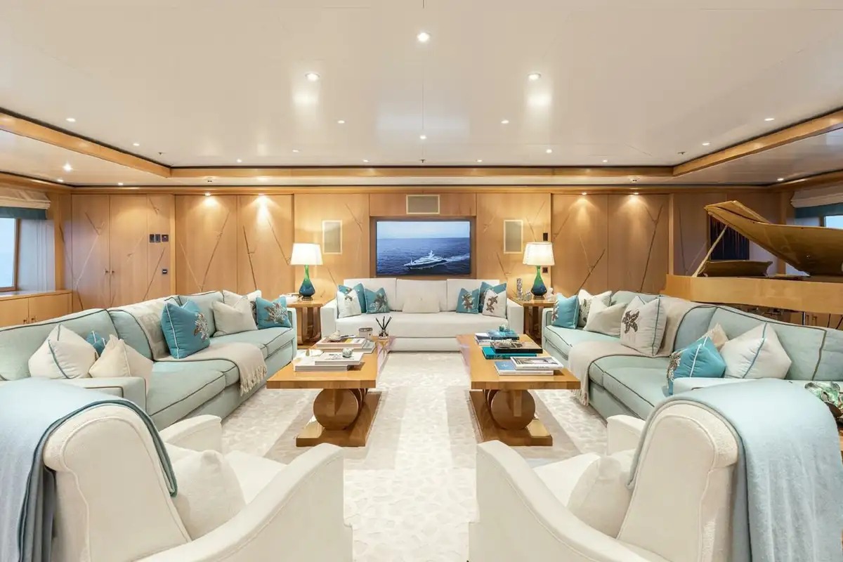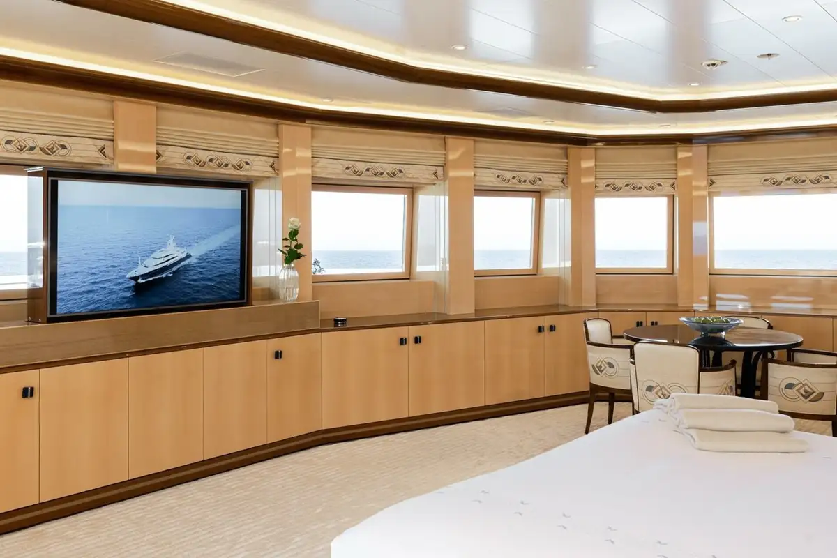 Twin 4,860hp MTU diesel engines give her a top speed of 19 knots, a cruising speed of 13 knots and a transatlantic range of 6,000nm. Retractable Rolls-Royce stabilisers provide comfort at anchor and underway.
