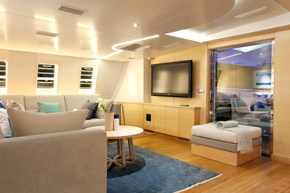 As well as the flybridge lounge, guests can dine outside on the shaded main deck aft and lounge inside in air conditioned splendour opposite the fully equipped bar. At night watch movies under the stars with the yacht's outside projector.