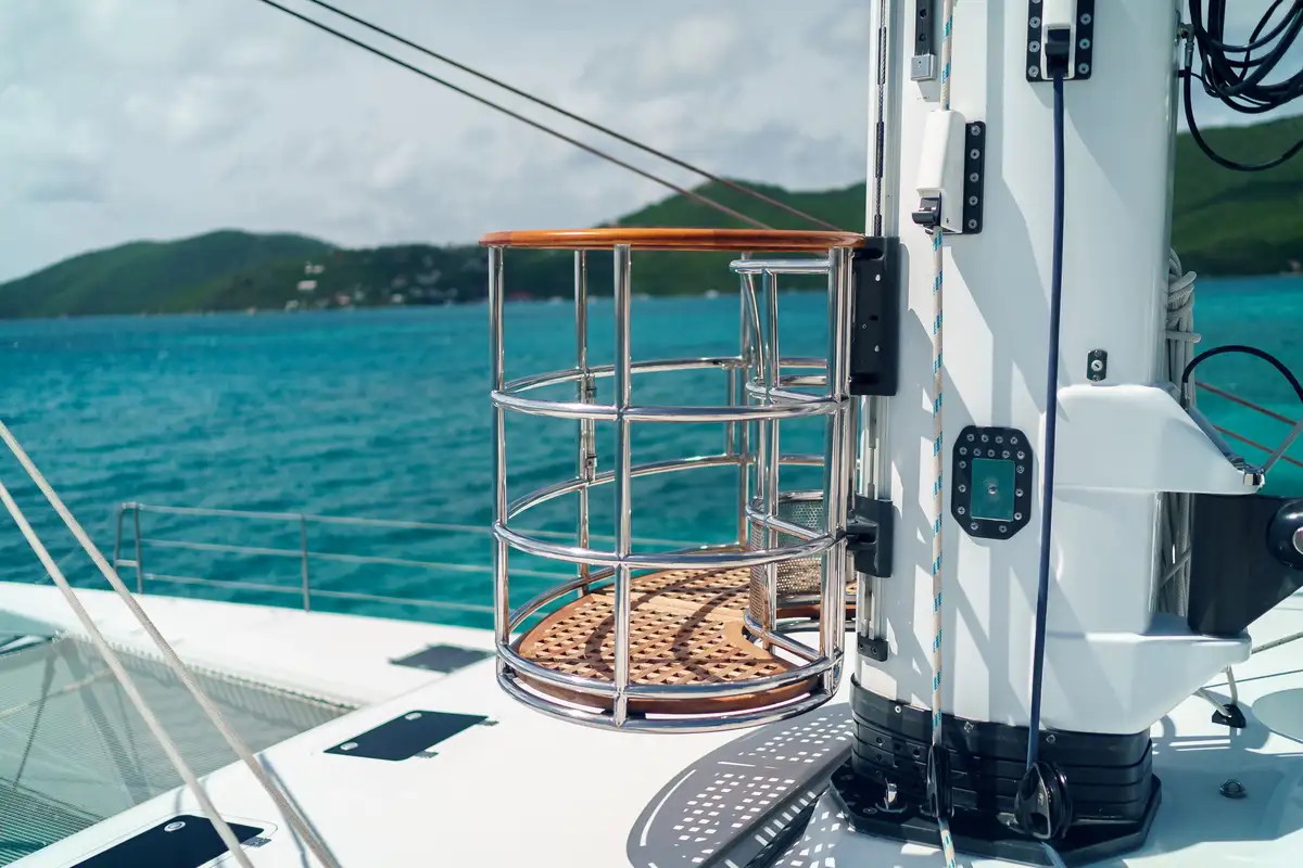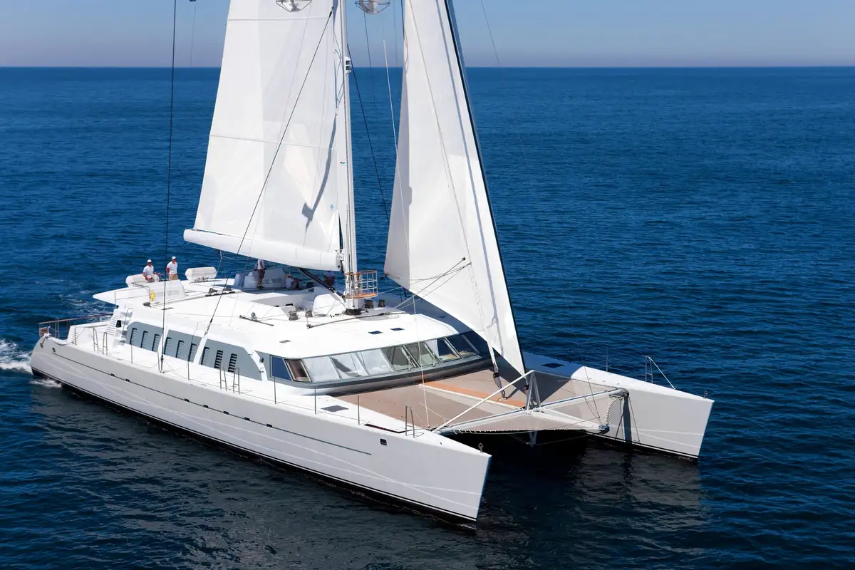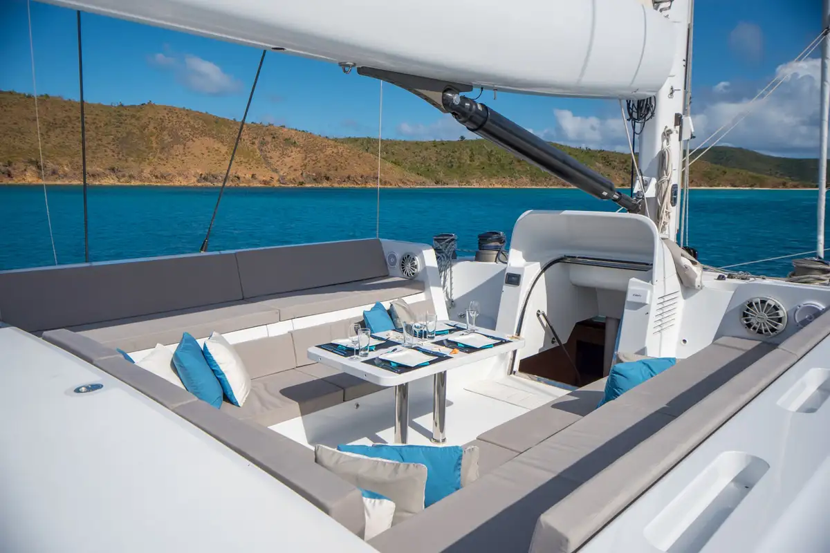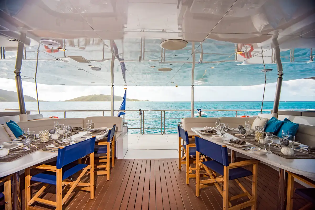 At anchor a removable awning shades the flybridge lounge for lunch with a view then you can walk aft and dive off the springboard into gin clear seas. Twin swim platforms make it easy to get back on board then you can ride the crow's nest up the mast for bird's eye views from 30m above the anchorage.