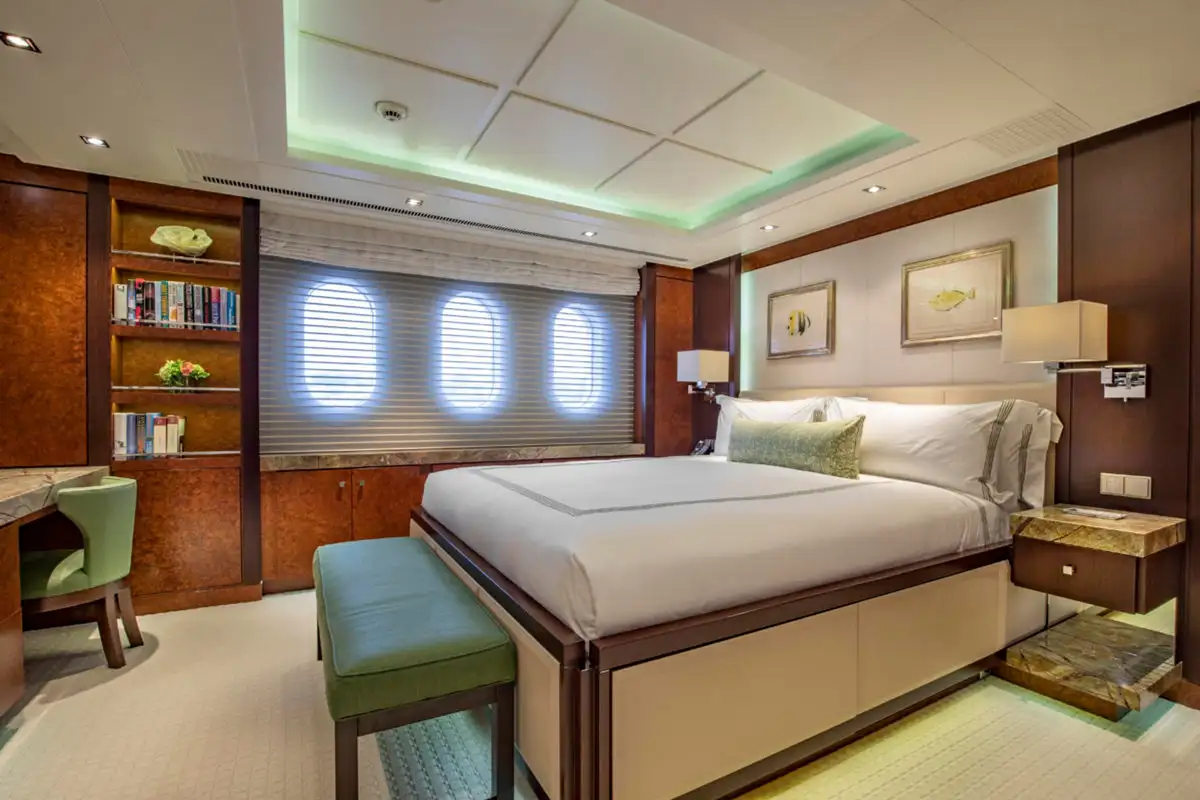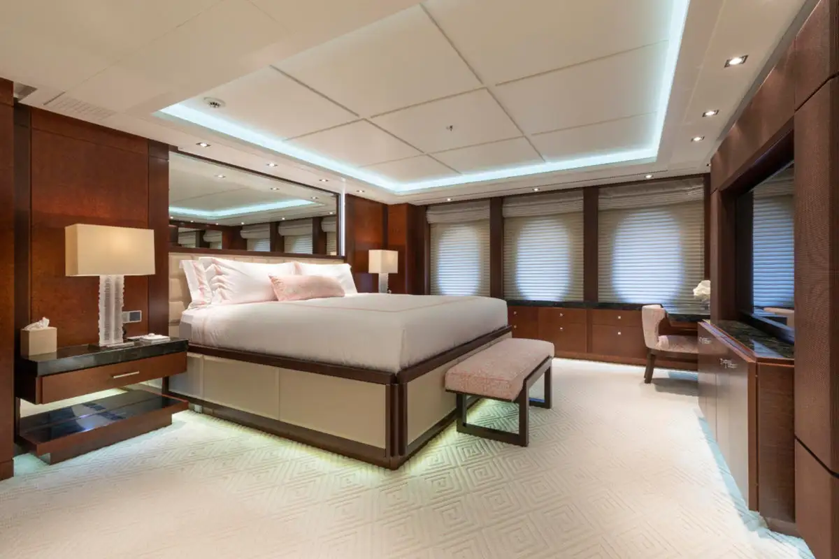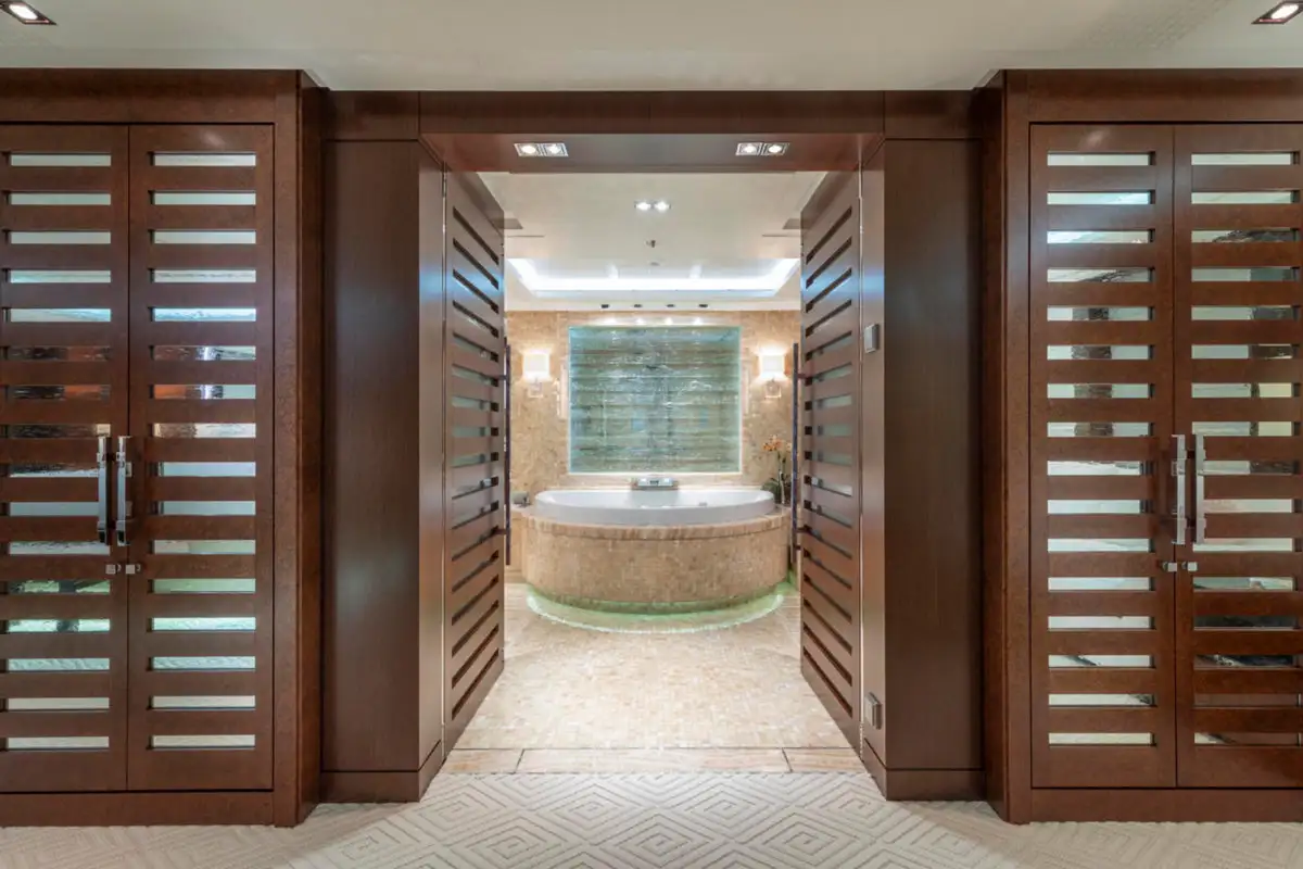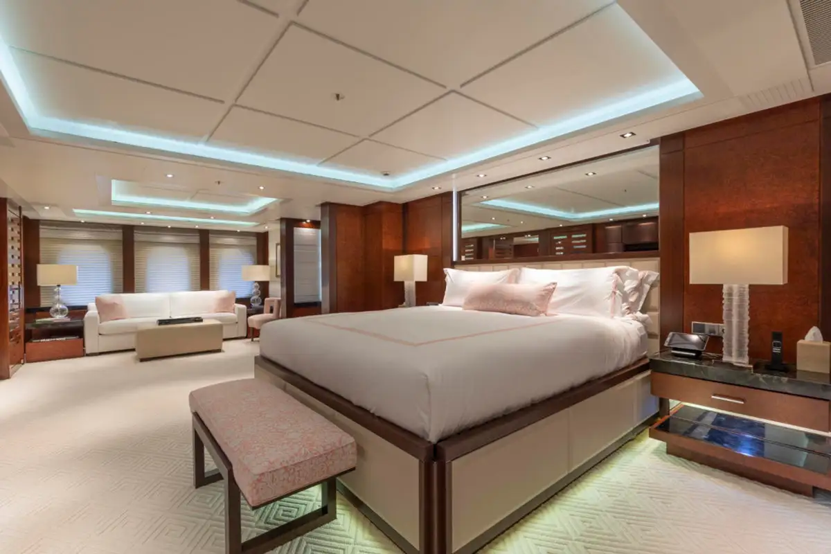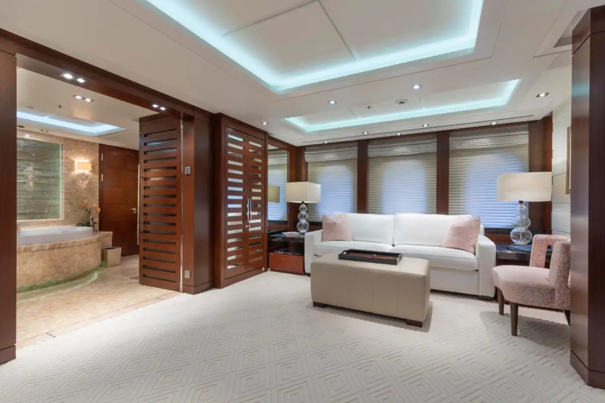 Ahead of the lounge, the master suite is a sanctuary of privacy and refinement that spans the full beam of the main deck. It is designed for absolute comfort with a secluded private office, a sumptuous lounge, and a king-sized berth. The en suite bathroom, complete with a bath and dressing room, ensures a sense of indulgence from the moment you step inside.