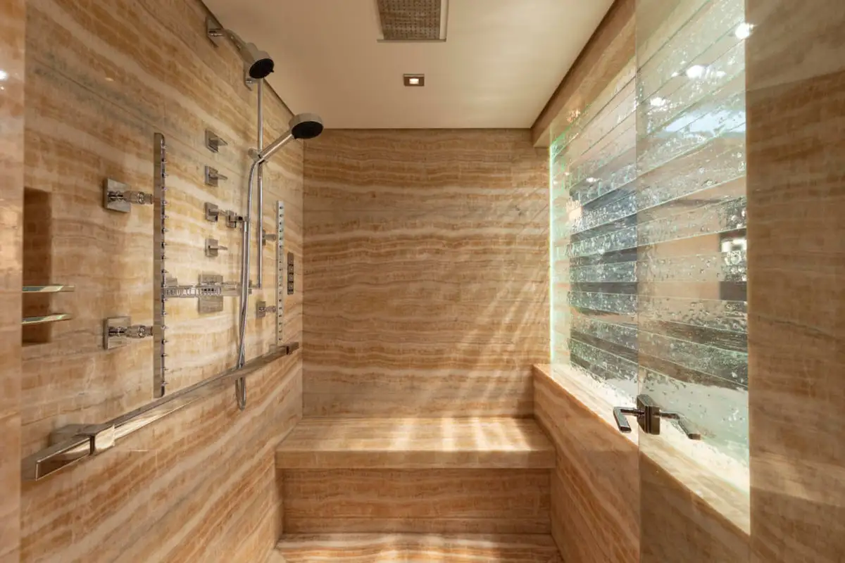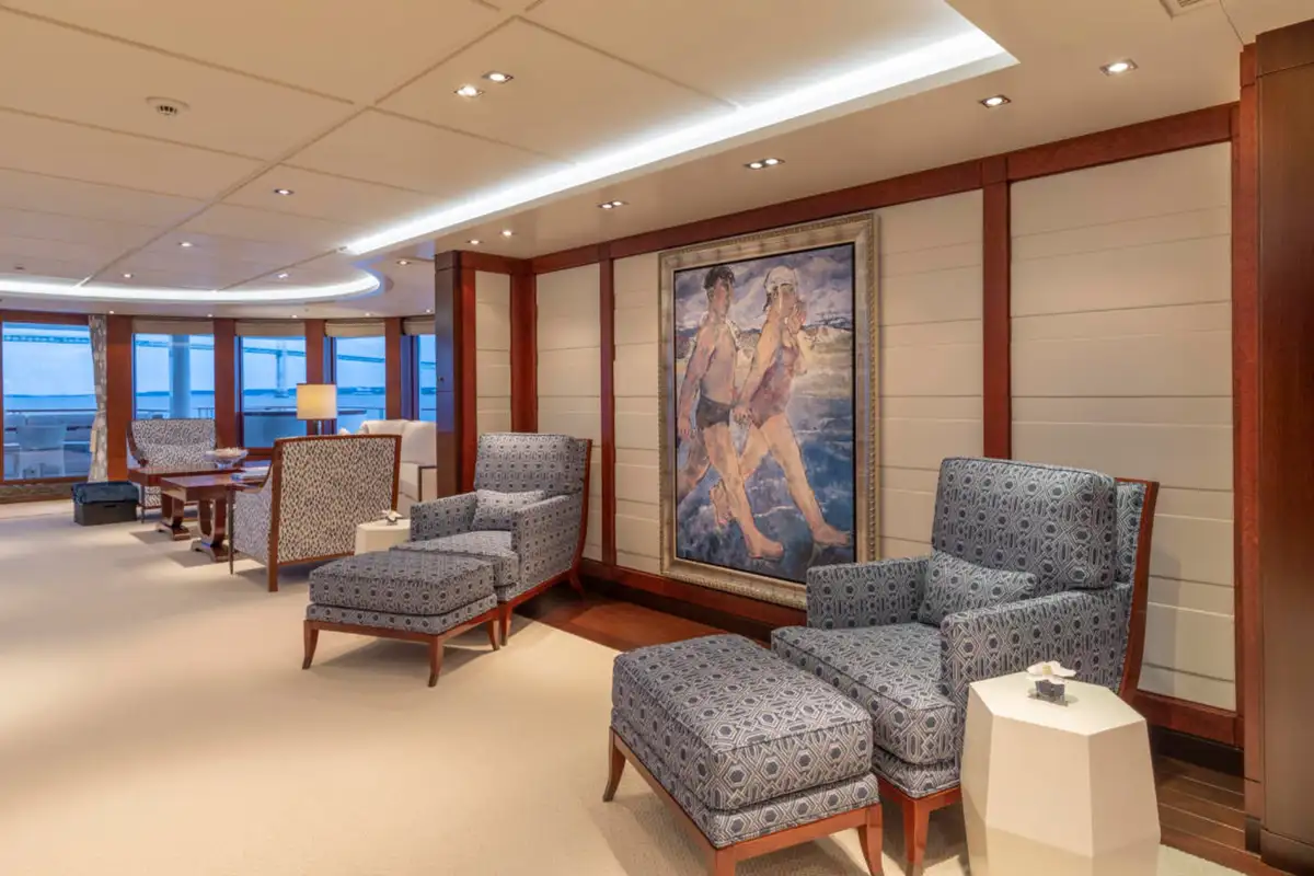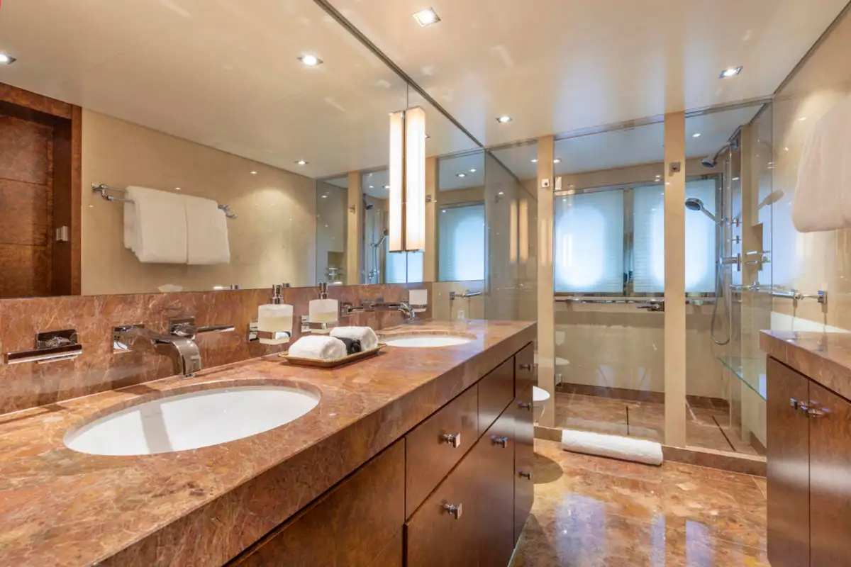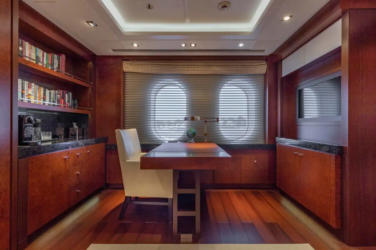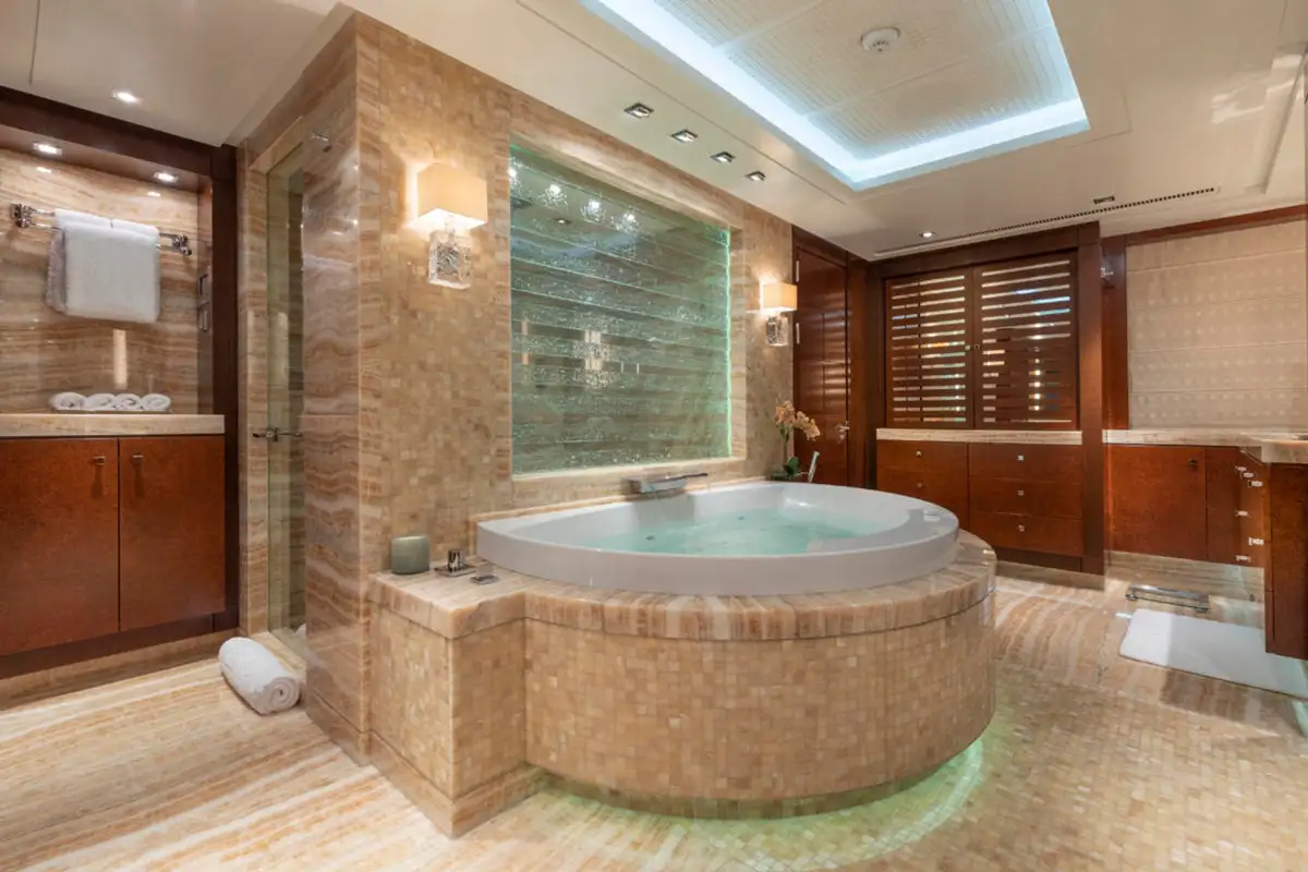 Ahead of the lounge, the master suite is a sanctuary of privacy and refinement that spans the full beam of the main deck. It is designed for absolute comfort with a secluded private office, a sumptuous lounge, and a king-sized berth. The en suite bathroom, complete with a bath and dressing room, ensures a sense of indulgence from the moment you step inside.