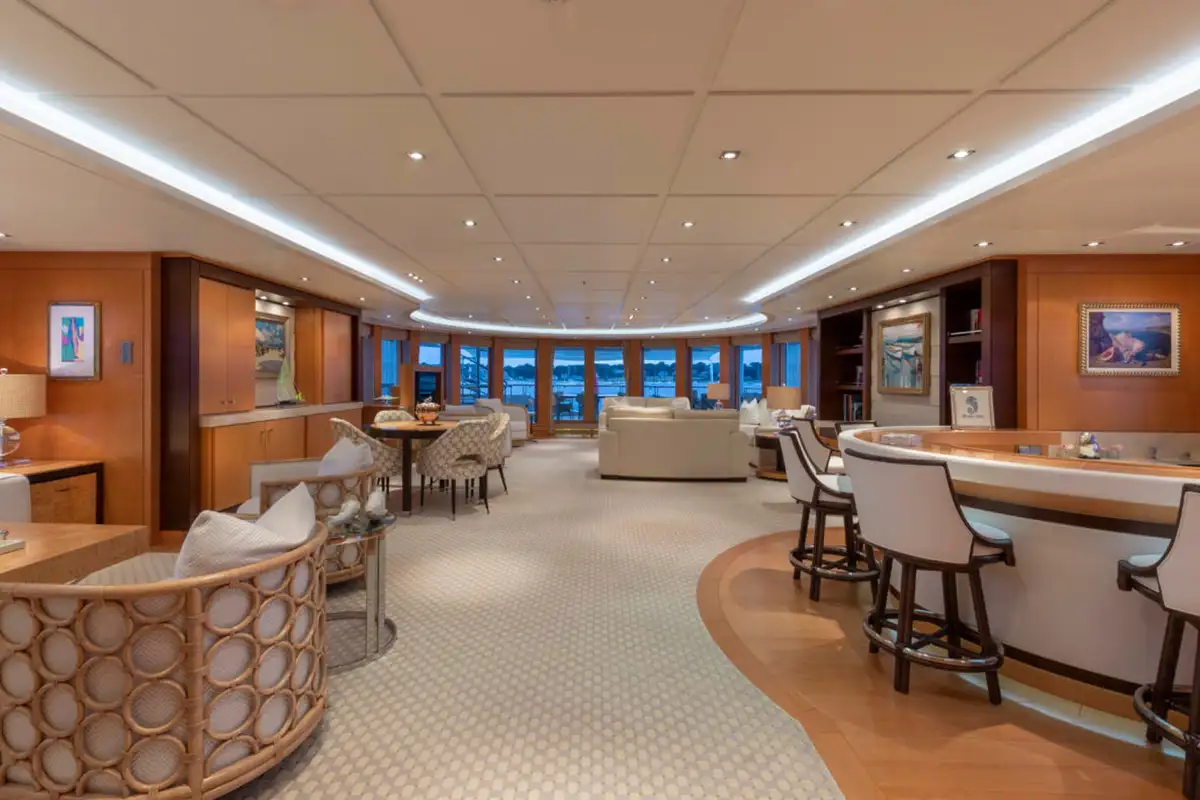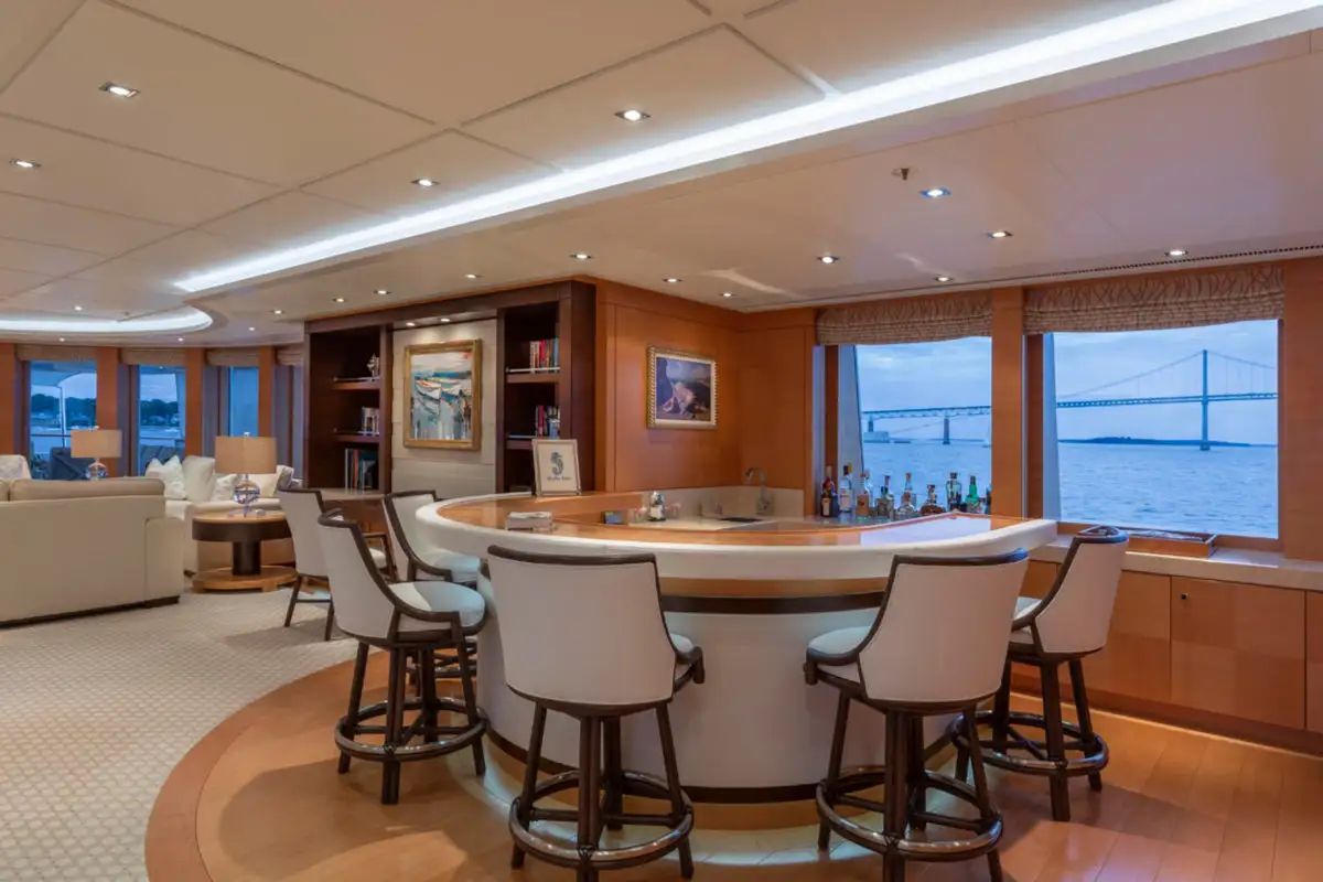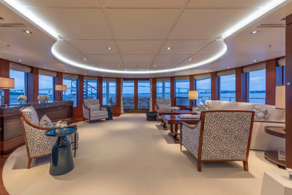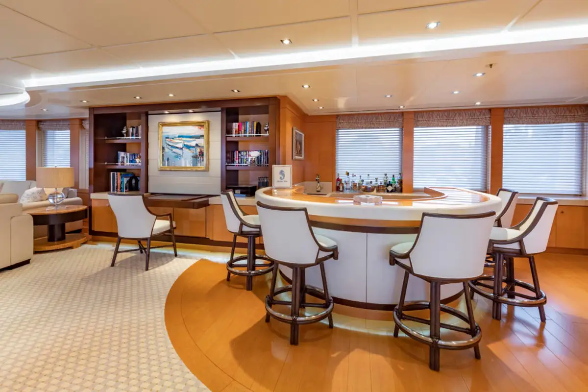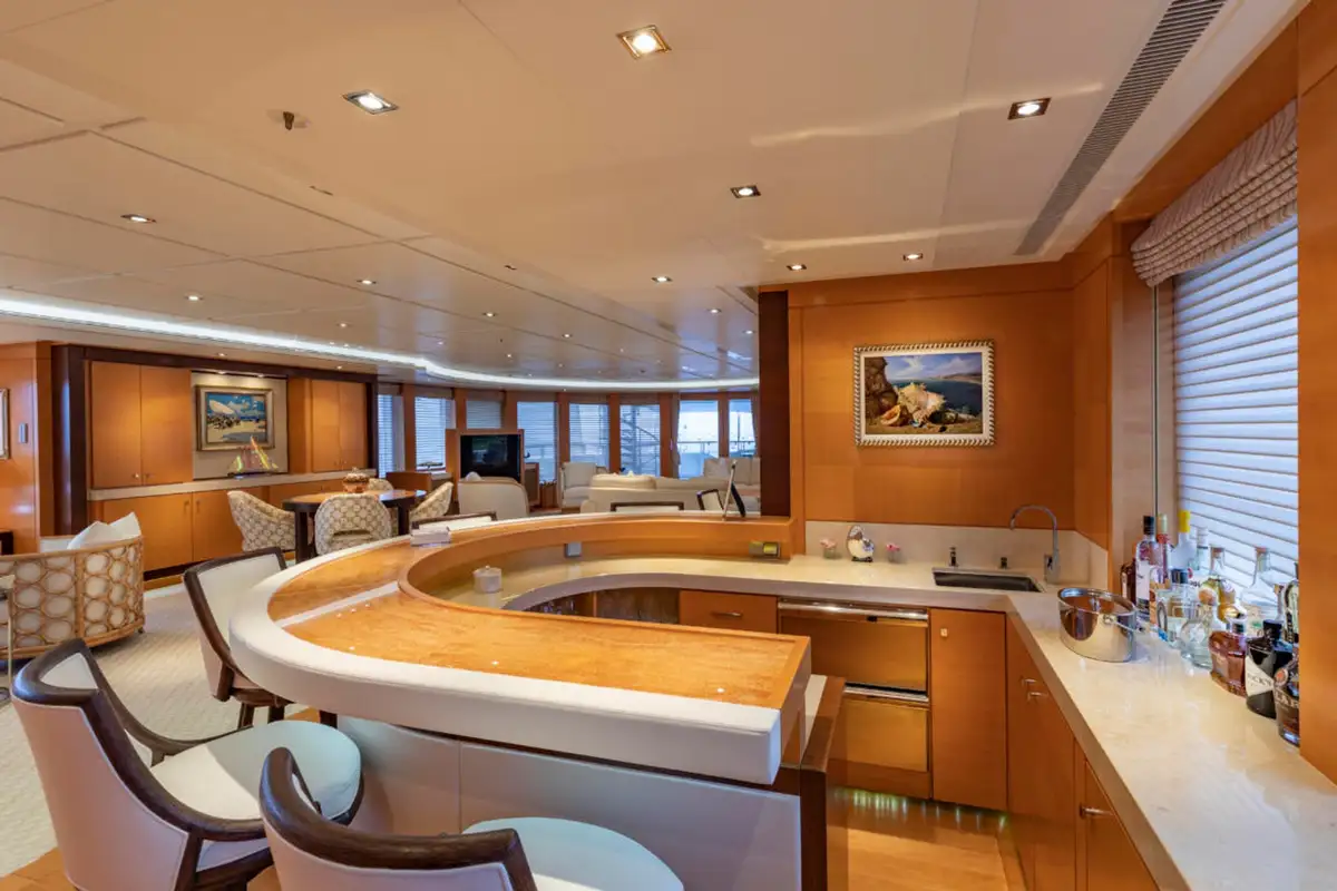 Guests are also treated to luxurious suites, with two en suite double suites and two twin-berth suites on the lower deck. The VIP suite on the upper deck offers an additional layer of exclusivity, complemented by the light-filled sky lounge, where a semi-circular bar and plush furnishings provide the perfect setting for relaxed gatherings.