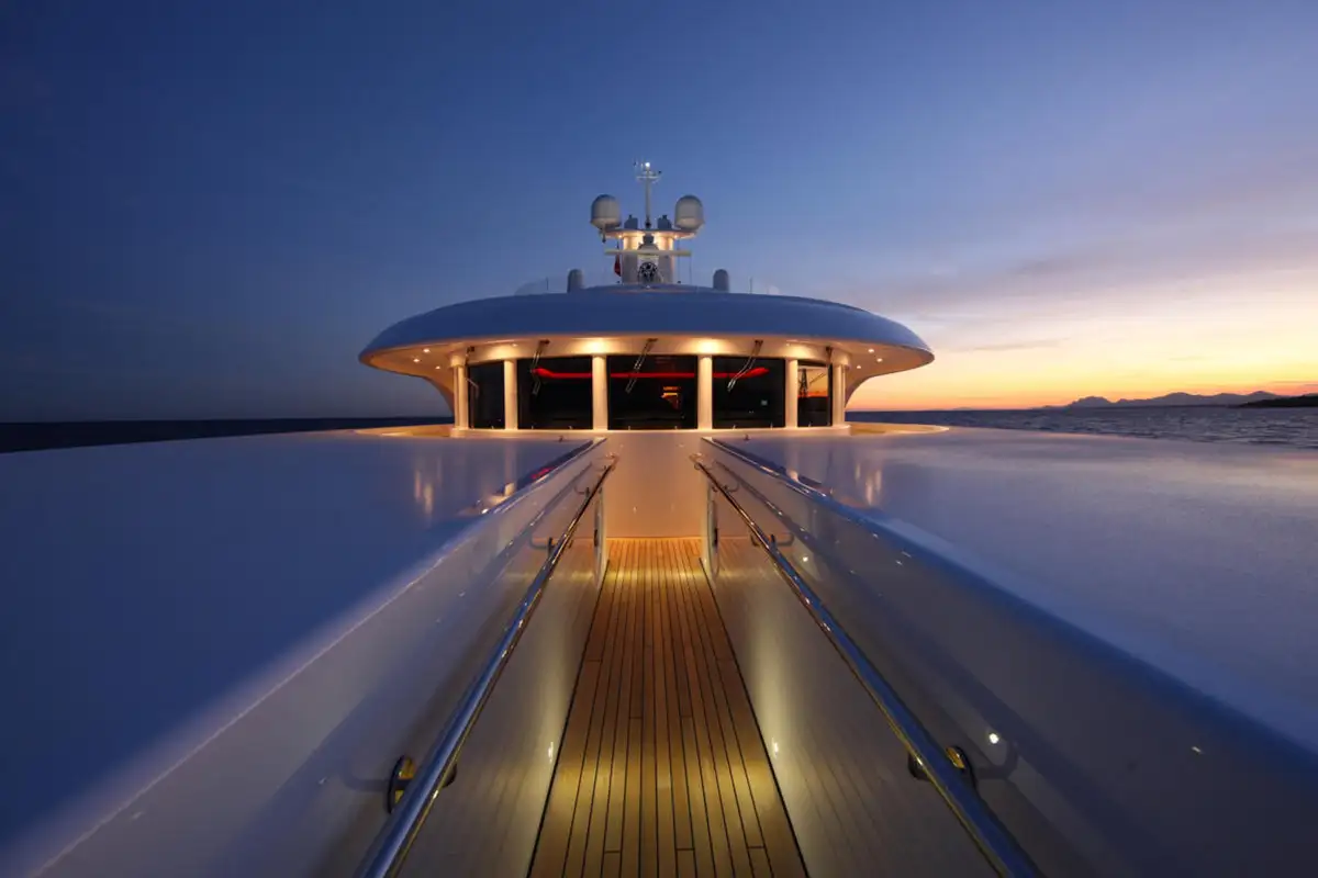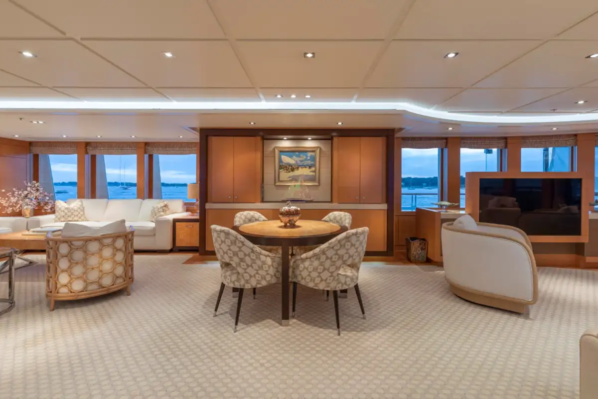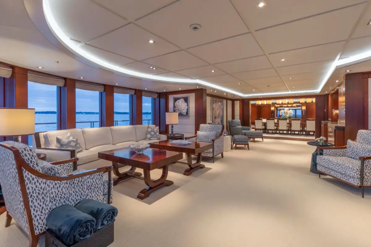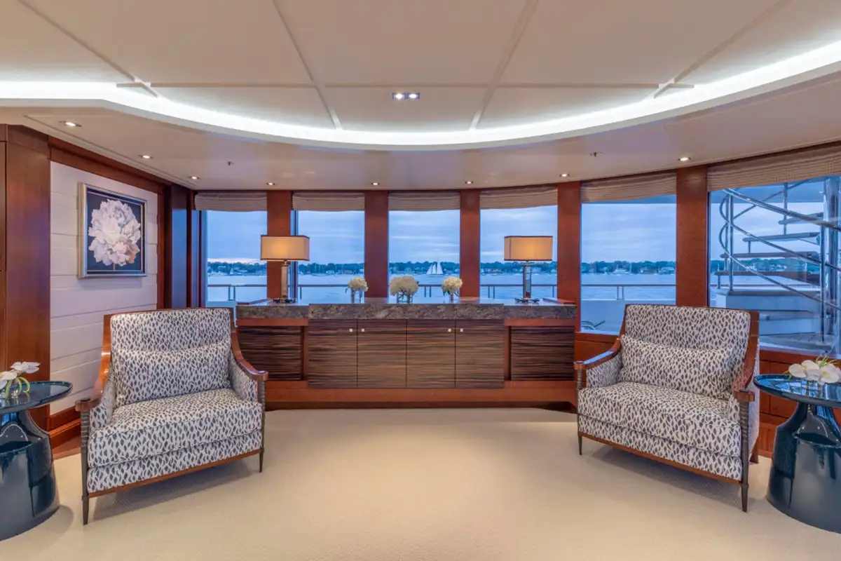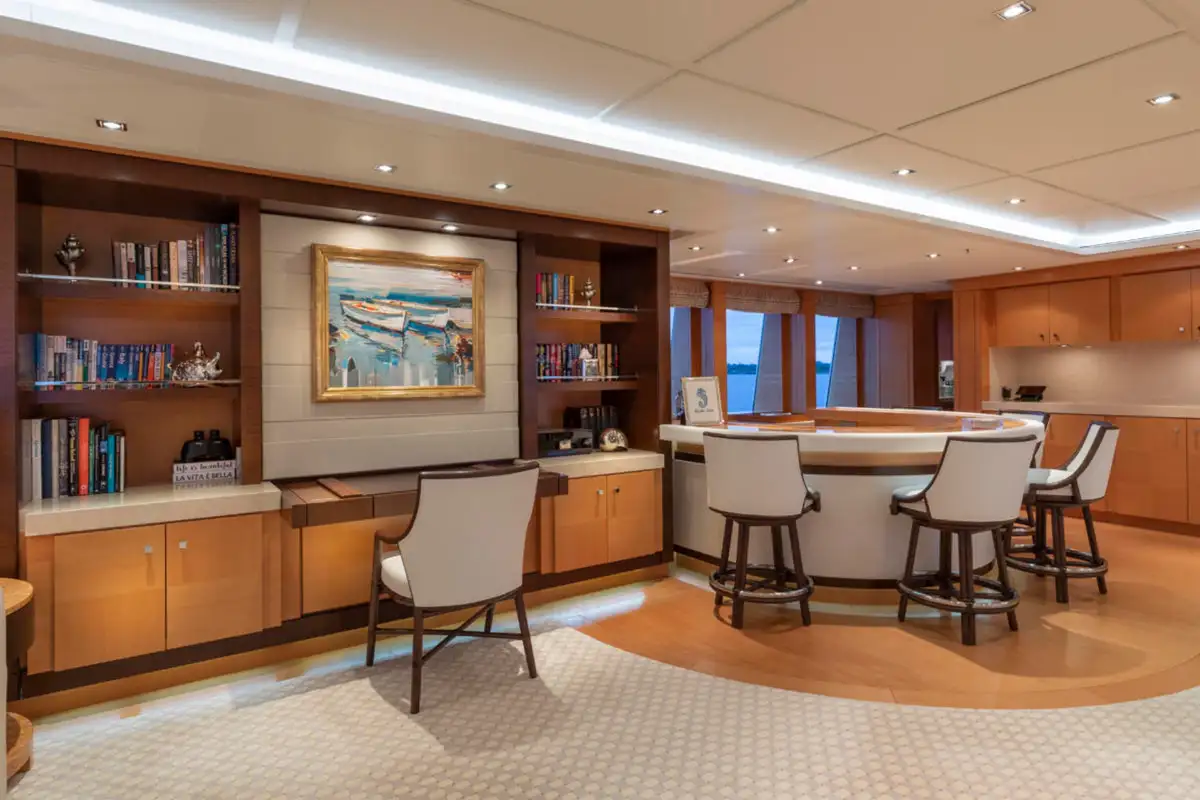 Guests are also treated to luxurious suites, with two en suite double suites and two twin-berth suites on the lower deck. The VIP suite on the upper deck offers an additional layer of exclusivity, complemented by the light-filled sky lounge, where a semi-circular bar and plush furnishings provide the perfect setting for relaxed gatherings.