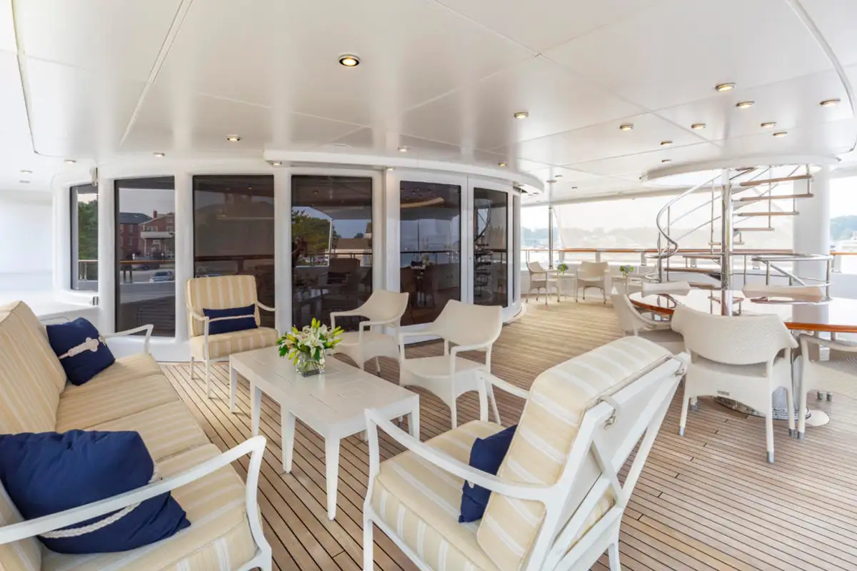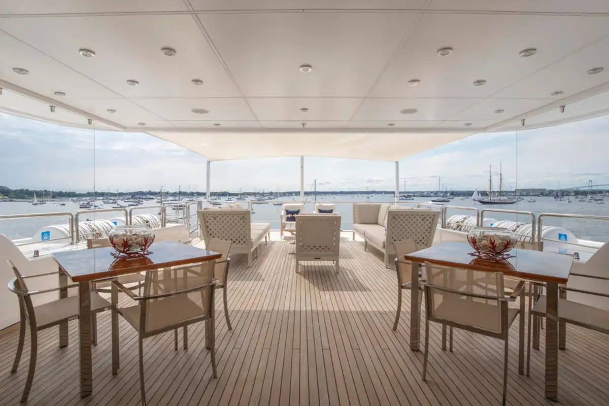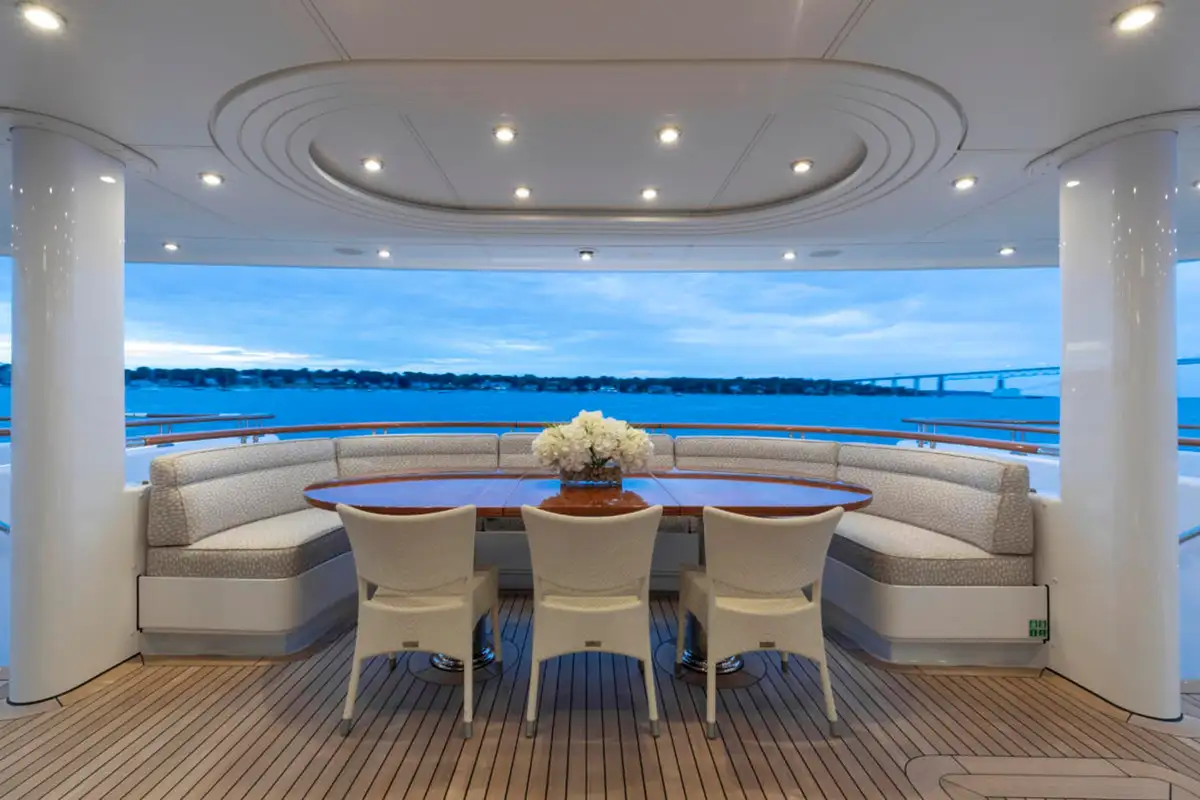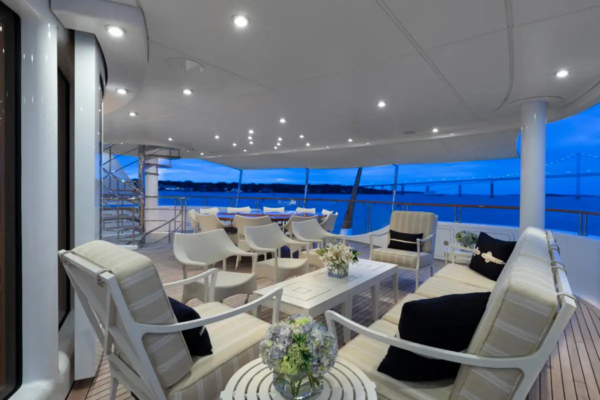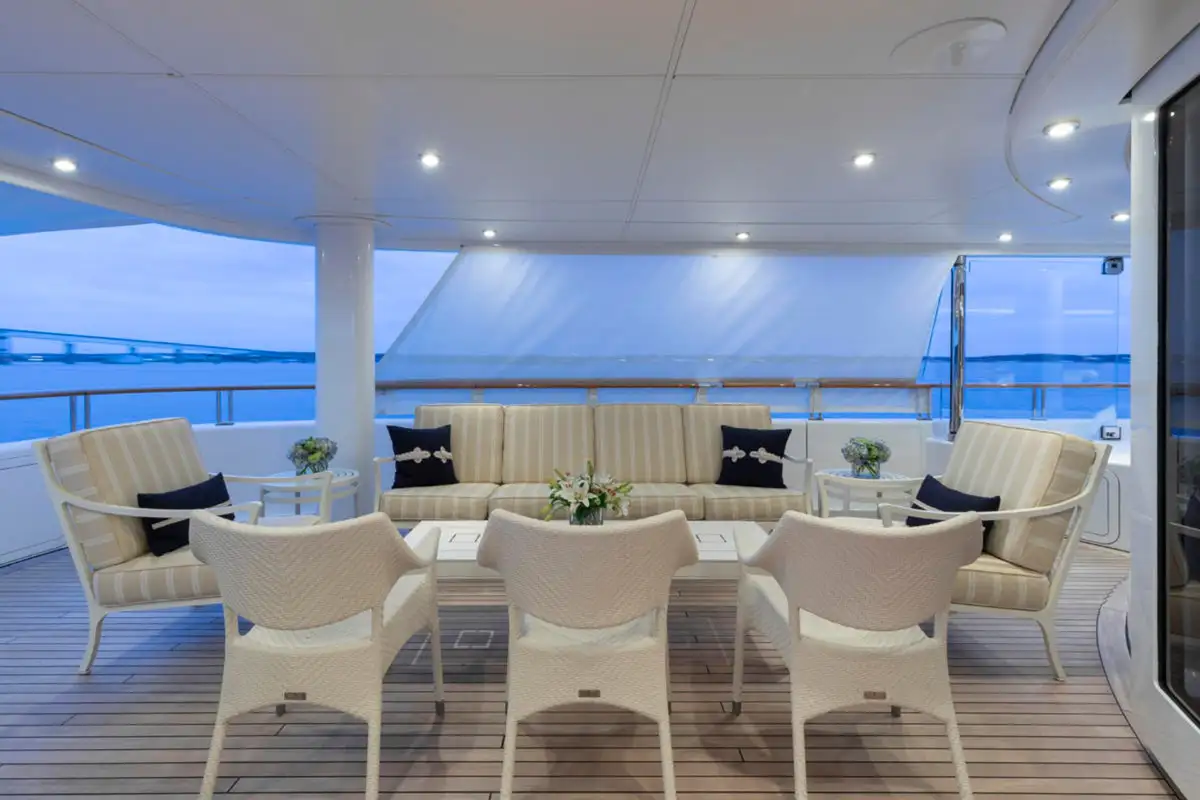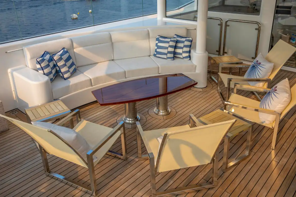 Outdoor spaces are as inviting as the interiors. The upper aft deck features a beautifully al fresco lounge to port and a dining area to starboard, offering spectacular ocean views with every meal.