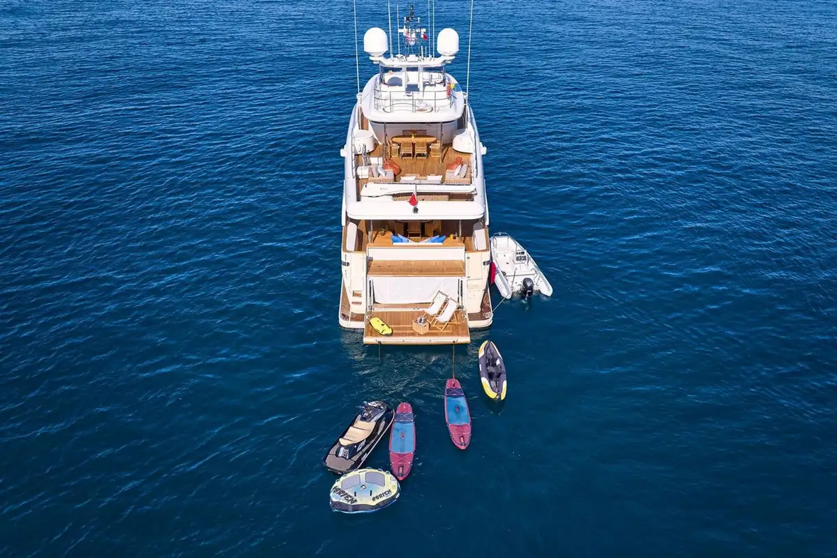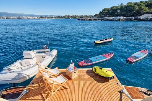 When the anchor goes down and the toys come out, she’s extremely well equipped. There’s a large RIB for wakeboarding and inflatable tows, plus a nimble jetski and a three-seat Waverunner, a SeaBob, paddleboards and more. An 11m (36ft) chase boat is available on request to expand the horizons of your cruise.