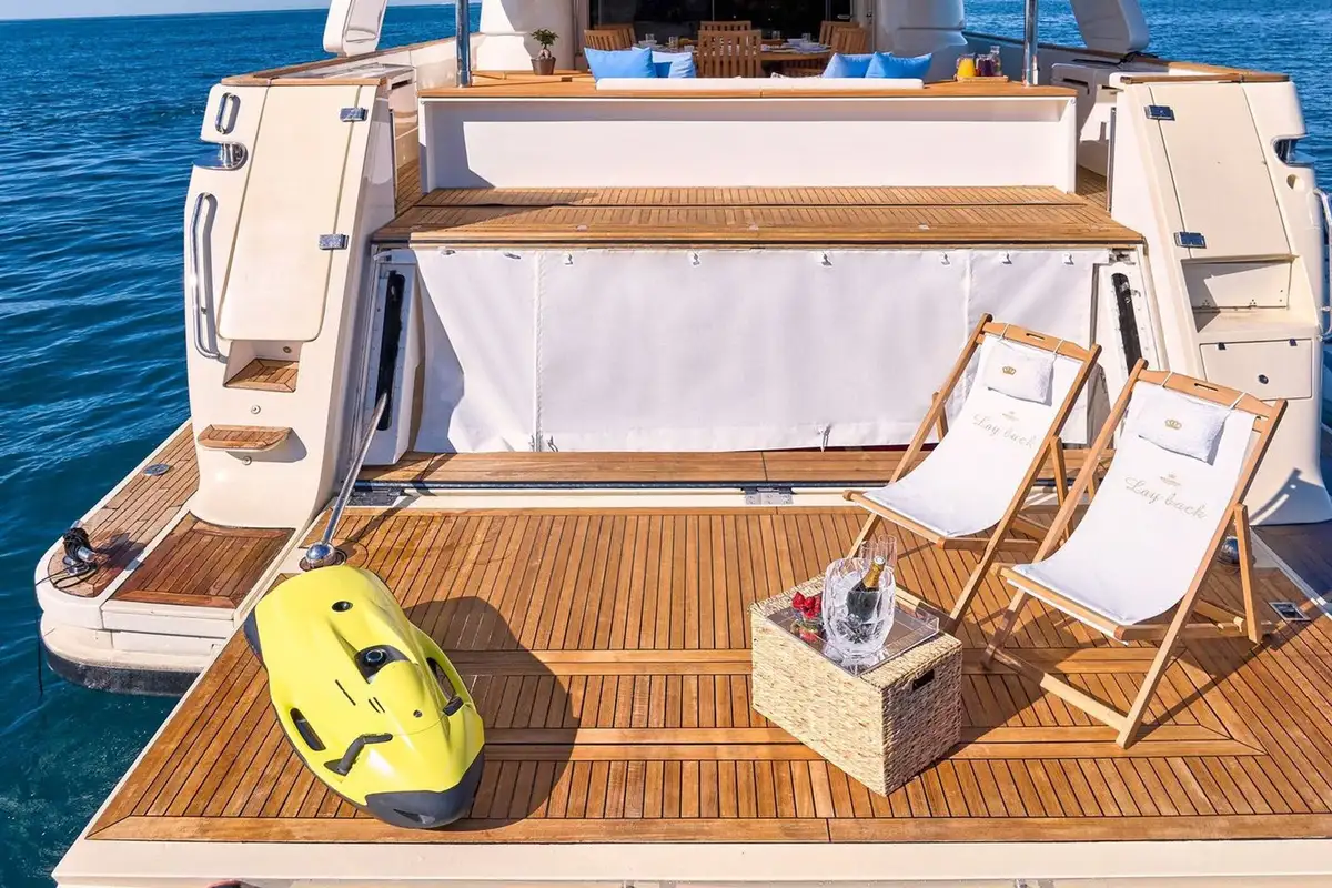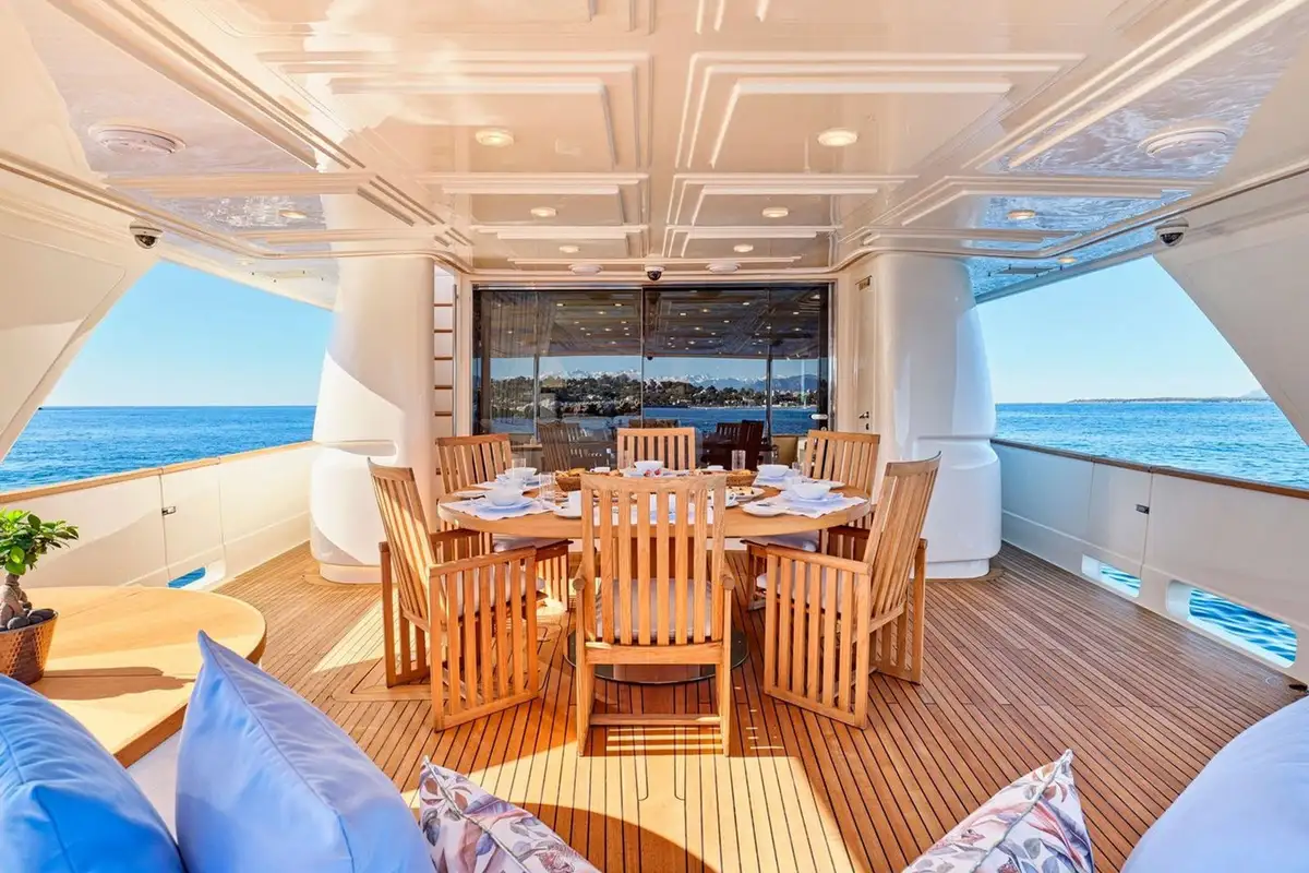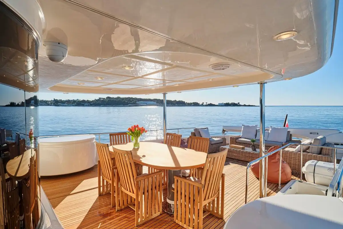 The sundeck has a spacious yet snug and intimate open-air lounge with plenty of day beds and a raised jacuzzi pool astern. One level down, the upper aft deck is an versatile area with a stylish al fresco dining area in ample shade and an expansive open deck astern where gym machines can be set up for your daily workout, and classic teak sun loungers invite you to recline. There are also two separate double sun beds on different levels of the foredeck plus a very large main deck aft cockpit and an extended bathing platform, thus a nice variety of outside spaces on board.