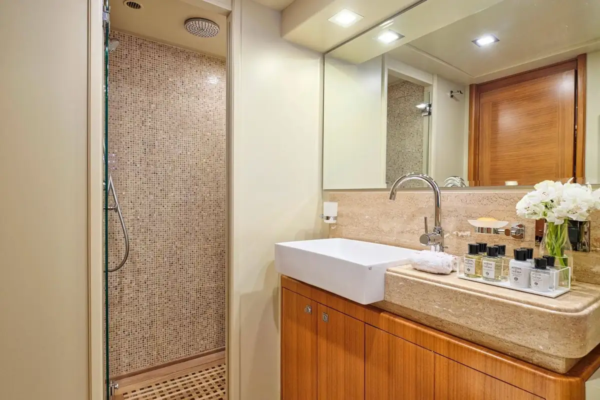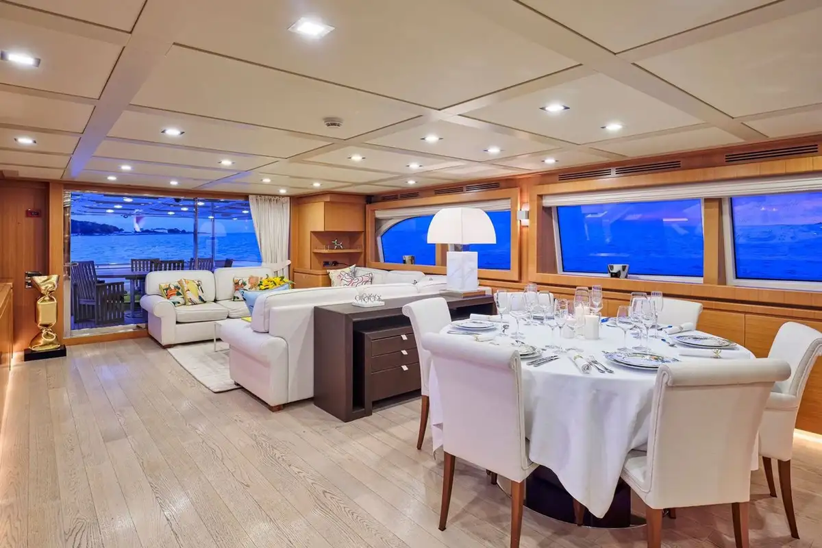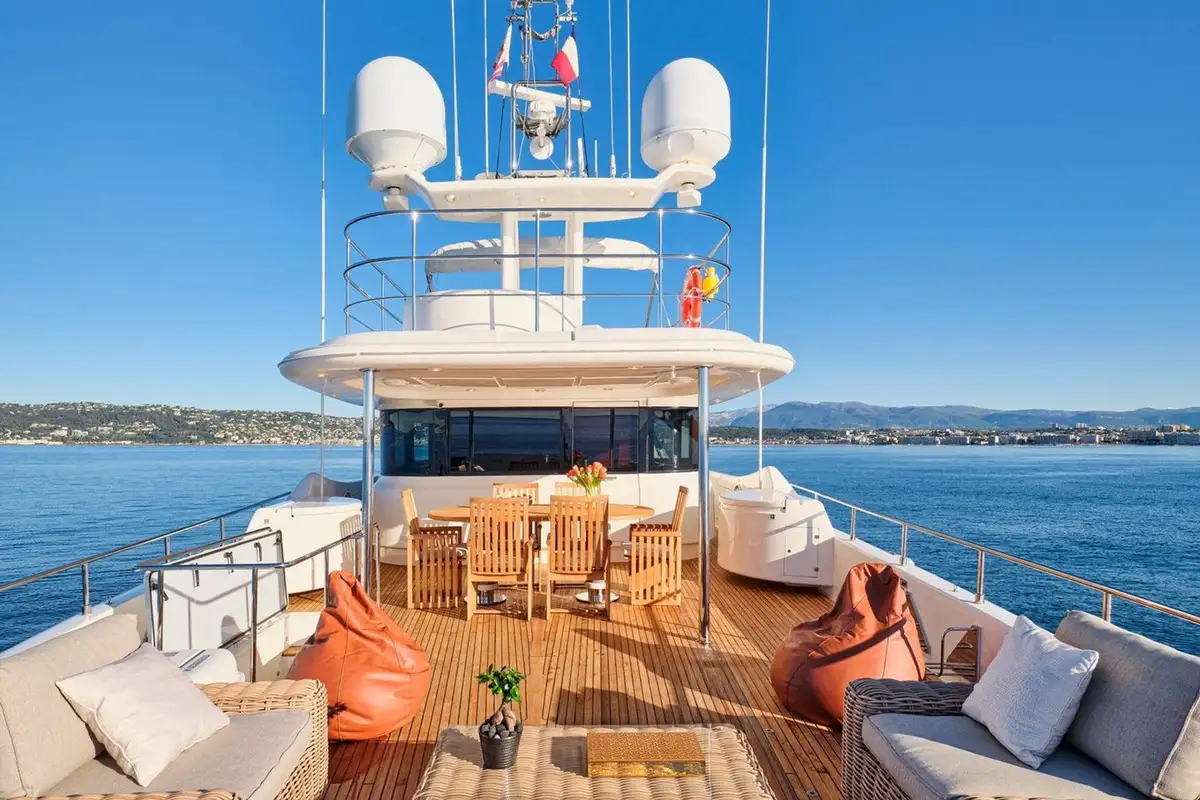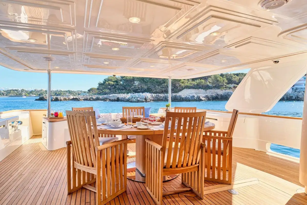 The sundeck has a spacious yet snug and intimate open-air lounge with plenty of day beds and a raised jacuzzi pool astern. One level down, the upper aft deck is an versatile area with a stylish al fresco dining area in ample shade and an expansive open deck astern where gym machines can be set up for your daily workout, and classic teak sun loungers invite you to recline. There are also two separate double sun beds on different levels of the foredeck plus a very large main deck aft cockpit and an extended bathing platform, thus a nice variety of outside spaces on board.