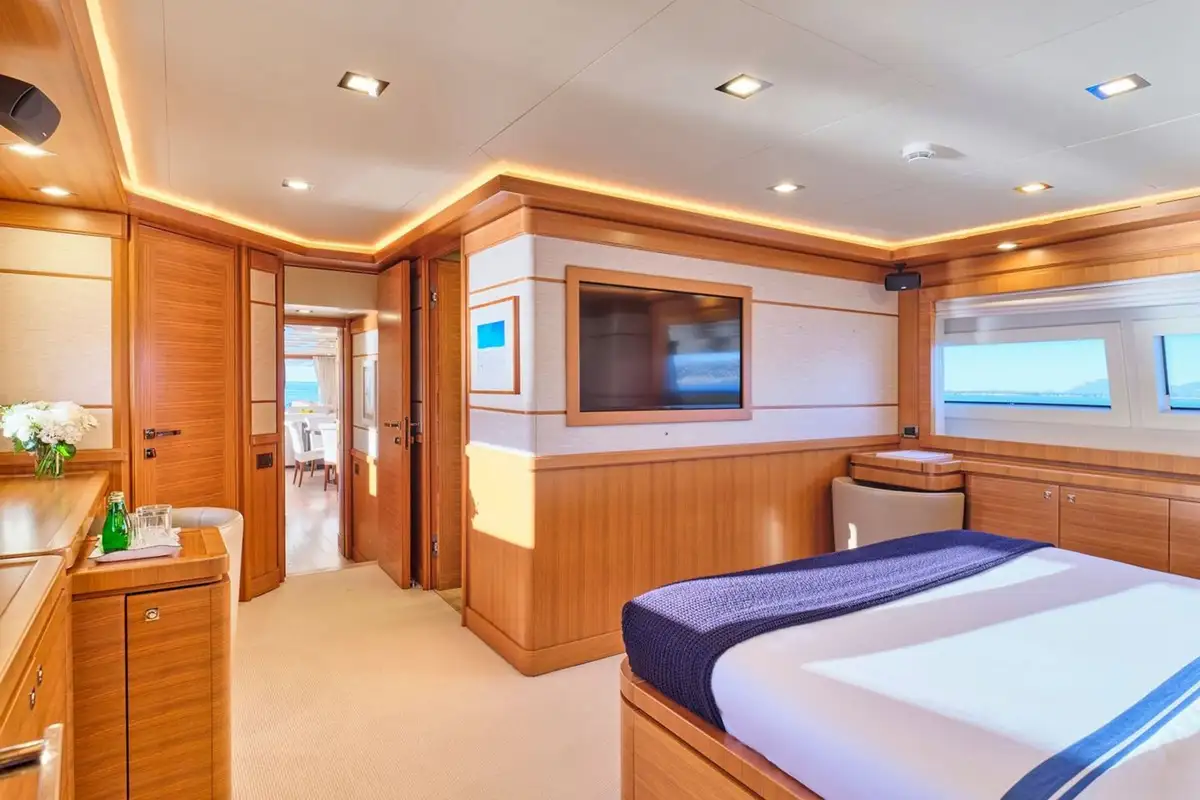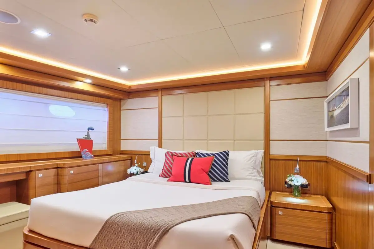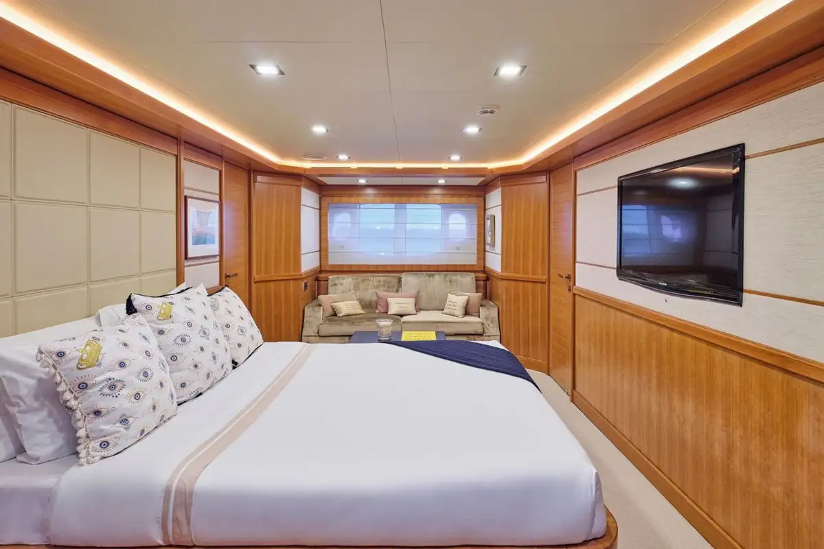 Designed to host up to 11 guests on board in a versatile and flexible five-cabin layout, she’s equally ideal for a family group or a charter shared between two couples. The spacious, full-beam master suite on the lower deck is as large and luxurious as the main deck master suite above. But her charm and style is an equally perfect fit for a romantic escape with a great abundance of luxury living space for just you and your partner to enjoy.