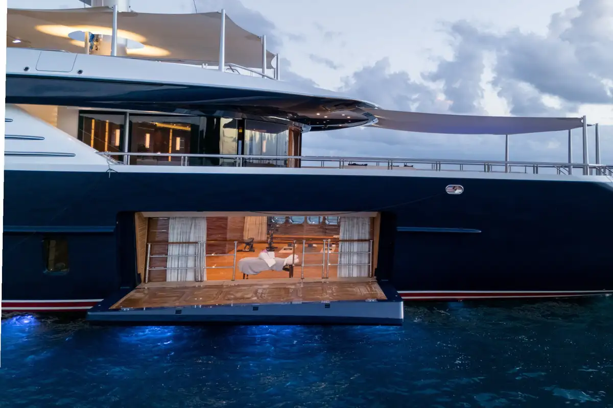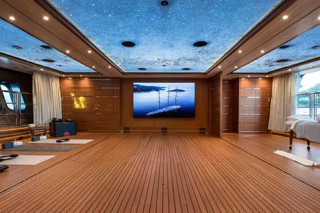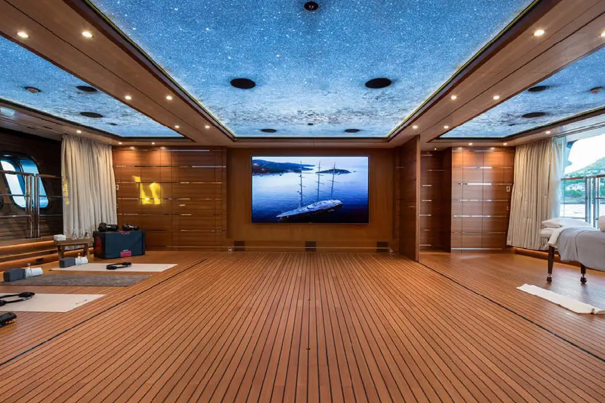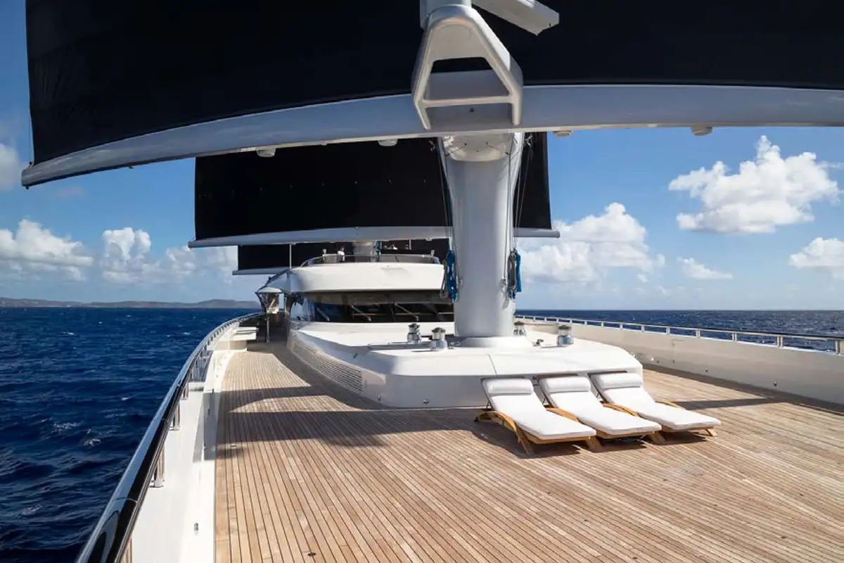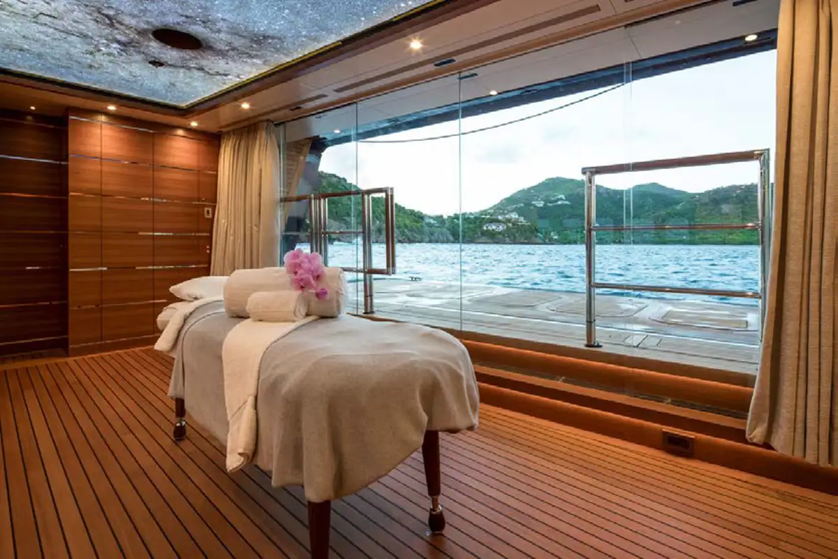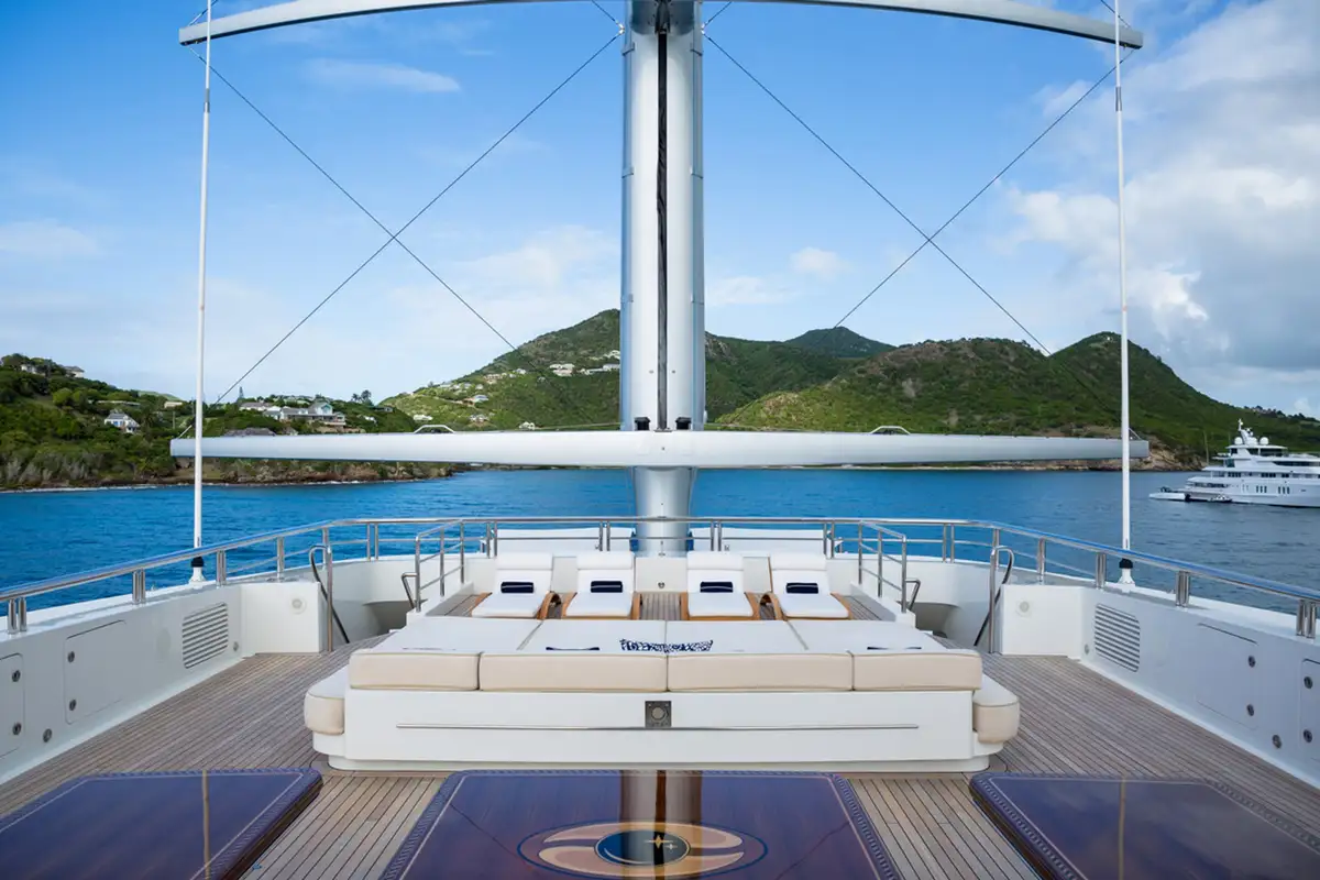 On the main deck aft, the floor of the counter-current pool rises to create a dancefloor, with a sound system to match. The lower deck wellness spa includes a sauna, steam room and beauty salon. Next door, her beach club, full beam with bar and sea terraces on both sides, serves numerous purposes: as a boarding area for her twin Pascoe custom tenders and an array of watertoys, gym, massage room, nightclub and cinema. For open-air cinema, the mizzen mast’s lowest sail unfurls to create a 14x9m cinema screen for the upper deck projector.