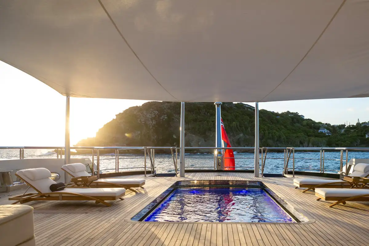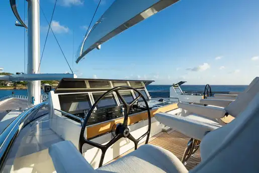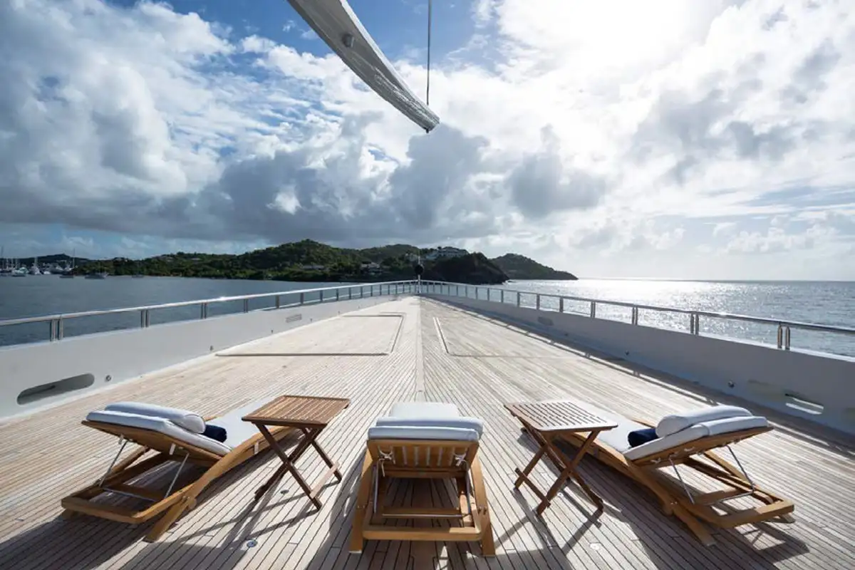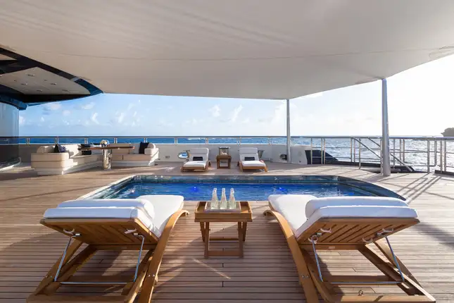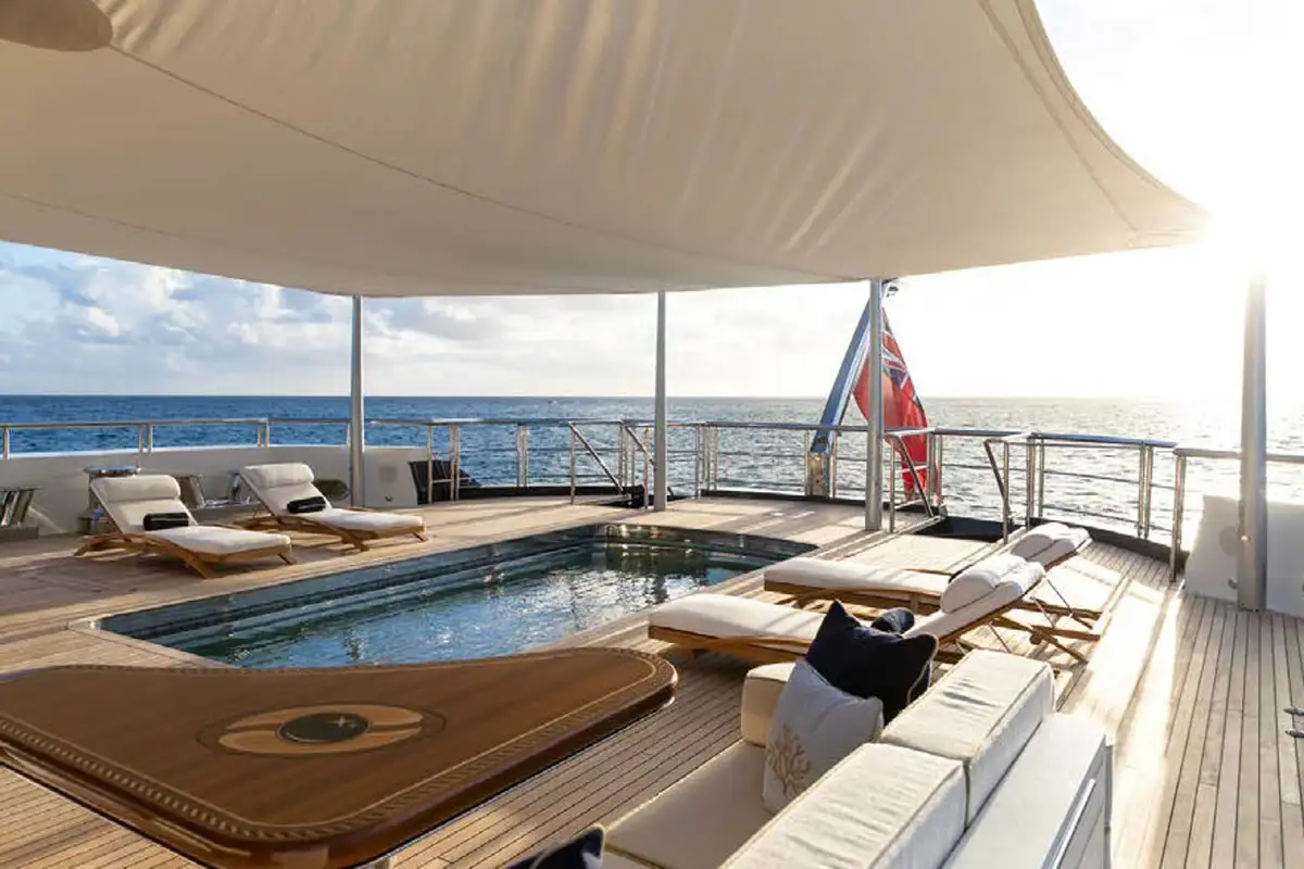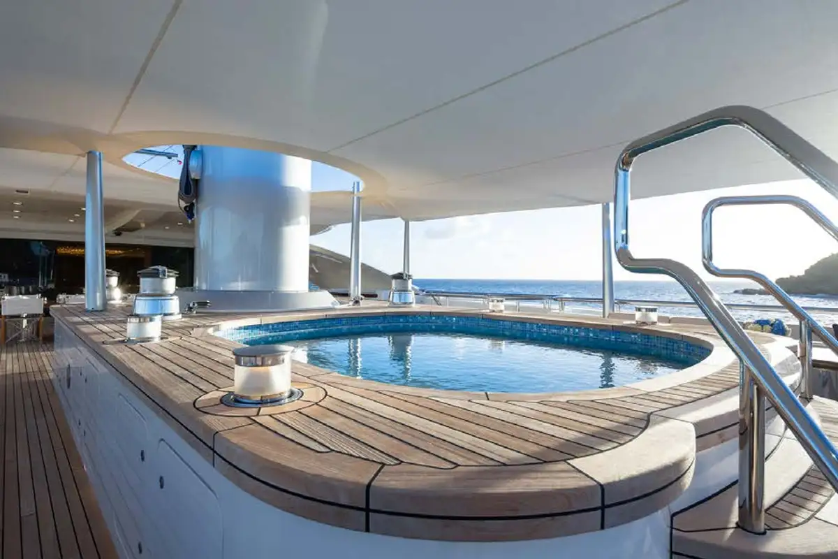On the main deck aft, the floor of the counter-current pool rises to create a dancefloor, with a sound system to match. The lower deck wellness spa includes a sauna, steam room and beauty salon. Next door, her beach club, full beam with bar and sea terraces on both sides, serves numerous purposes: as a boarding area for her twin Pascoe custom tenders and an array of watertoys, gym, massage room, nightclub and cinema. For open-air cinema, the mizzen mast’s lowest sail unfurls to create a 14x9m cinema screen for the upper deck projector.