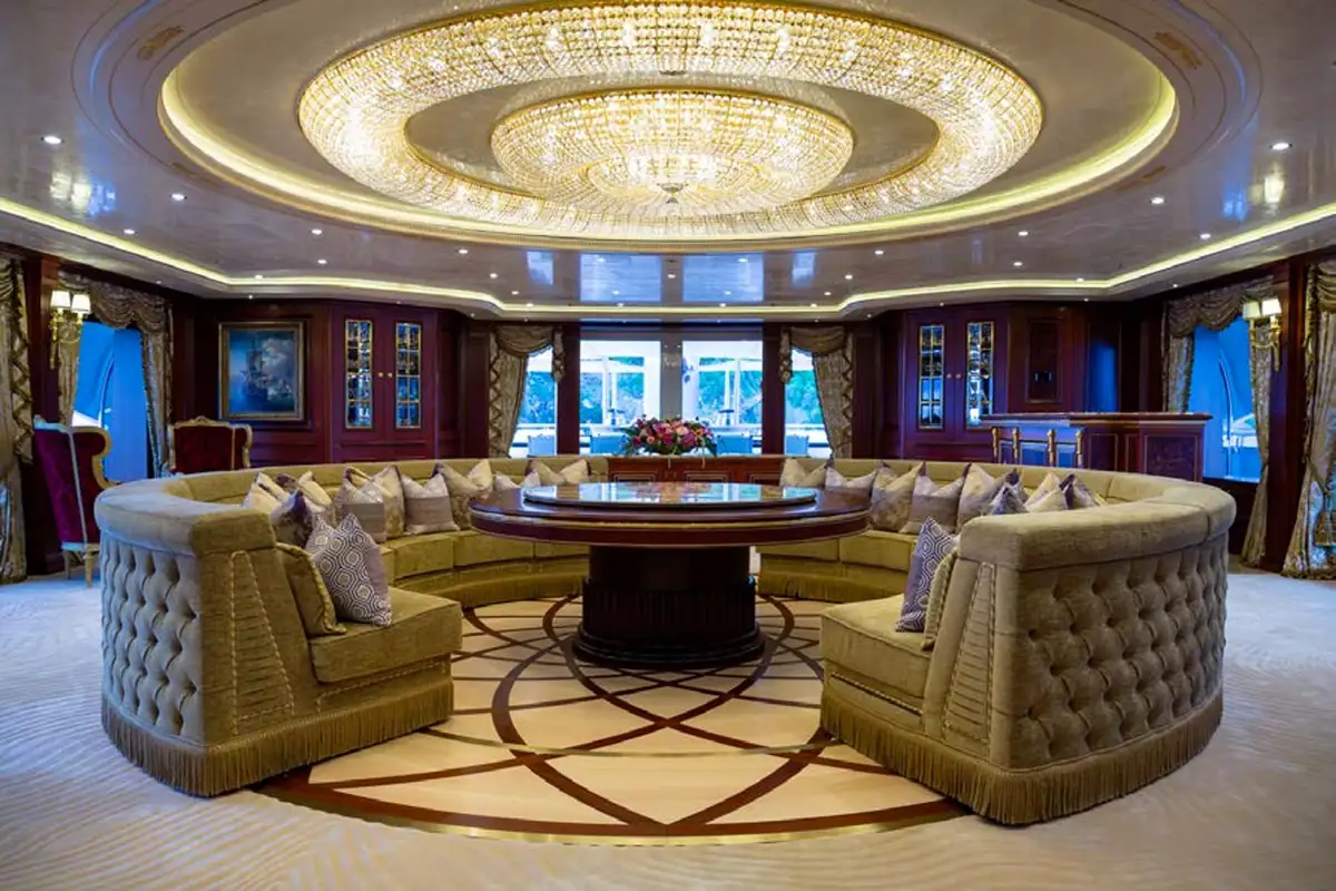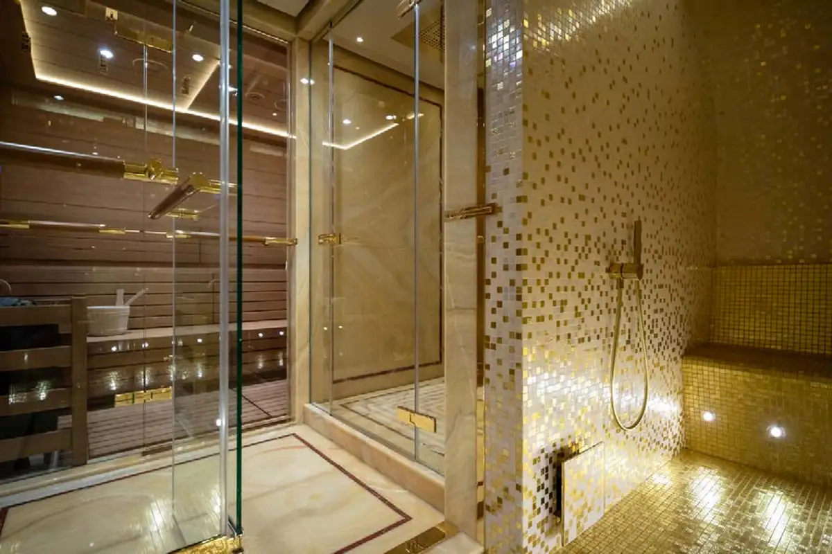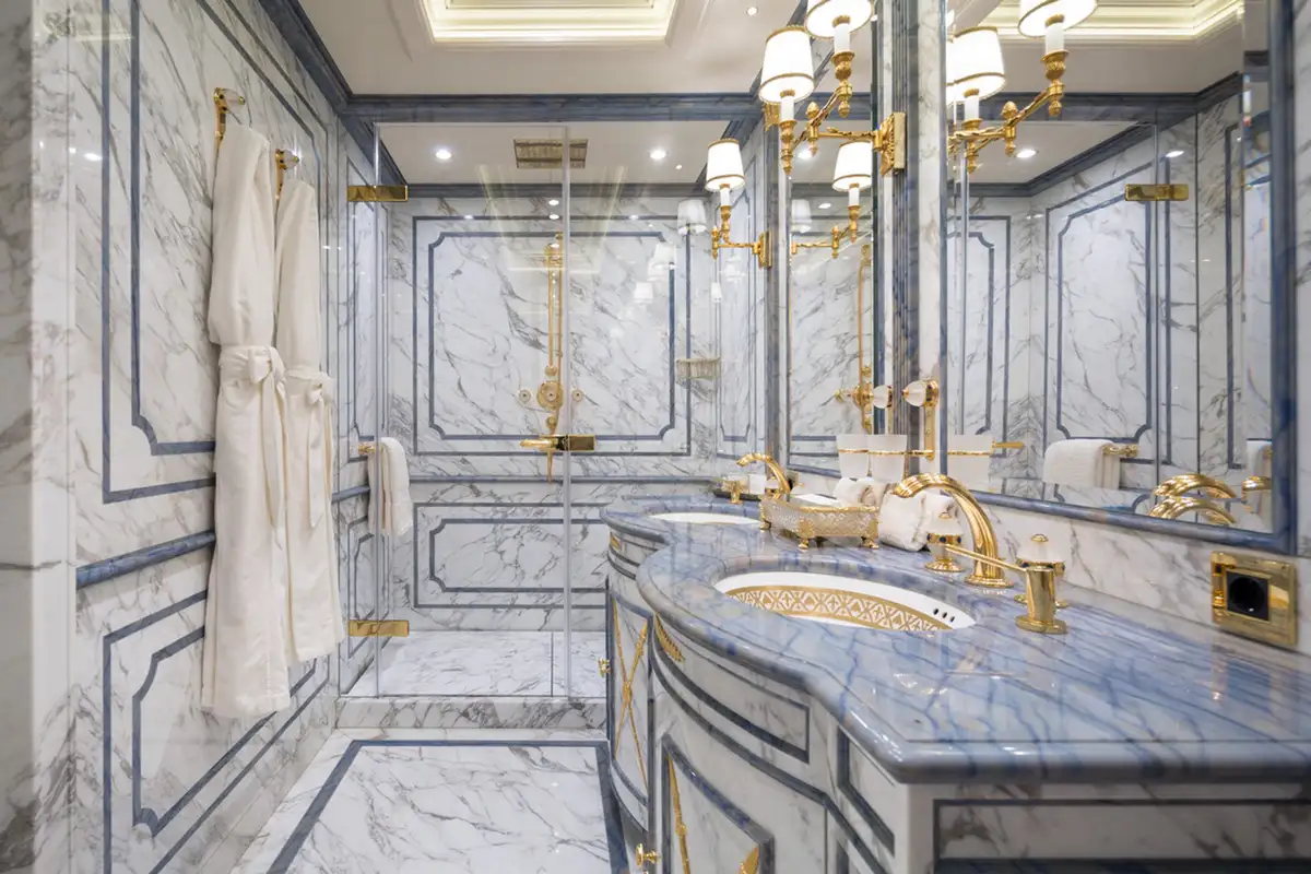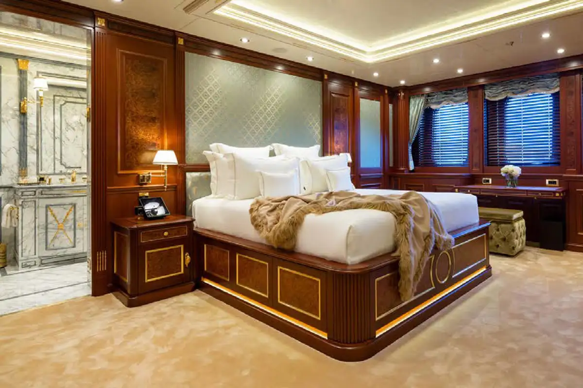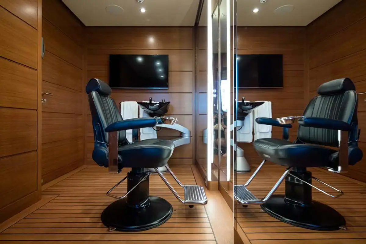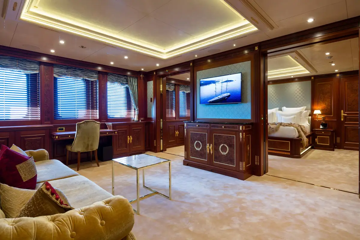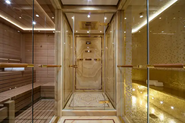 All guest suites for her 10 guests are on the lower deck, with step-free access to the wellness spa and beach club. The master suite is forward, full beam and vast, with his-and-hers en suites, one with a bath, the other a shower, his-and-hers dressing rooms and a private lounge. Two VIP suites each have a private lounge and a double cabin and a twin cabin.