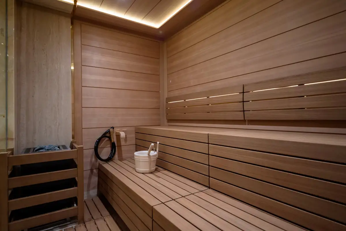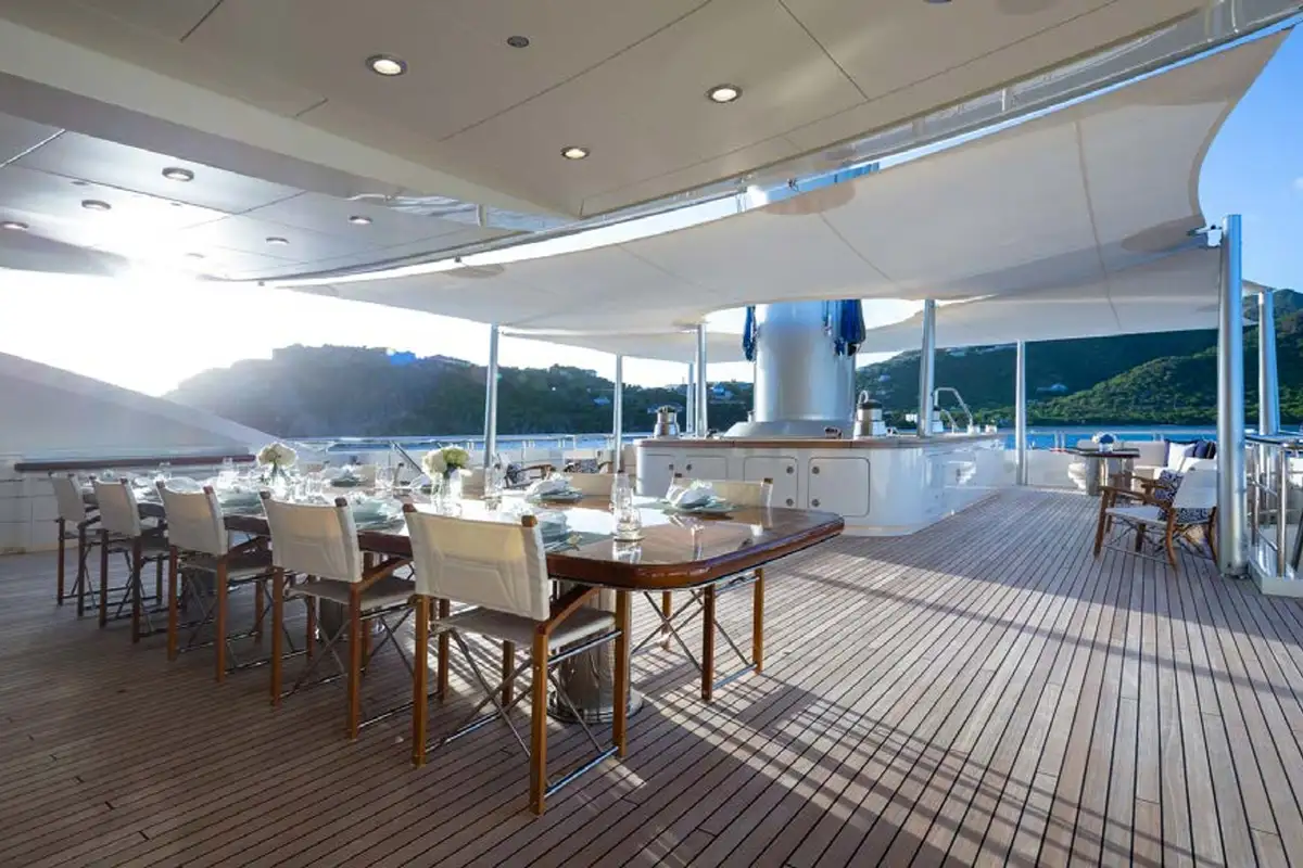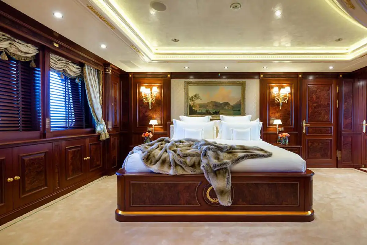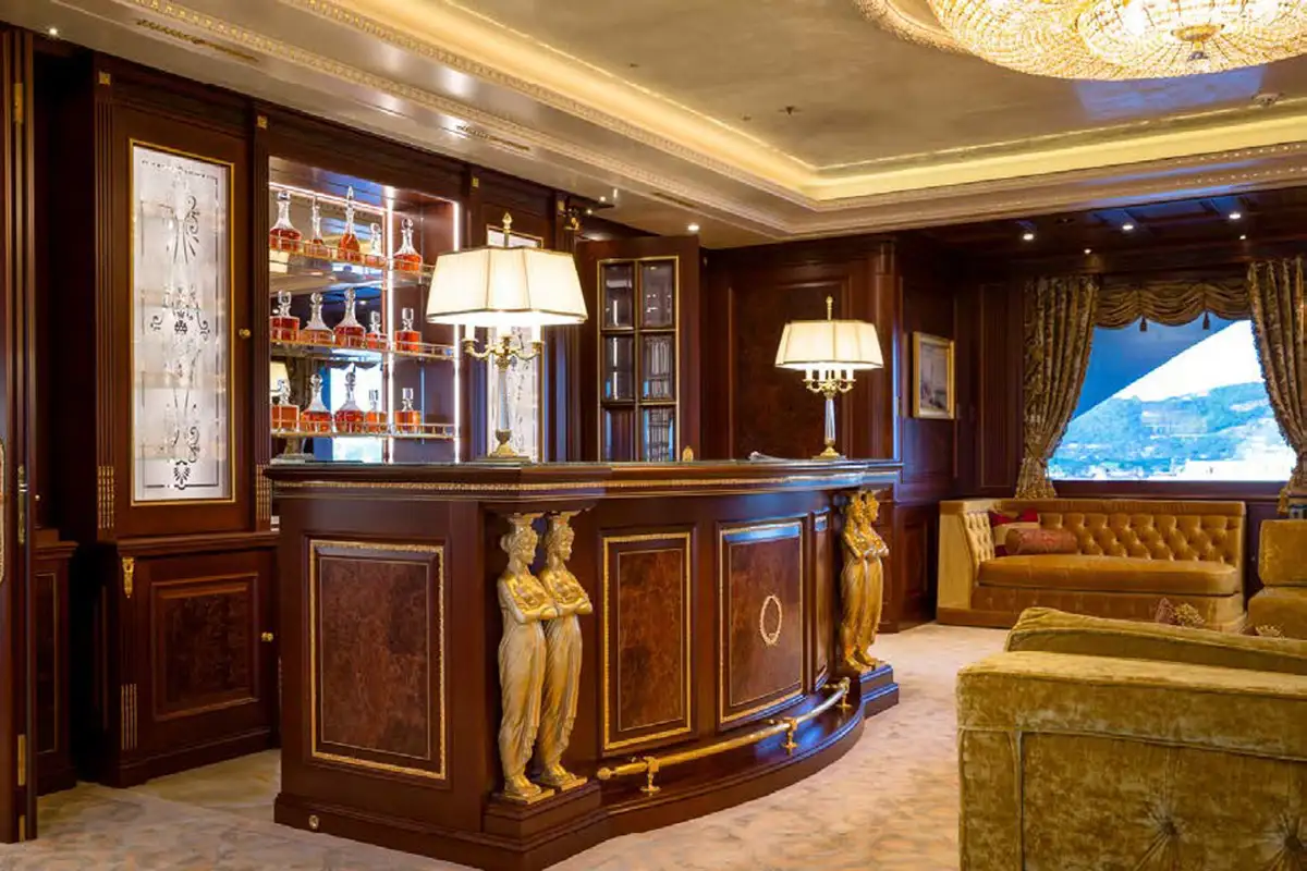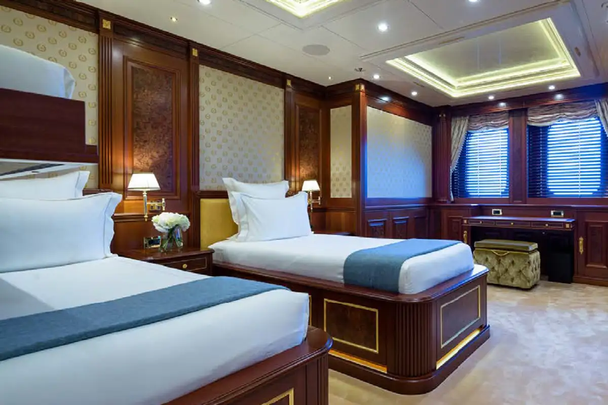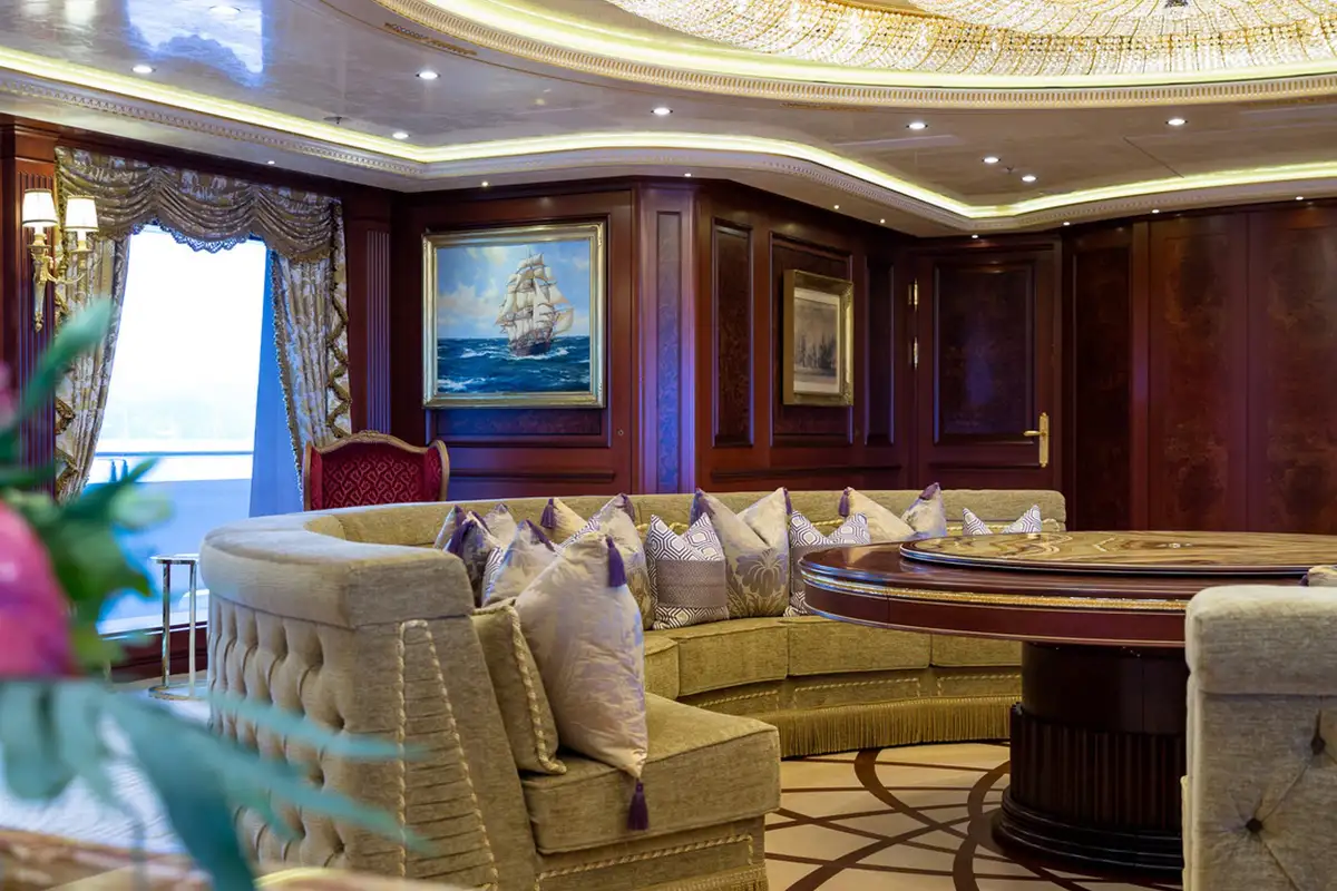 All guest suites for her 10 guests are on the lower deck, with step-free access to the wellness spa and beach club. The master suite is forward, full beam and vast, with his-and-hers en suites, one with a bath, the other a shower, his-and-hers dressing rooms and a private lounge. Two VIP suites each have a private lounge and a double cabin and a twin cabin.
