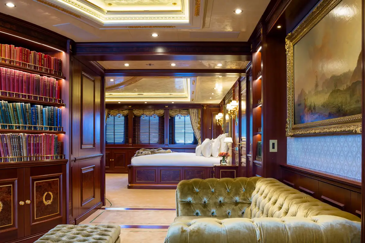 For special celebrations, the main deck is the place to be. On arrival, there will be drinks from the lounge bar, and then you can mingle with your guests inside as the baby grand piano plays, or outside on the sun terrace. When it’s time to dine, move through to the fine dining room, seating 20 guests, which has fold-down balconies either side for infinity views. The cuisine is exquisite, and after dinner, you and your guests withdraw to the library for digestifs.