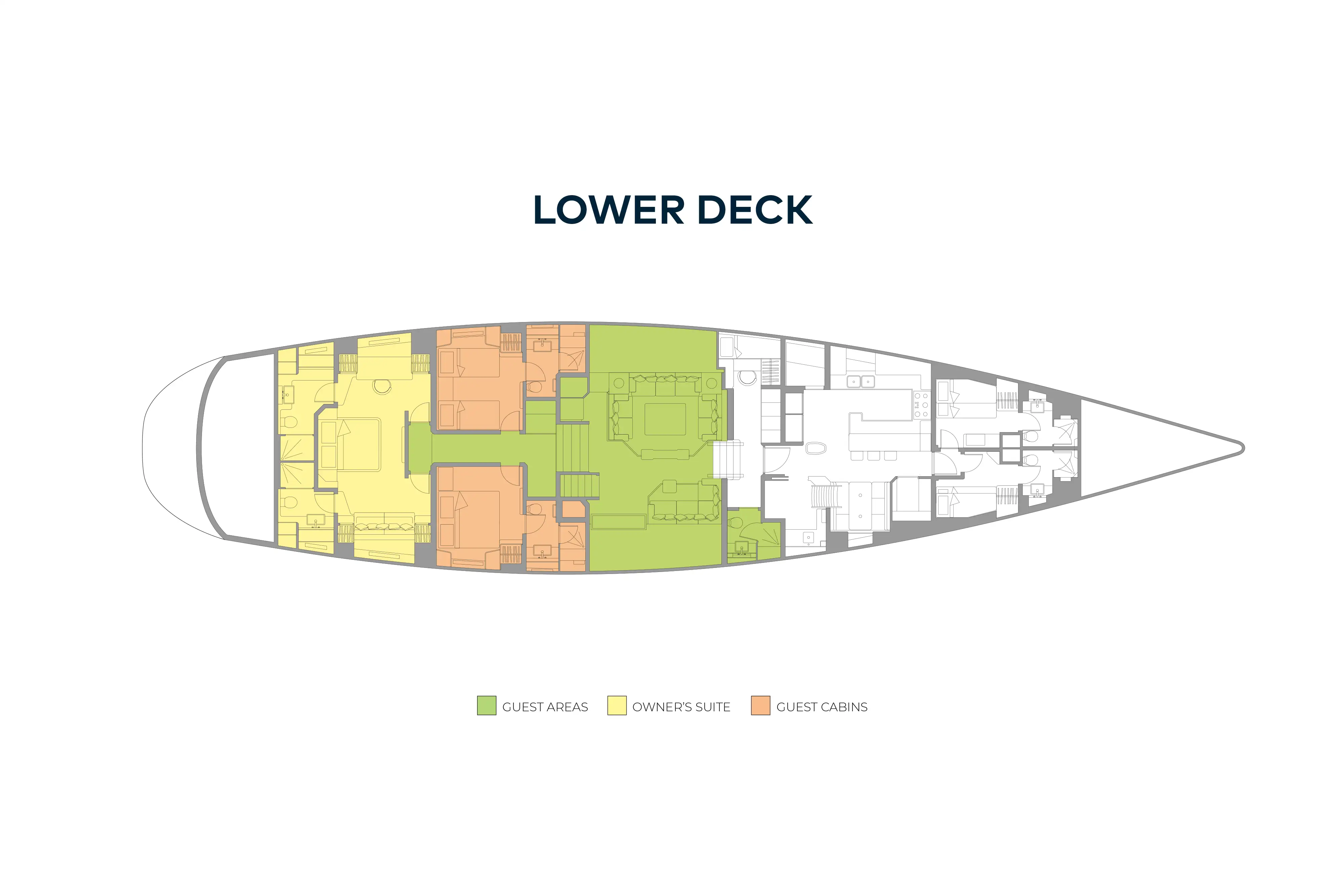 While BLISS offers ideal accommodation for six guests, she can also accommodate up to 10 guests, perfect for families with children. The full-width master cabin offers flexible configurations, easily dividing into a smaller master cabin plus twin bunk cabin arrangement. The cleverly designed 'his and hers' en suite bathrooms in the master cabin, when in full cabin mode, conveniently become separate en suites for the master and the bunk cabin when the partition is in place. The two double guest cabins can also be converted into two twin cabins with pullmans, providing further flexibility and comfort for everyone on board.