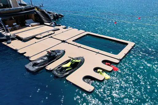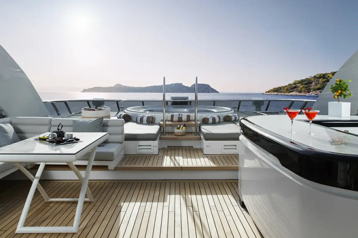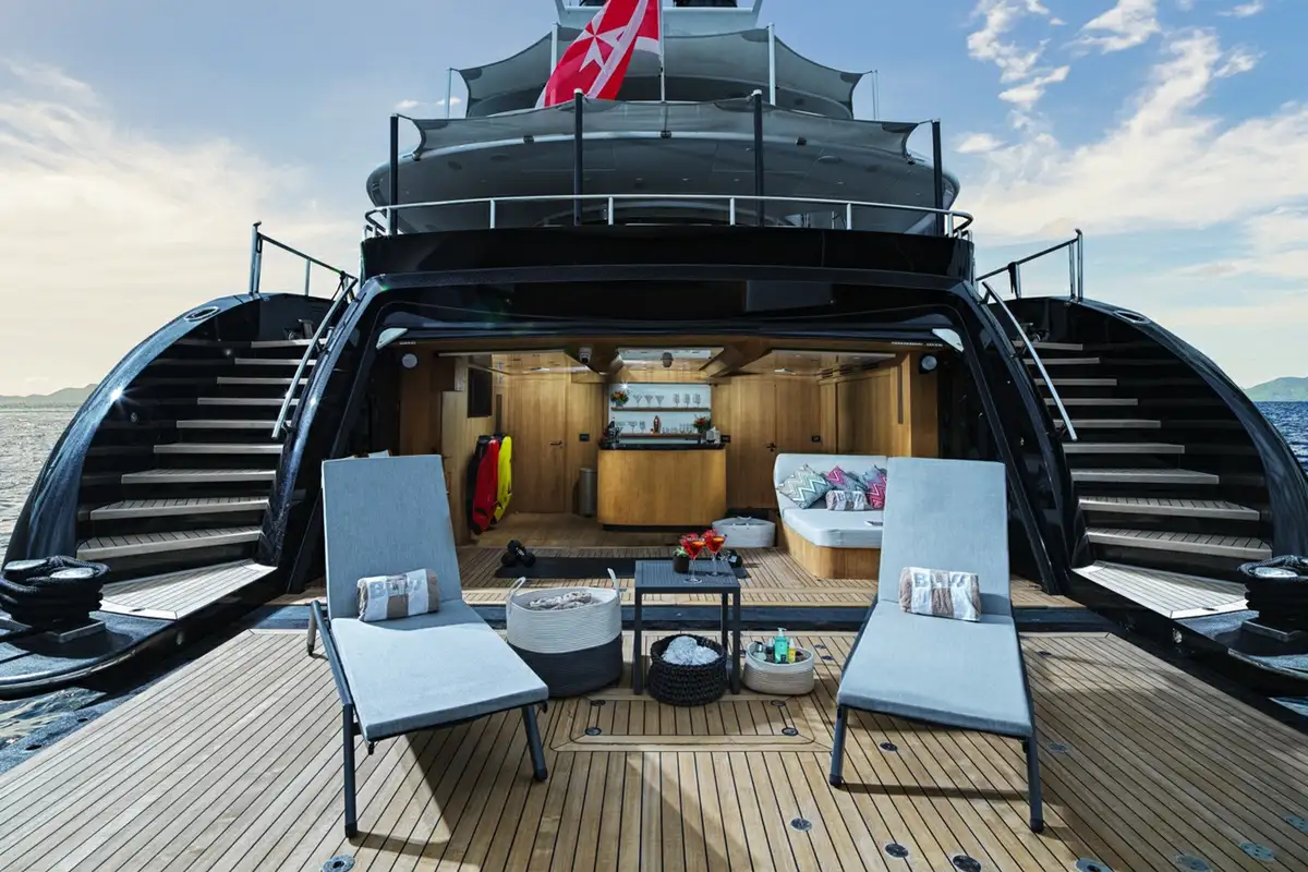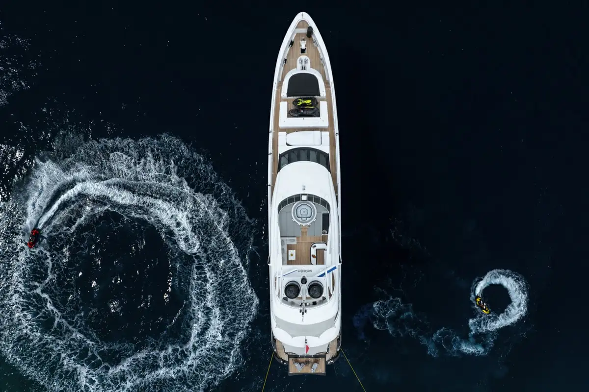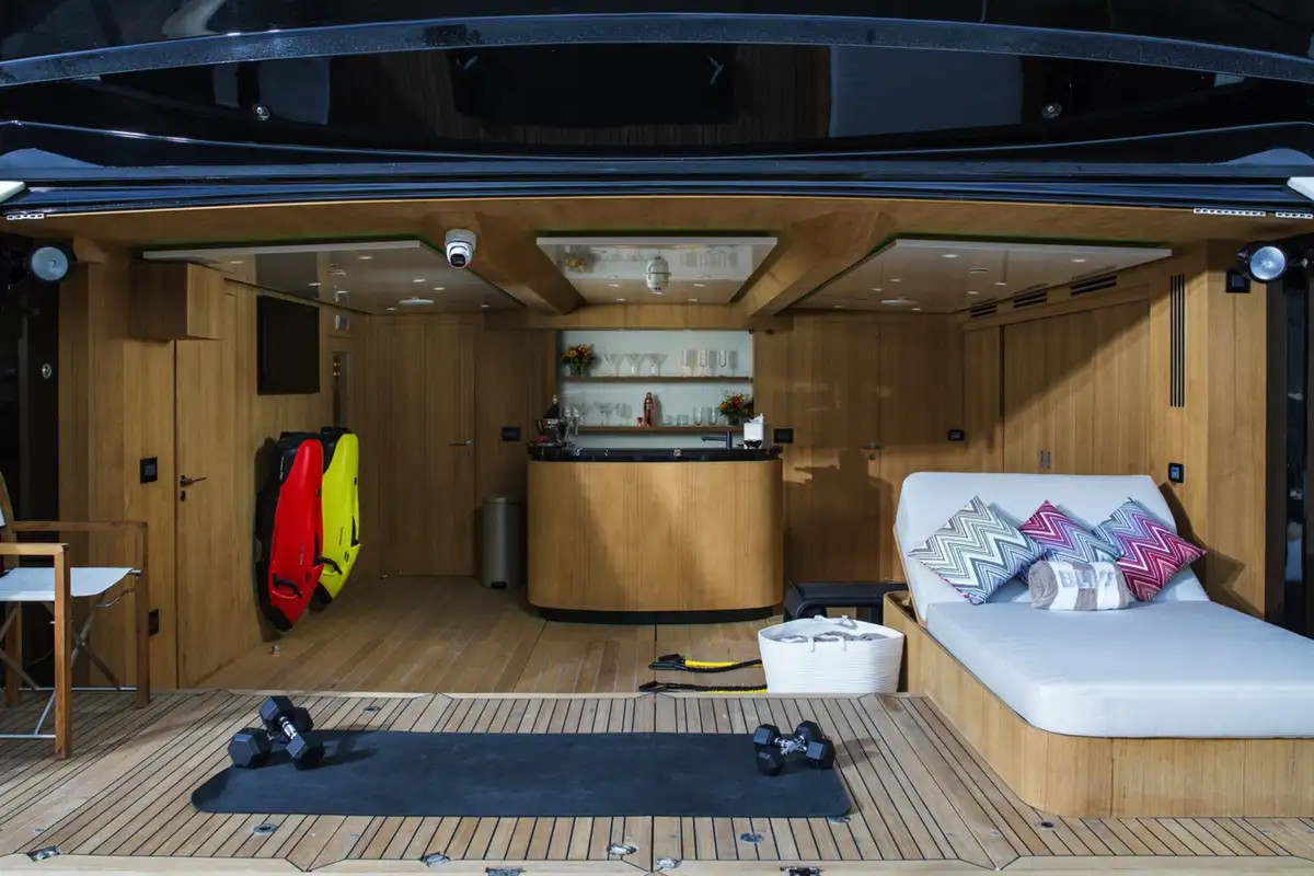 The sundeck is a notable highlight with its six-seat cocktail bar, sociable lounge, jacuzzi pool and sunbeds. There’s also a stylish foredeck lounge with more sofas and sunbeds, two outside aft decks, a two-person sauna and a garage full of tenders and toys. These include a 12-metre chase boat, a super fast jet powerboat, high-spec SeaDoo watercraft, a SeaBob underwater scooter, inflatable tows, paddleboards and more. There’s also a full set of gym equipment on board.