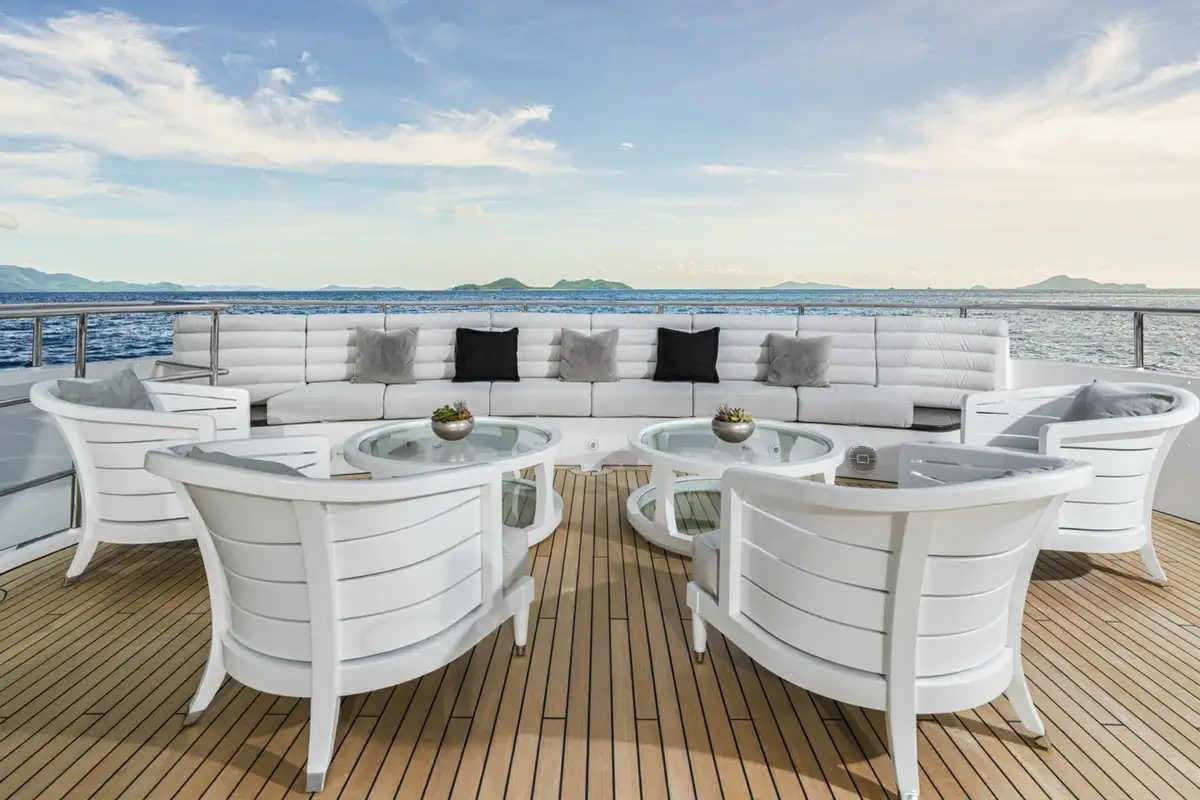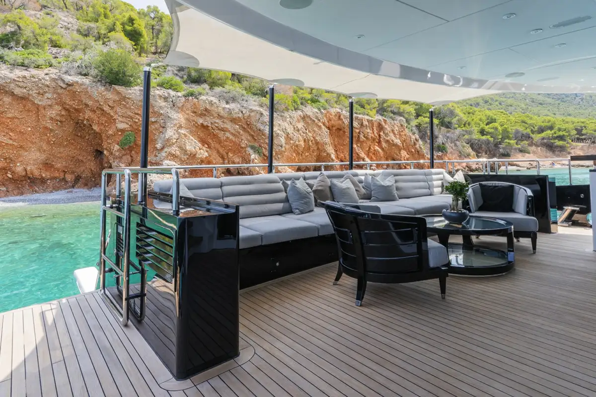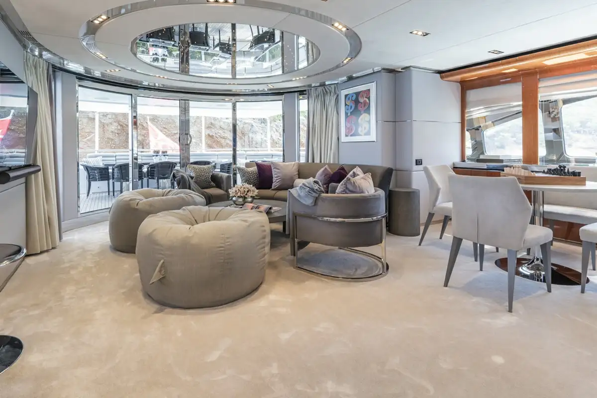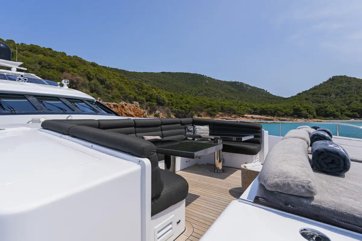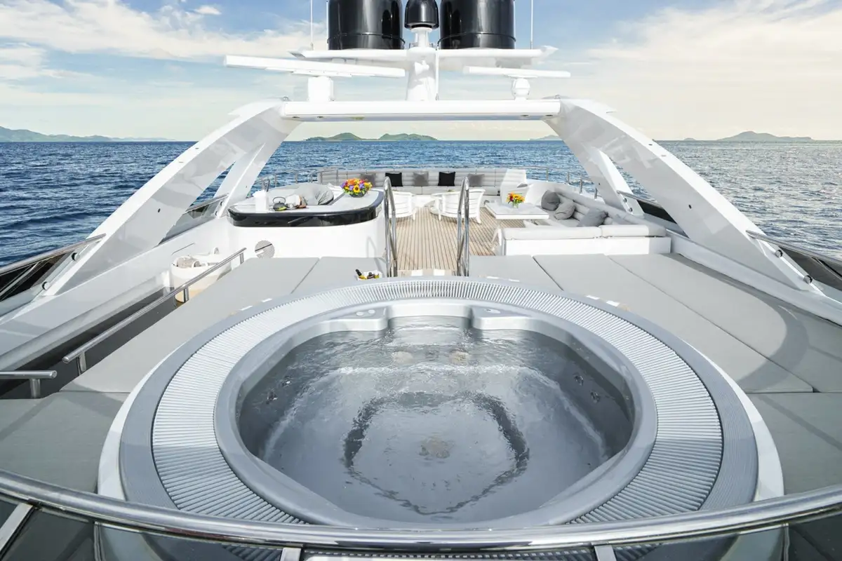 The sundeck is a notable highlight with its six-seat cocktail bar, sociable lounge, jacuzzi pool and sunbeds. There’s also a stylish foredeck lounge with more sofas and sunbeds, two outside aft decks, a two-person sauna and a garage full of tenders and toys. These include a 12-metre chase boat, a super fast jet powerboat, high-spec SeaDoo watercraft, a SeaBob underwater scooter, inflatable tows, paddleboards and more. There’s also a full set of gym equipment on board.