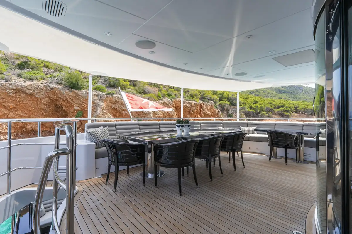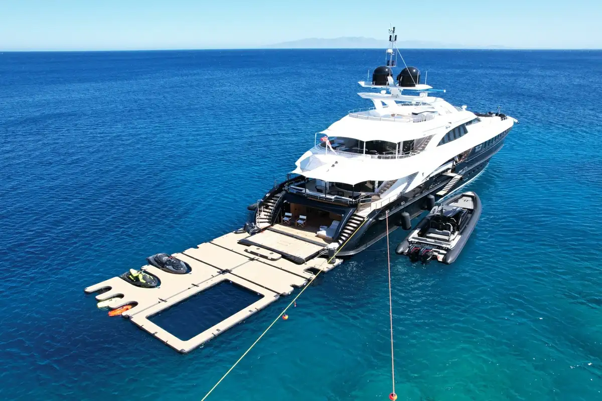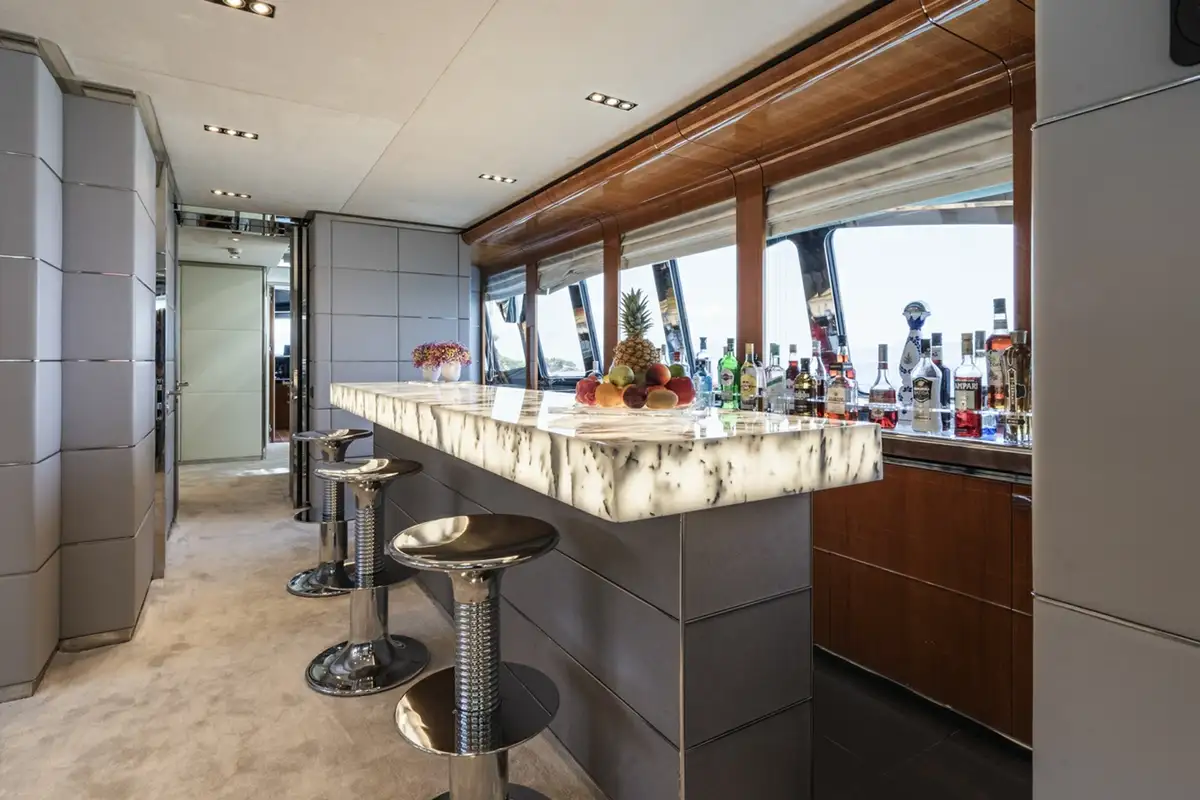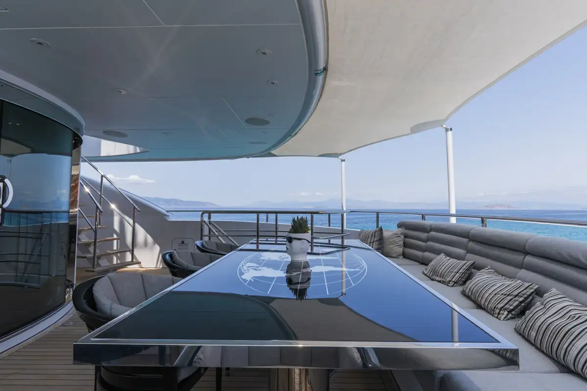 The sundeck is a notable highlight with its six-seat cocktail bar, sociable lounge, jacuzzi pool and sunbeds. There’s also a stylish foredeck lounge with more sofas and sunbeds, two outside aft decks, a two-person sauna and a garage full of tenders and toys. These include a 12-metre chase boat, a super fast jet powerboat, high-spec SeaDoo watercraft, a SeaBob underwater scooter, inflatable tows, paddleboards and more. There’s also a full set of gym equipment on board.
