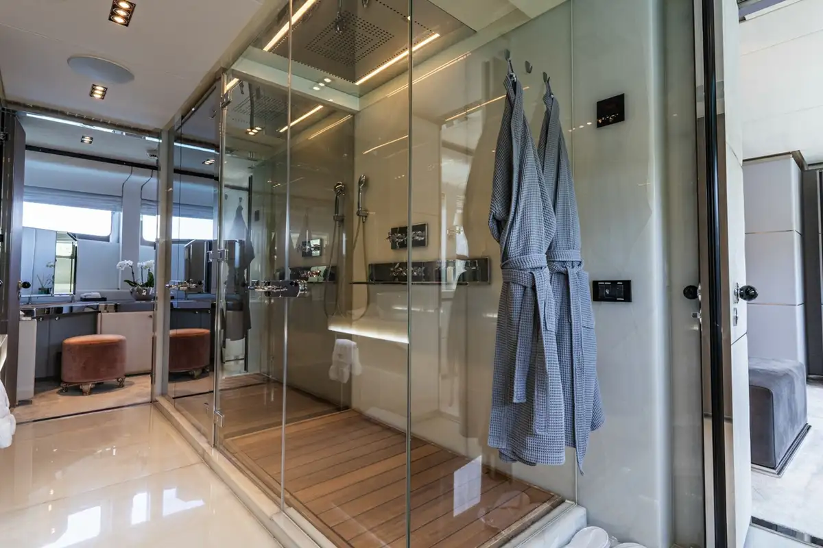 Up front on the main deck, the master suite is bright and inviting with a clean, contemporary feel. There’s a sofa on one side of the main cabin and the en suite bathroom has a bathtub as well as a large, separate shower and a beautiful marble finish. The sky lounge converts from a living and games room with a cocktail bar into a king size suite with elevated sea views, and the lower deck cabins – three doubles and a twin – are all bright and nicely finished, each with its own private en suite bathroom.