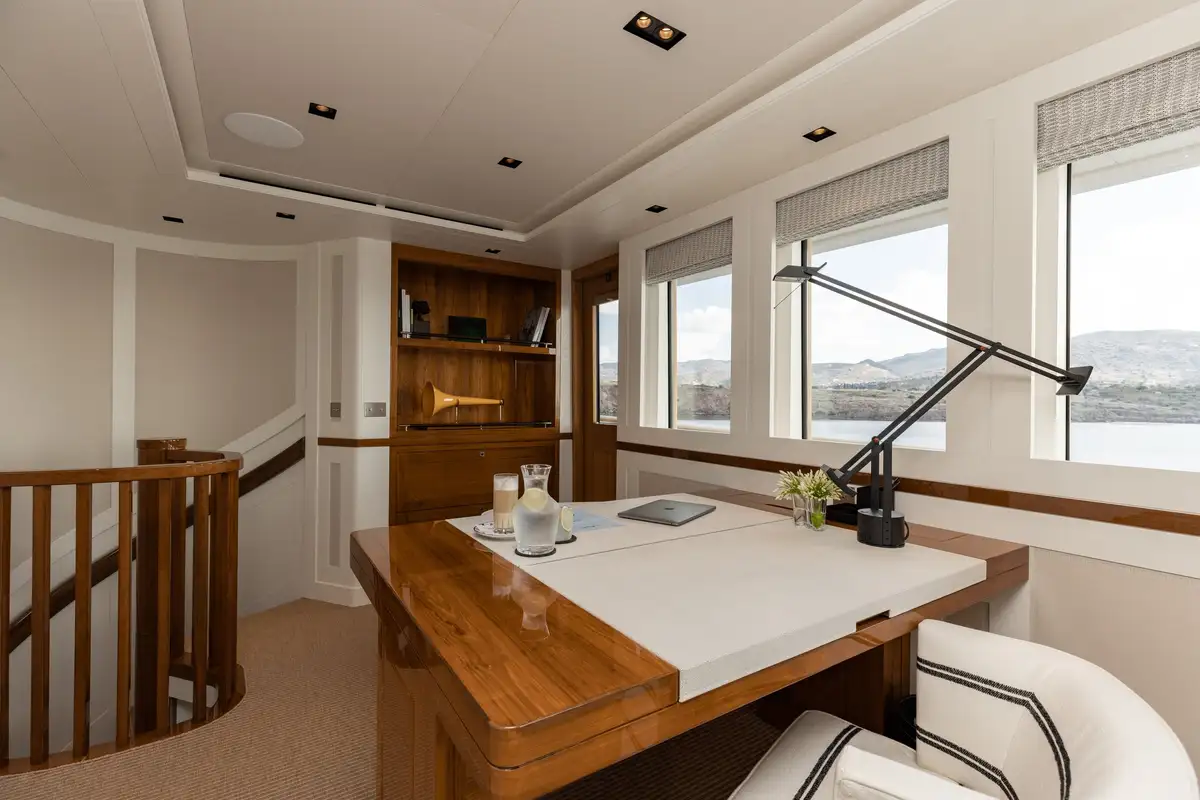 BLUE II’s thoughtful layout reflects this same harmony between heritage and progress. Two master suites offer an extraordinary choice: one on the upper deck with panoramic views forward, and another on the main deck, combining privacy with ease of access. Expansive outdoor spaces, including an inviting sun lounge and a chic foredeck seating area, invite you to unwind in style, while the upper deck aft provides the perfect setting for al fresco dining beneath the stars.