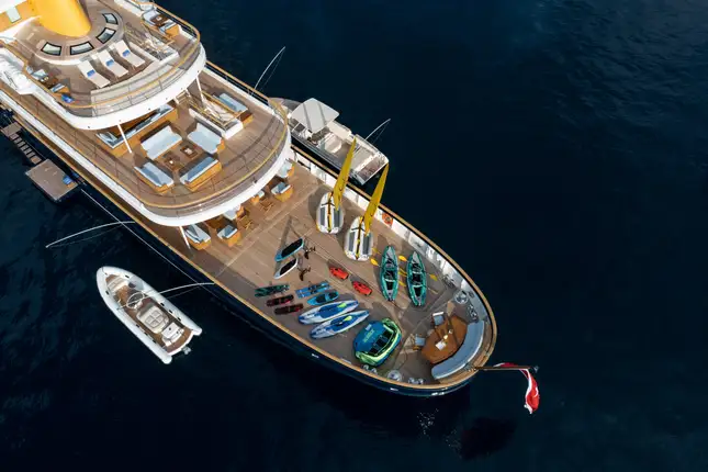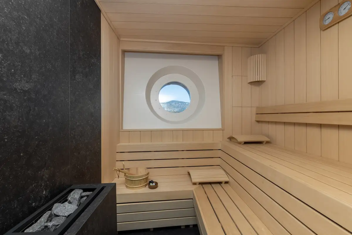 Inside, BLUE II’s main saloon exudes warmth with classic design touches, yet conceals modern comforts and technology, including a cinema lounge and a private office on the bridge deck. A dedicated wellness area with a sauna, hammam, massage table, and a gym ensures relaxation is always within reach.