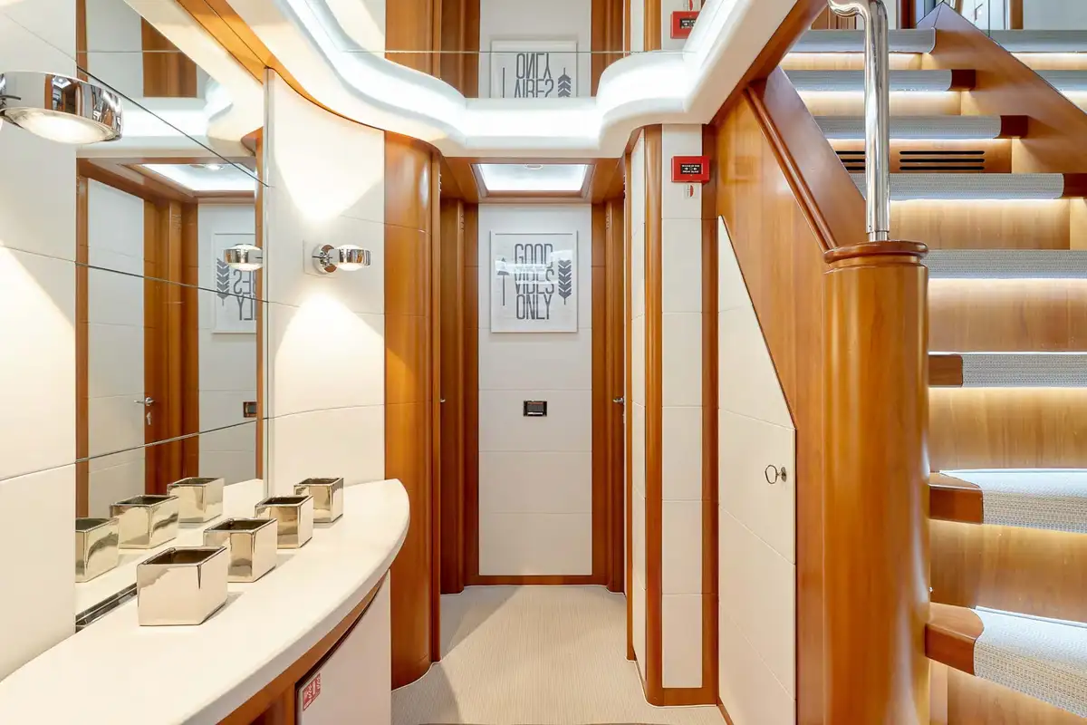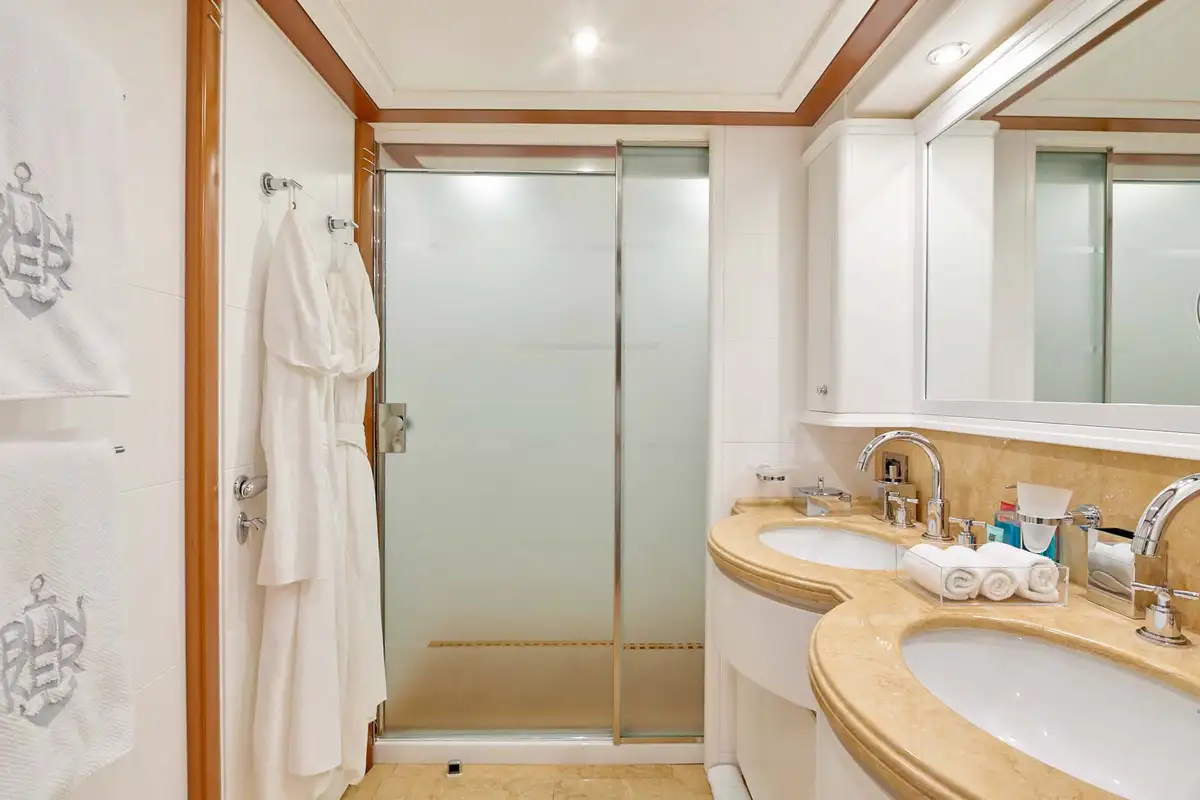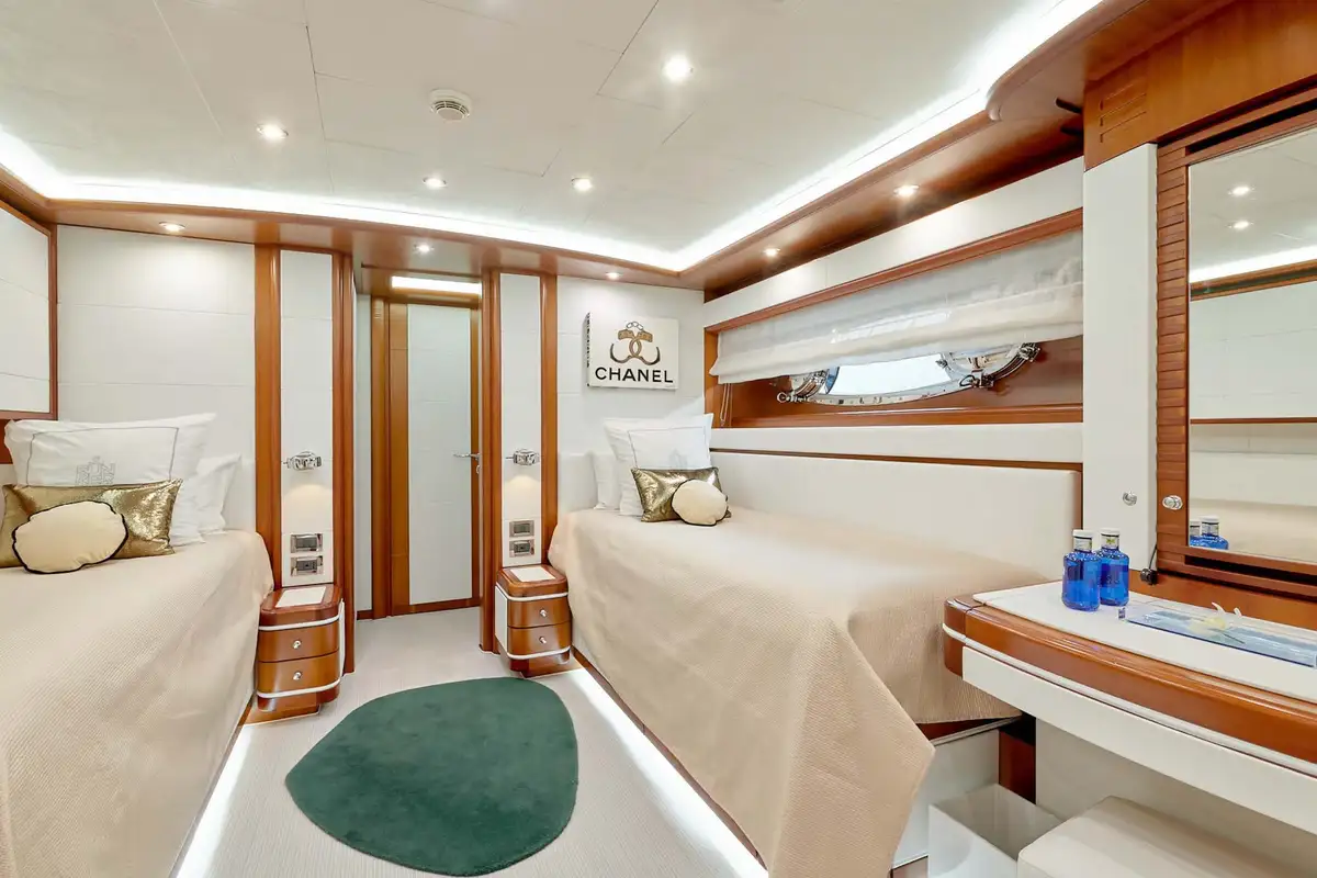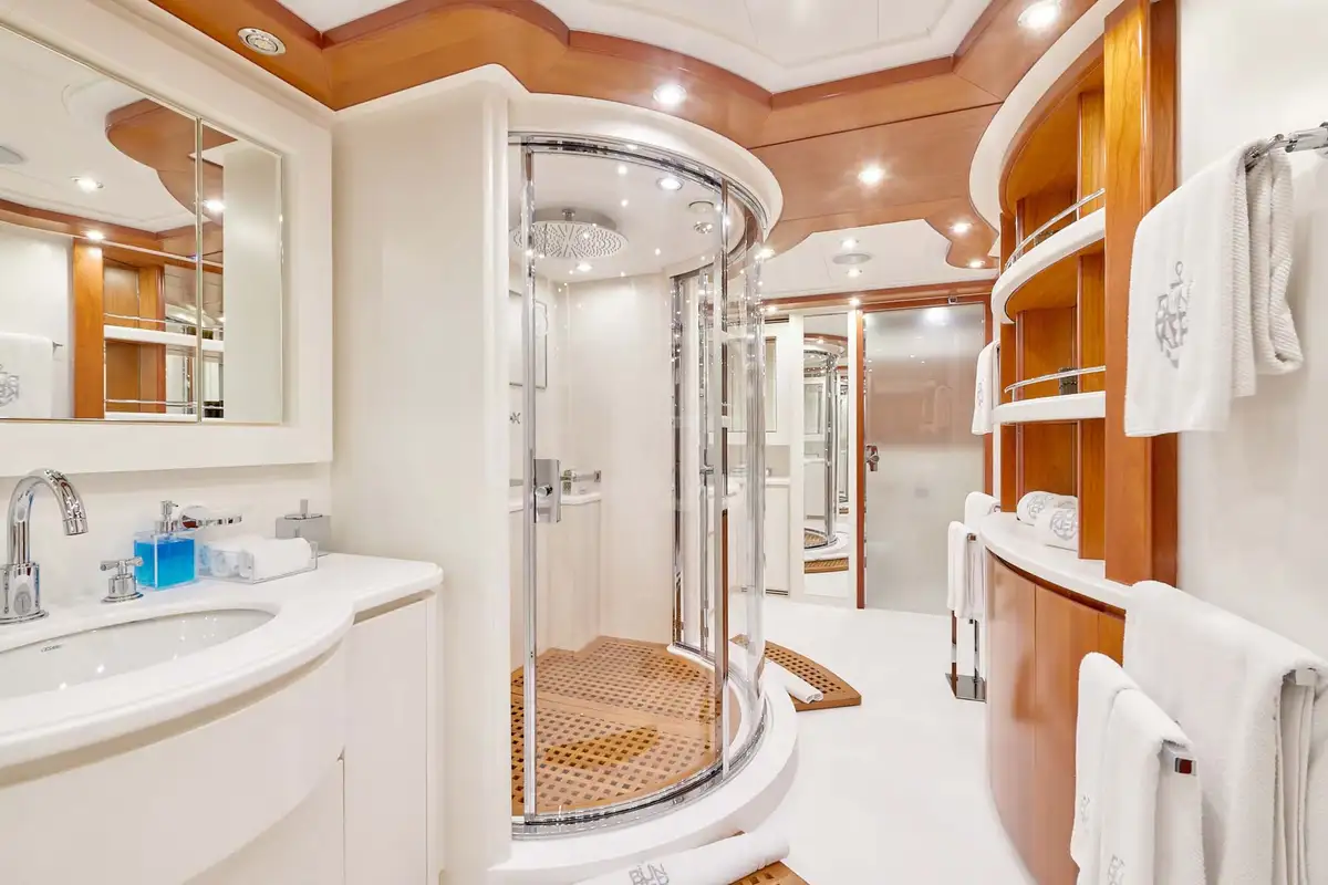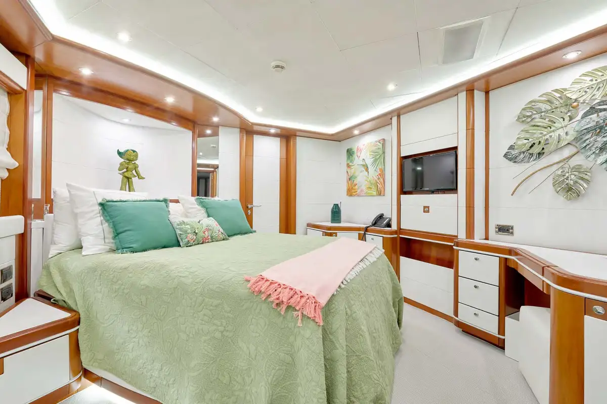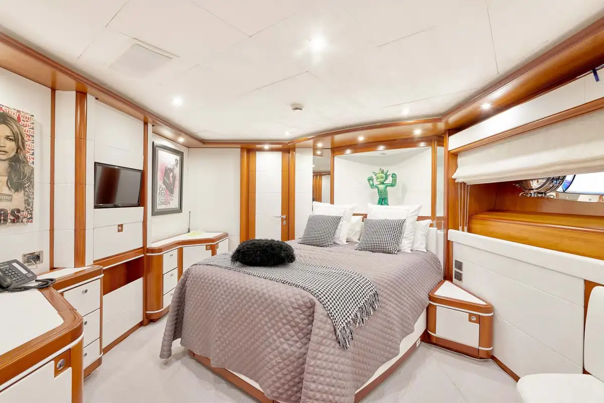 The master suite, located on the main deck, provides a calm retreat for your relaxation. The yacht’s modern amenities, including individual sound systems for each cabin and a brand-new internet system, ensure that every guest can stay connected and entertained throughout their stay.