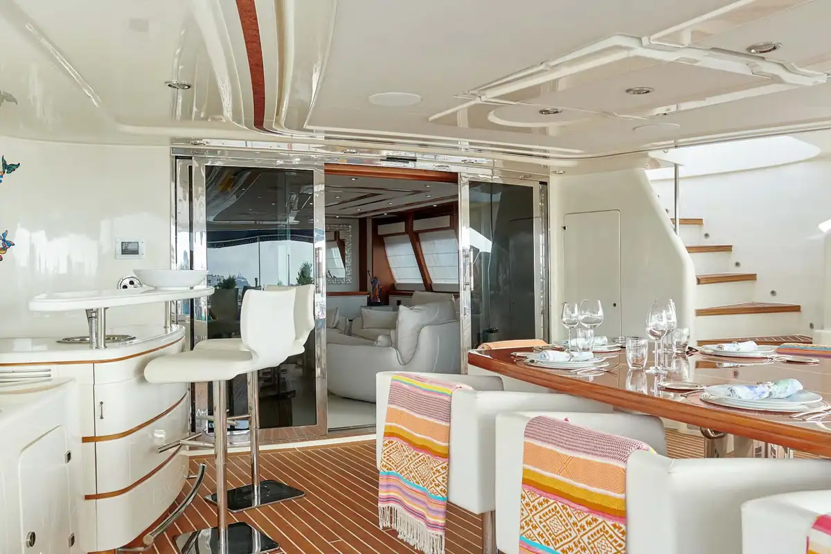 The yacht’s generous decks provide ample space for outdoor relaxation and water activities. The main deck aft features a wet bar and seating area, which is ideal for outside dining or enjoying cocktails in the open air. The sun deck, complete with a jacuzzi, provides a perfect spot for soaking up the sun, while the custom-built swimming platform makes it easy to access the water for a swim or to enjoy the yacht’s fleet range of watertoys. From wakeboarding and waterskiing to exploring the coastline with SeaBobs or a kayak, BUNKER offers everything you need for an active and fun-filled holiday.