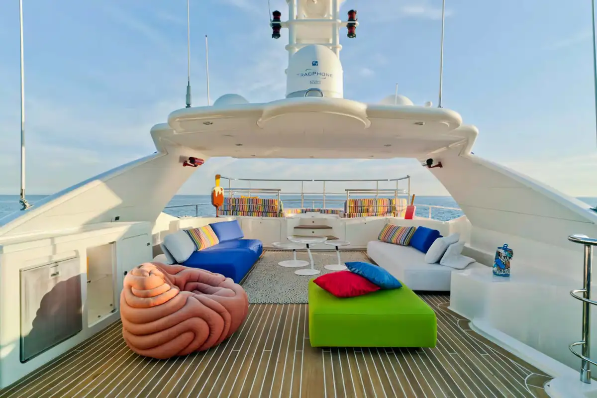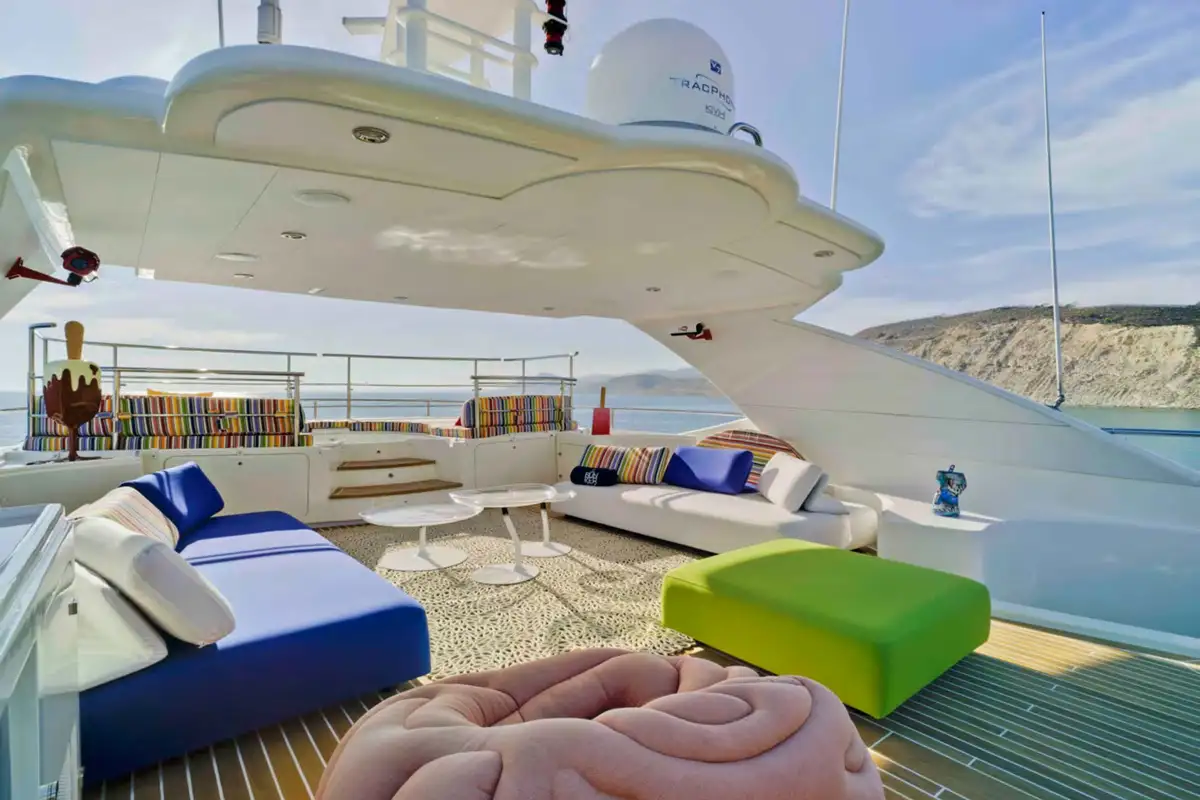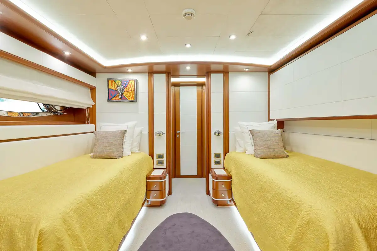 BUNKER features a spacious layout with five beautifully appointed cabins, including a full-beam master suite, two VIP cabins, and two twin cabins. Each cabin is individual, repeating the pop art décor found throughout.