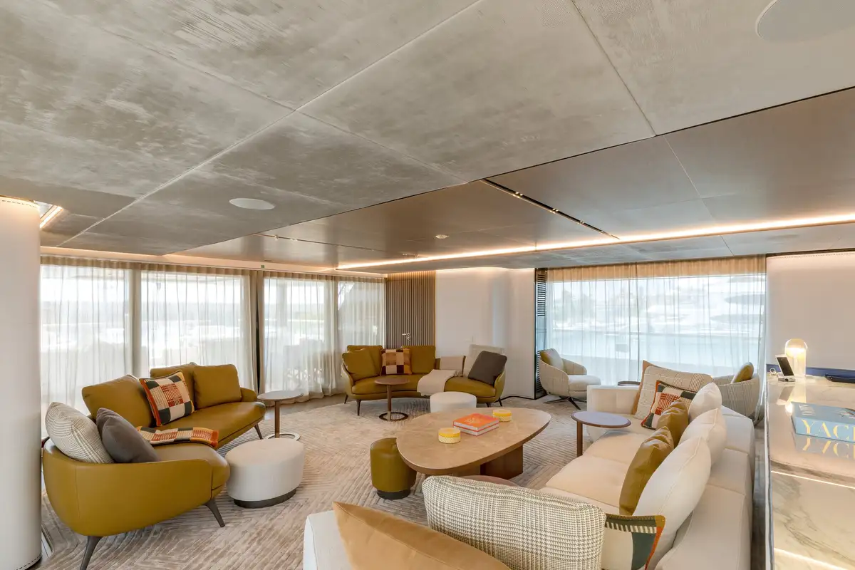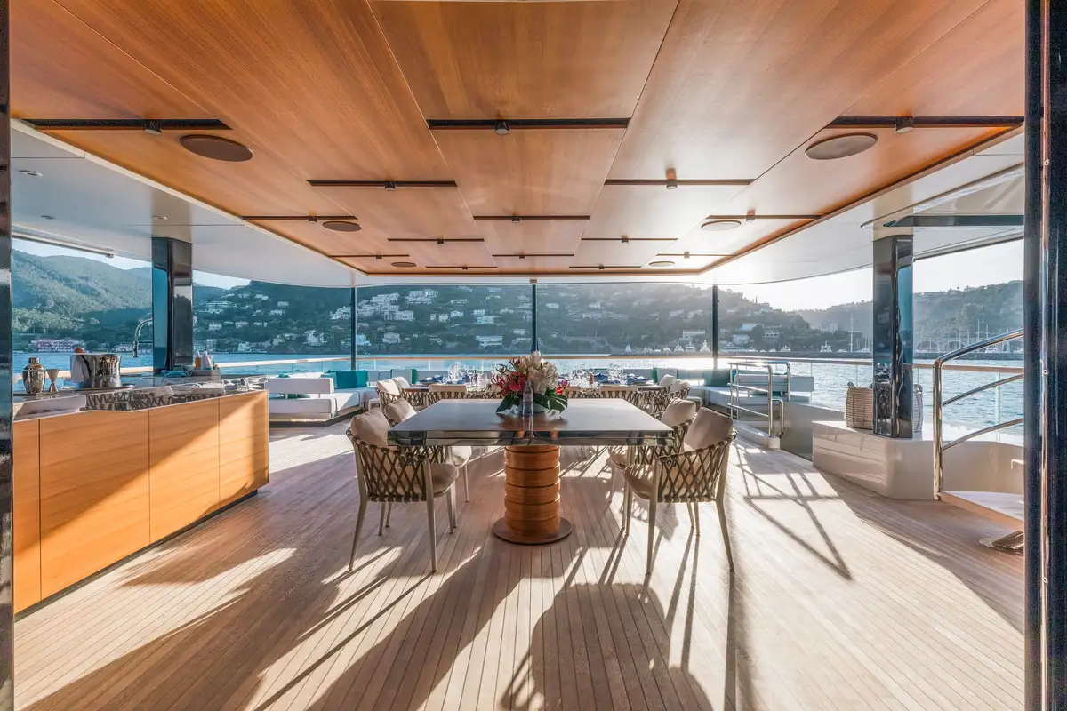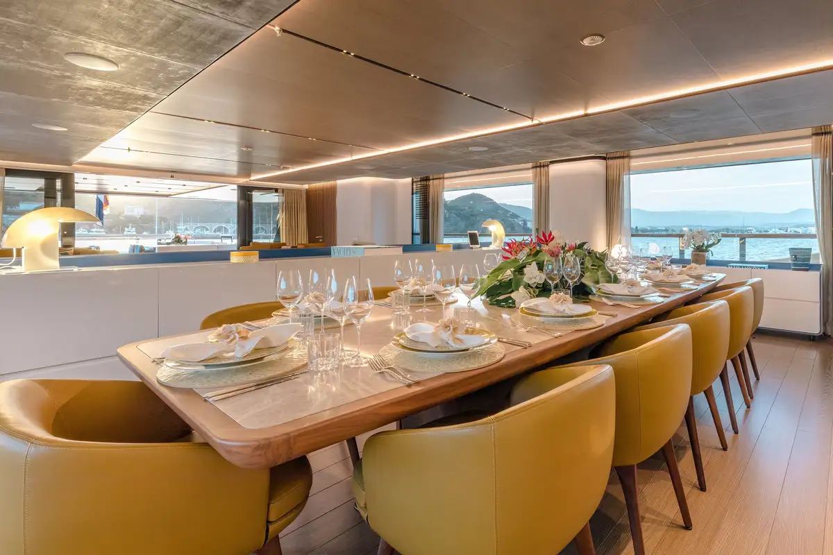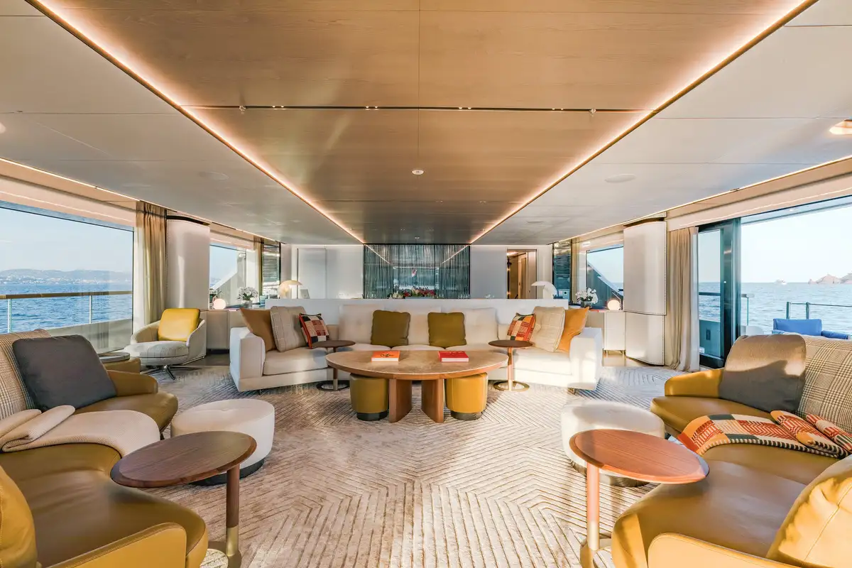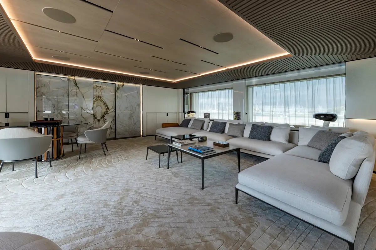 The main deck lounge is an architectural triumph, designed to embrace contemporary family life while exuding quiet opulence. Floor-to-ceiling windows flood the space with natural light, and retractable glass doors reveal a private sea-view balcony. Every element from the bespoke Belvedere furnishings to custom Minotti piece has been meticulously curated to create a warm yet formal ambience. The walnut and marble dining table provides an exquisite setting for twelve, transforming meals into memorable occasions. Above, the sky lounge invites guests to unwind in cinema-worthy style with a state-of-the-art projector system and lounge seating that rivals the finest boutique hotels.