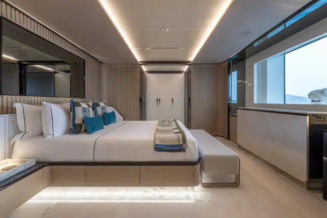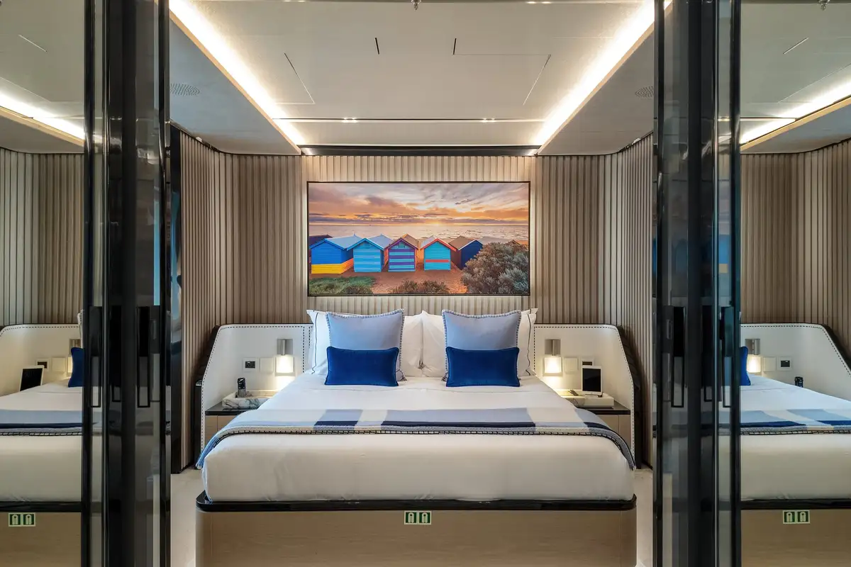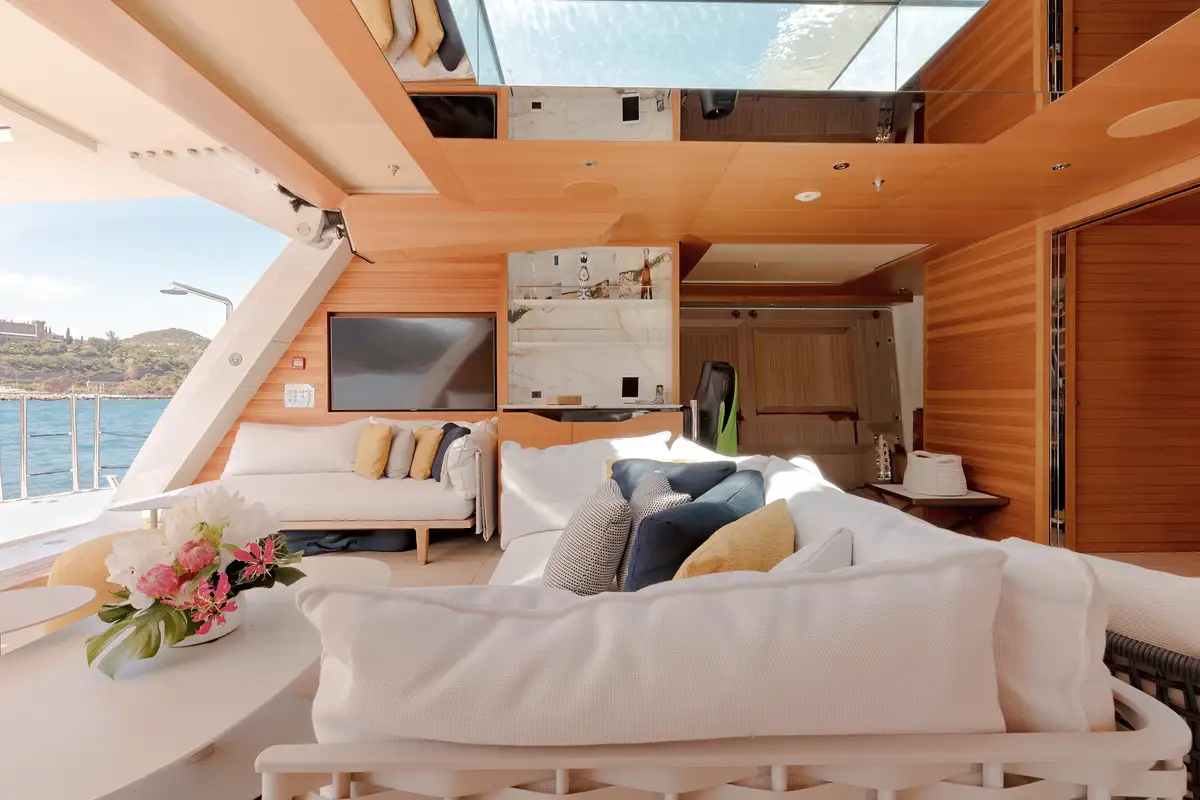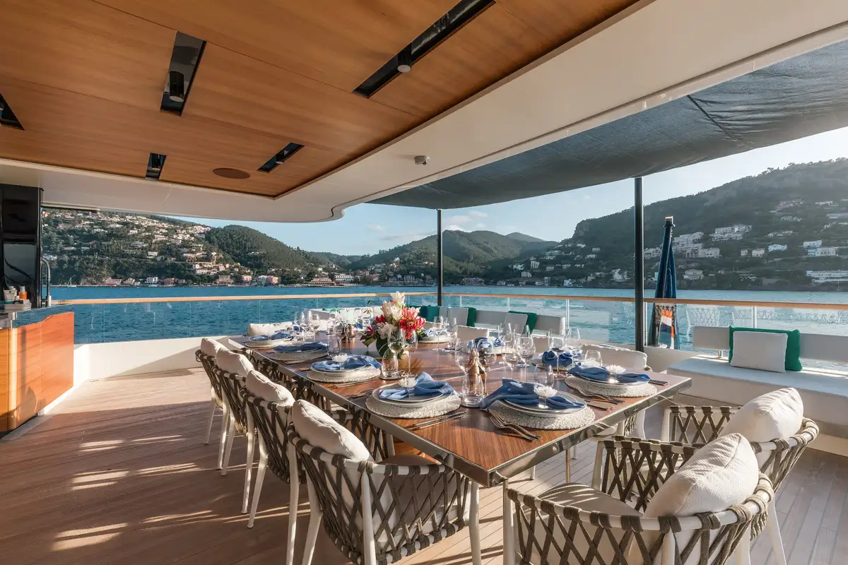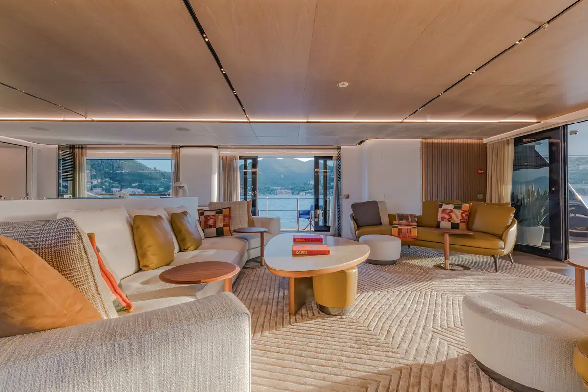 The main deck lounge is an architectural triumph, designed to embrace contemporary family life while exuding quiet opulence. Floor-to-ceiling windows flood the space with natural light, and retractable glass doors reveal a private sea-view balcony. Every element from the bespoke Belvedere furnishings to custom Minotti piece has been meticulously curated to create a warm yet formal ambience. The walnut and marble dining table provides an exquisite setting for twelve, transforming meals into memorable occasions. Above, the sky lounge invites guests to unwind in cinema-worthy style with a state-of-the-art projector system and lounge seating that rivals the finest boutique hotels.