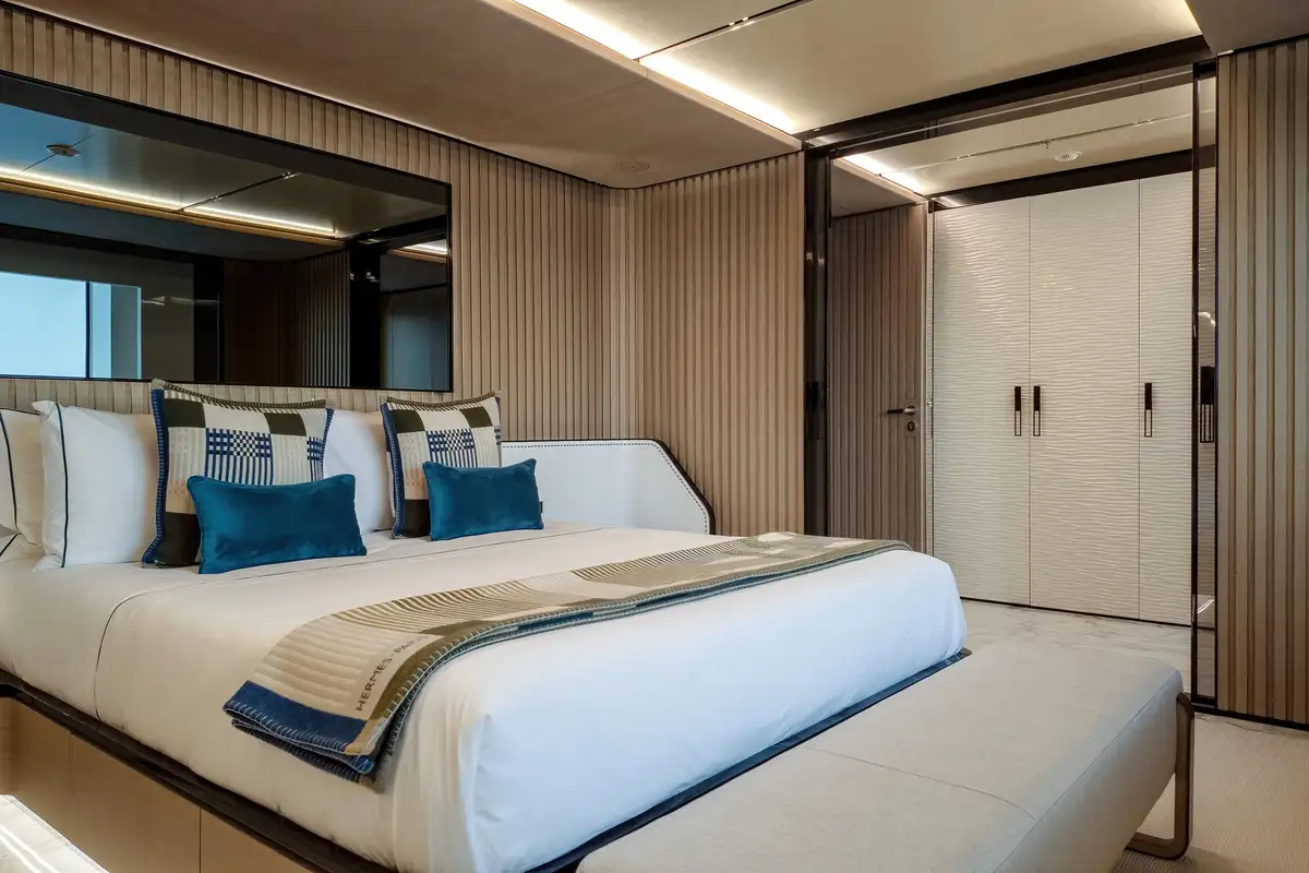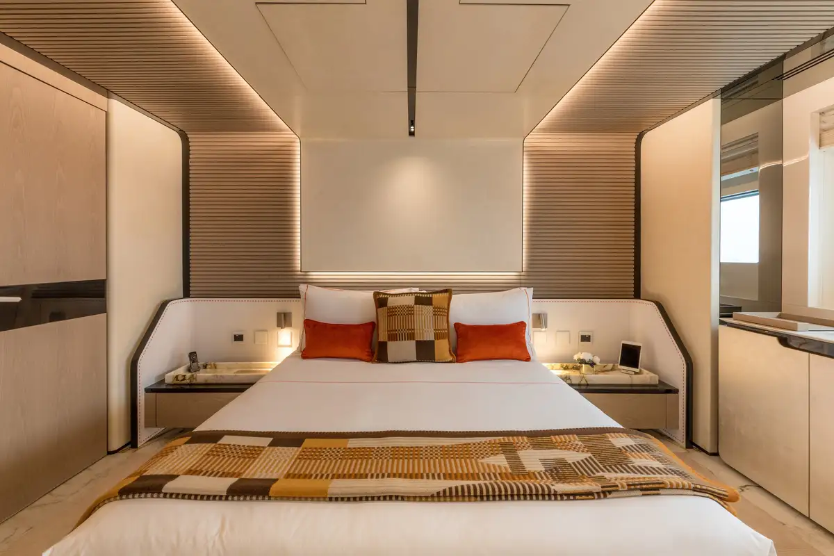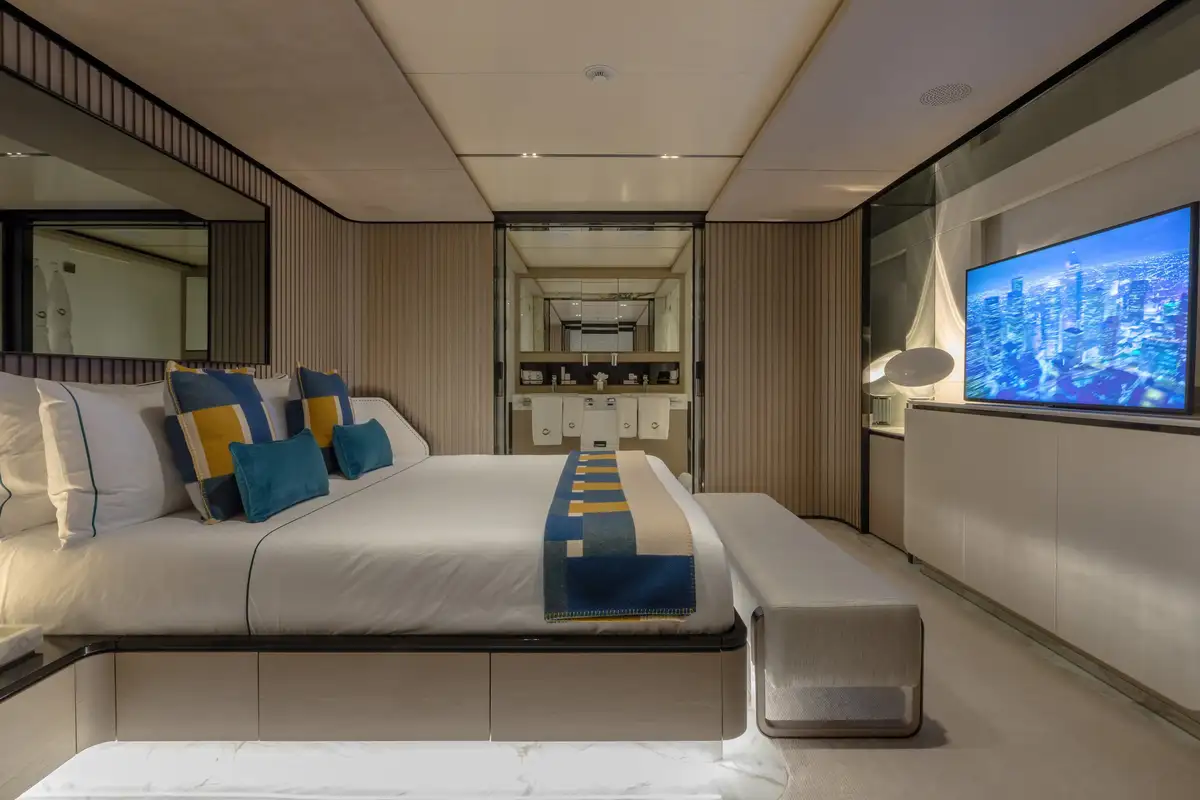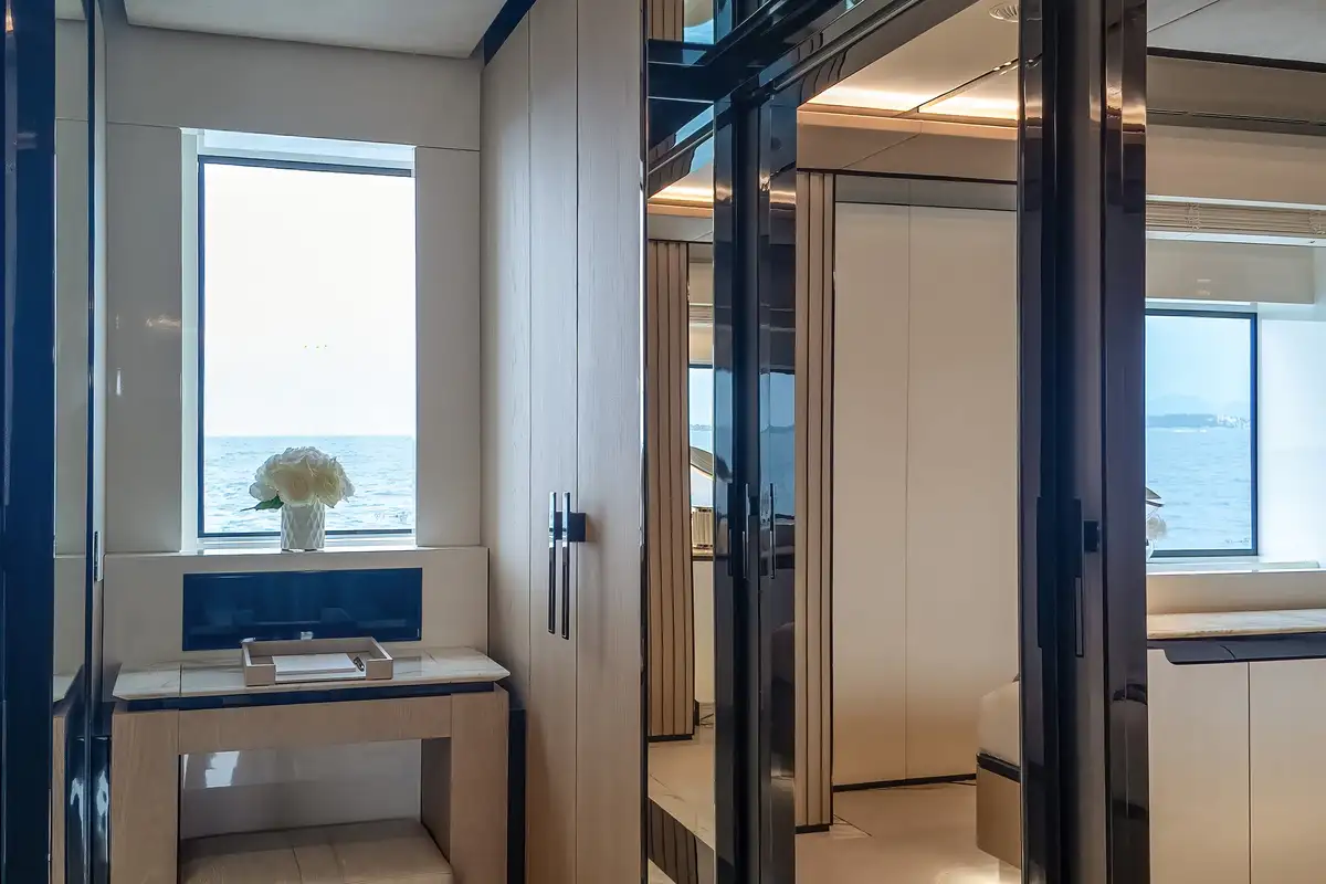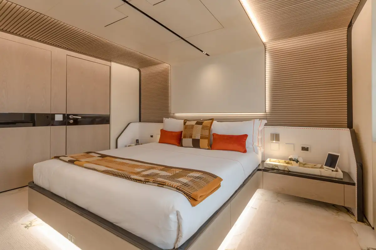 The main deck lounge is an architectural triumph, designed to embrace contemporary family life while exuding quiet opulence. Floor-to-ceiling windows flood the space with natural light, and retractable glass doors reveal a private sea-view balcony. Every element from the bespoke Belvedere furnishings to custom Minotti piece has been meticulously curated to create a warm yet formal ambience. The walnut and marble dining table provides an exquisite setting for twelve, transforming meals into memorable occasions. Above, the sky lounge invites guests to unwind in cinema-worthy style with a state-of-the-art projector system and lounge seating that rivals the finest boutique hotels.