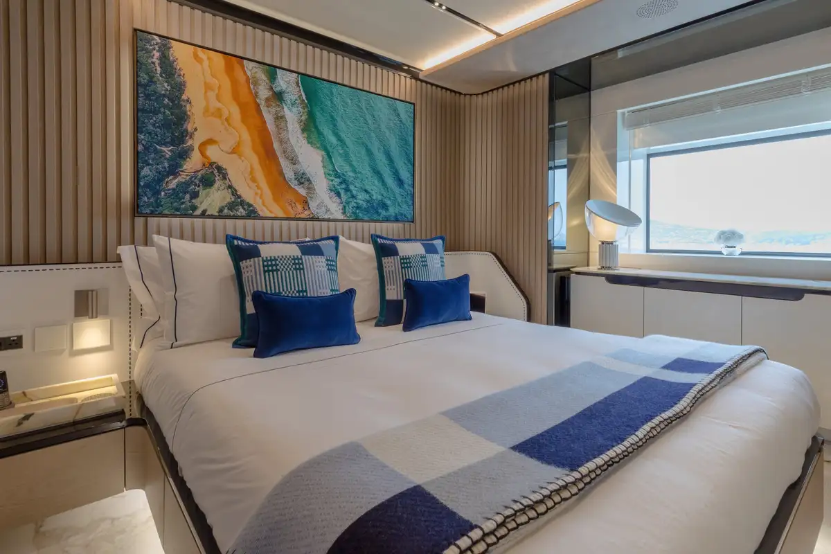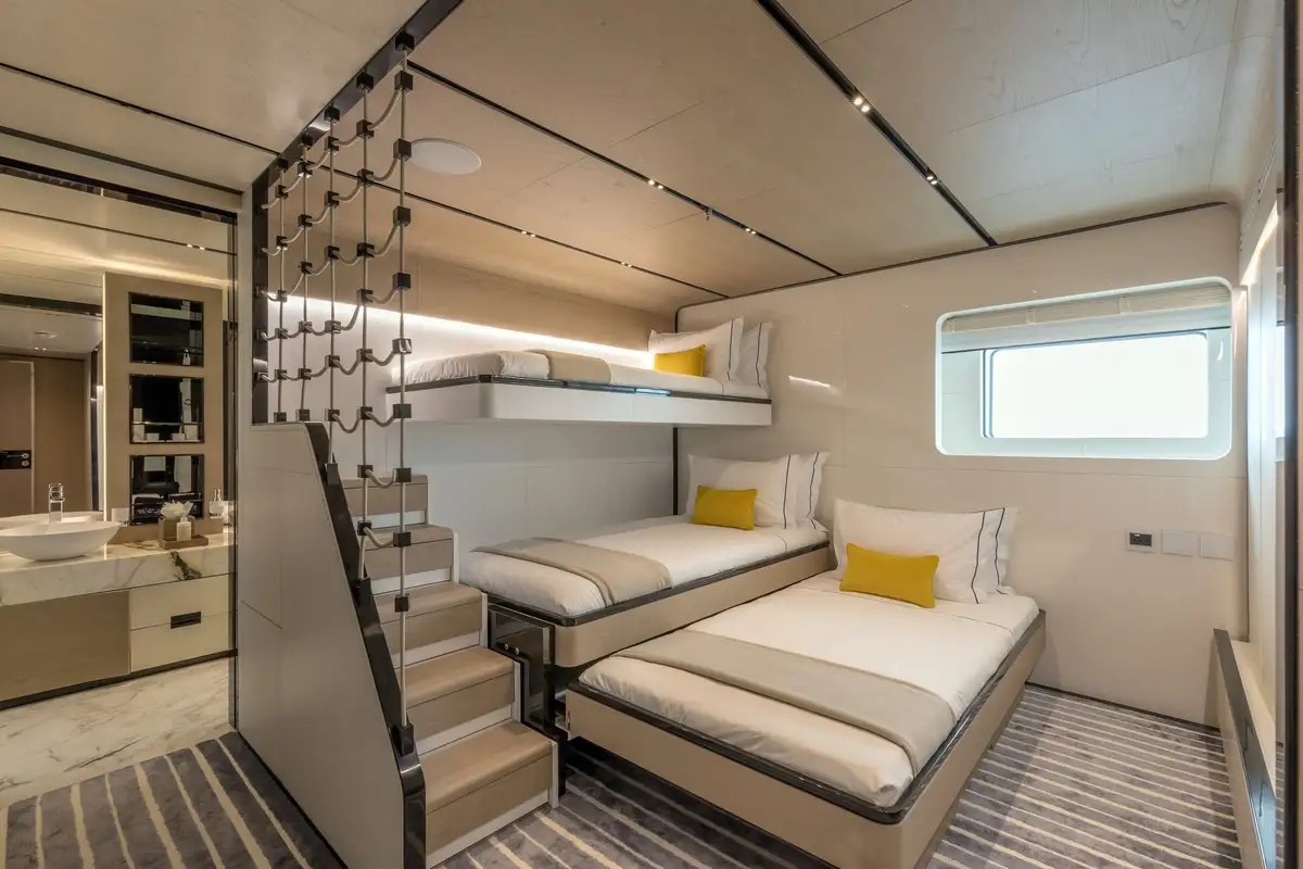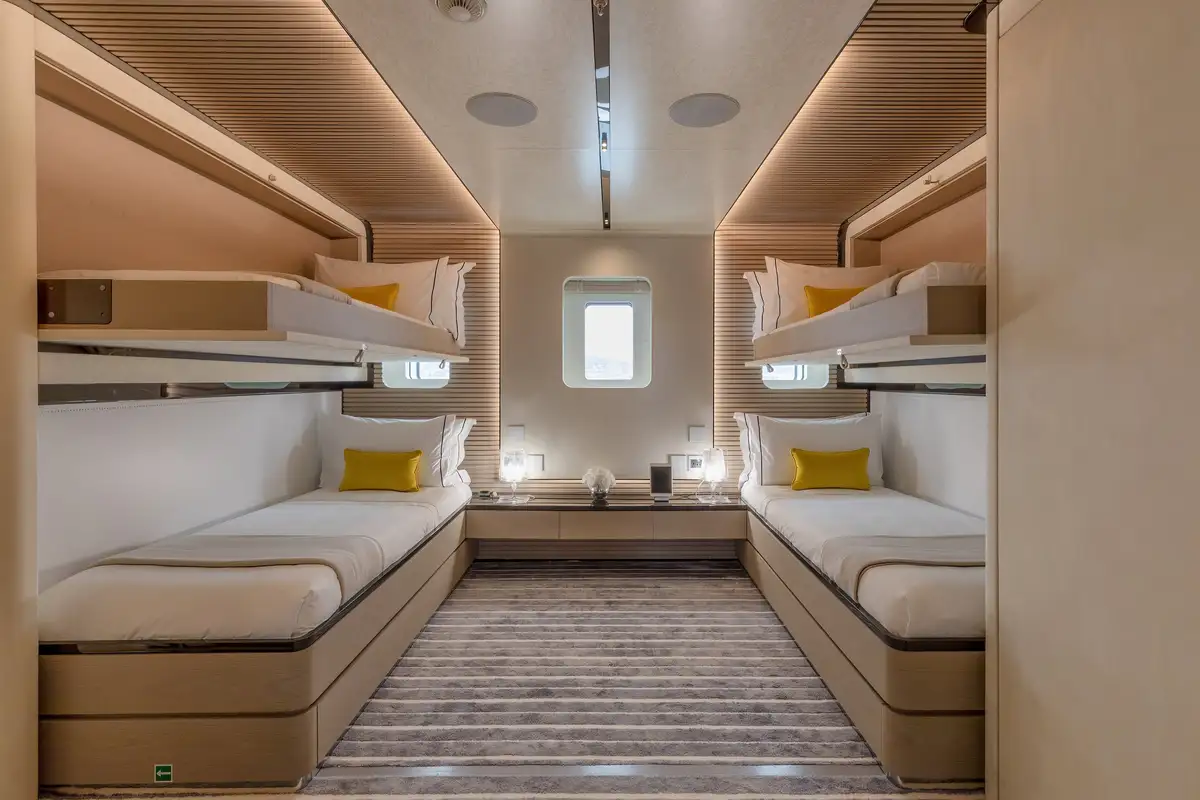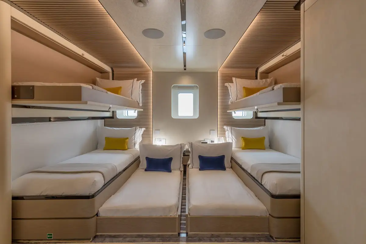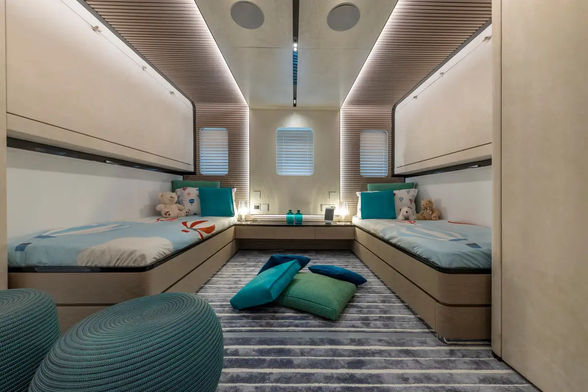 Offering remarkable flexibility, C accommodates up to 12 guests in seven immaculately appointed cabins. Her layout is nothing short of exceptional: two identical, expansive master cabin suites and two VIP suites occupy the main deck, while the lower deck offers a large double, a twin with roll-out beds and Pullman bunks, and a delightful children’s playroom that doubles as a bespoke cabin. This unique arrangement ensures that every family dynamic, with every generation of the family taken care of.