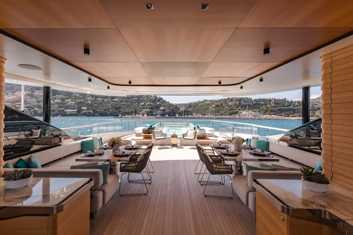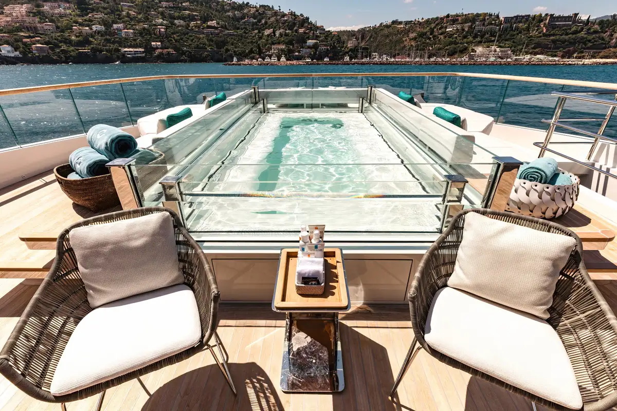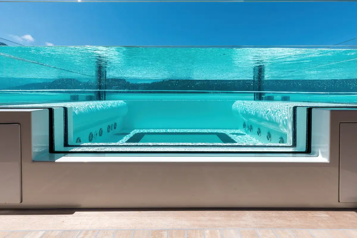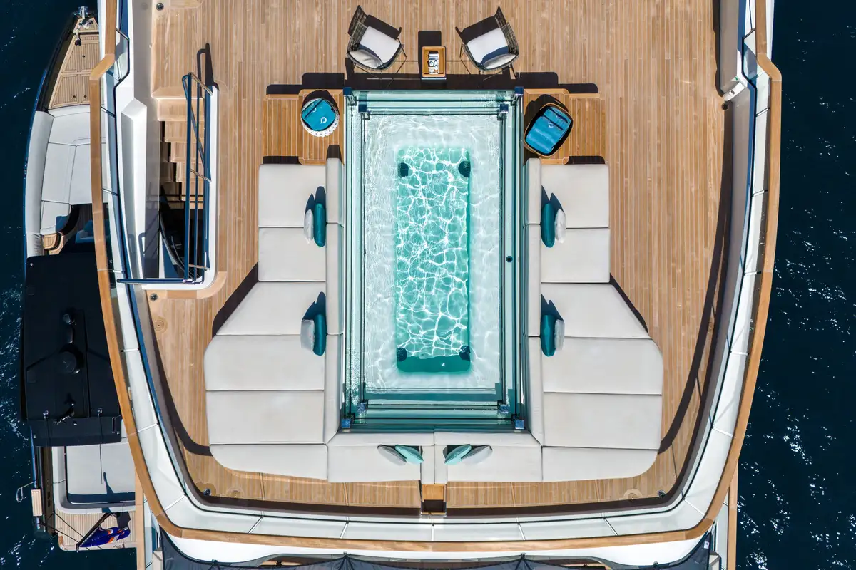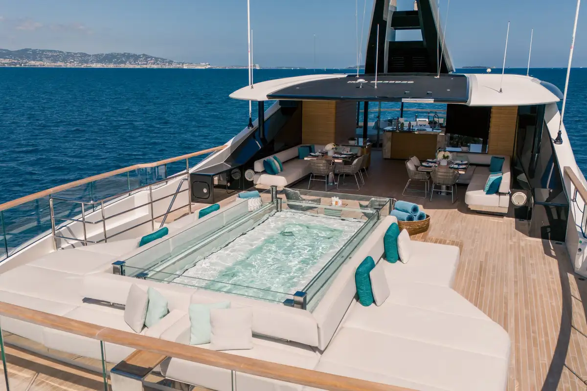Outdoors, C reveals an entertainer’s dream. The main deck features a spectacular glass-fronted jacuzzi pool with panoramic views. On the upper deck, two extendable dining tables offer al fresco dining at its most luxurious, while the sun deck boasts a circular lounge area and a second jacuzzi on the aft, perfect for soaking in the sunset or sipping cocktails under the stars.