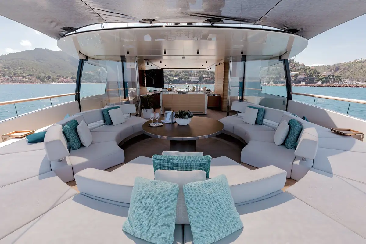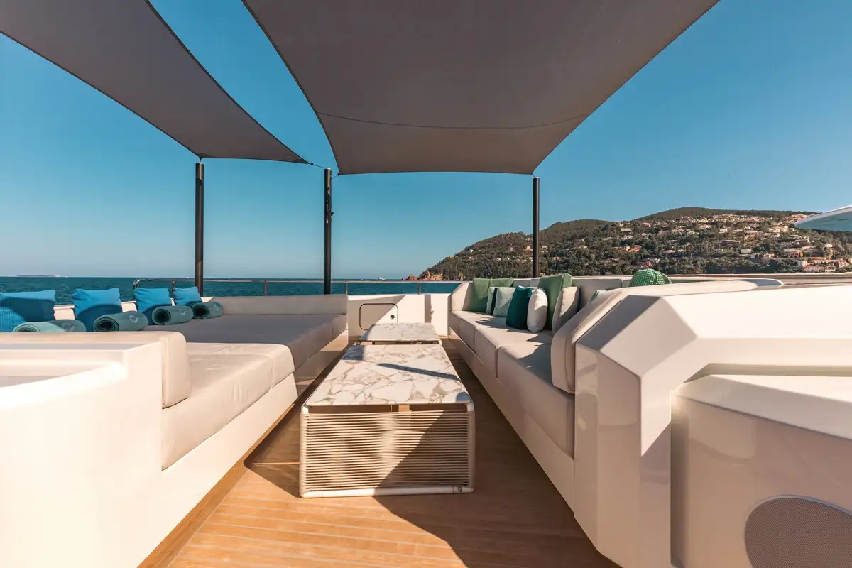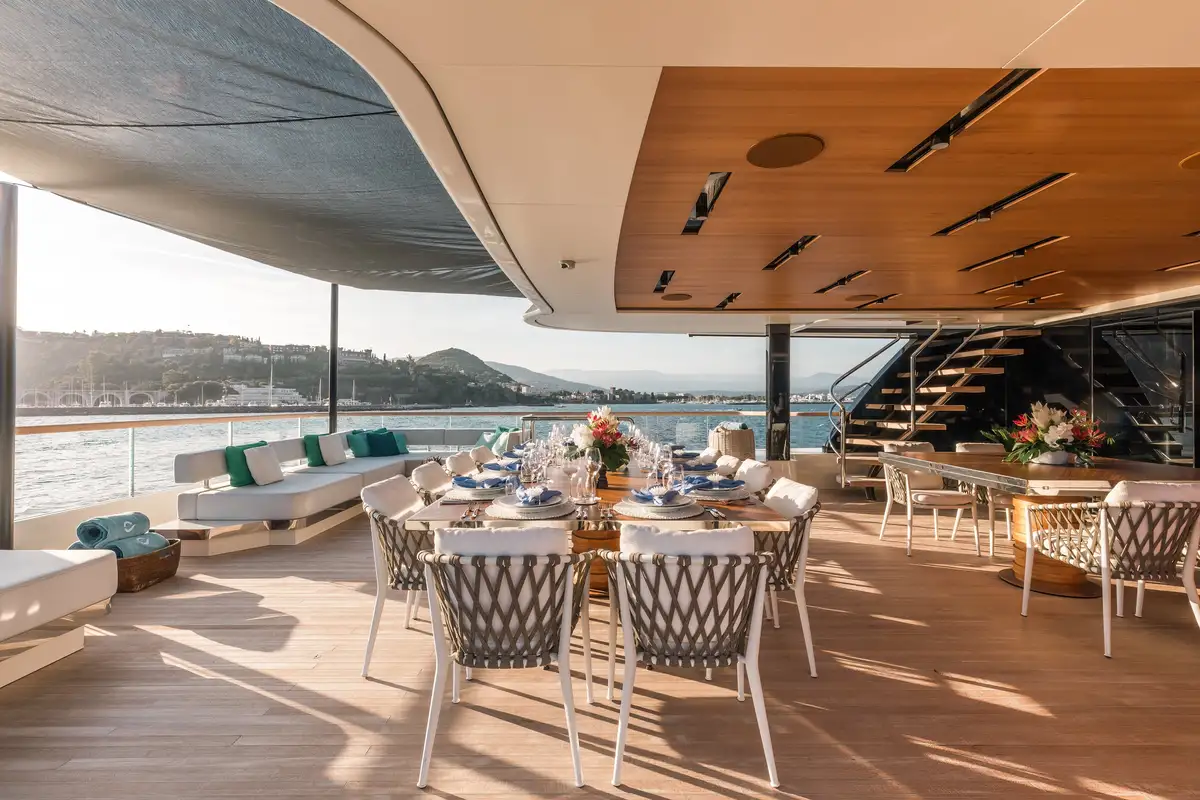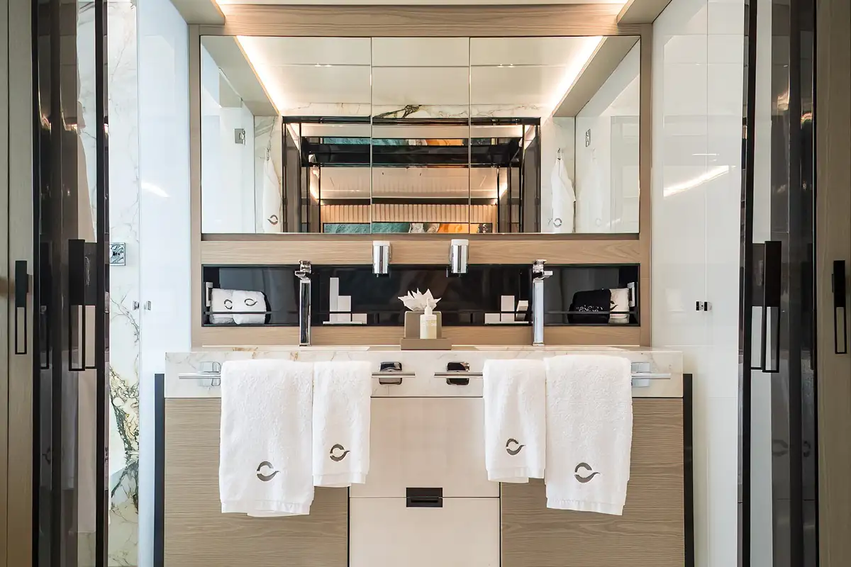 Outdoors, C reveals an entertainer’s dream. The main deck features a spectacular glass-fronted jacuzzi pool with panoramic views. On the upper deck, two extendable dining tables offer al fresco dining at its most luxurious, while the sun deck boasts a circular lounge area and a second jacuzzi on the aft, perfect for soaking in the sunset or sipping cocktails under the stars.