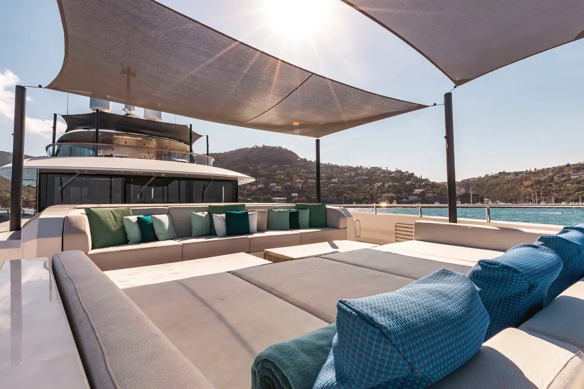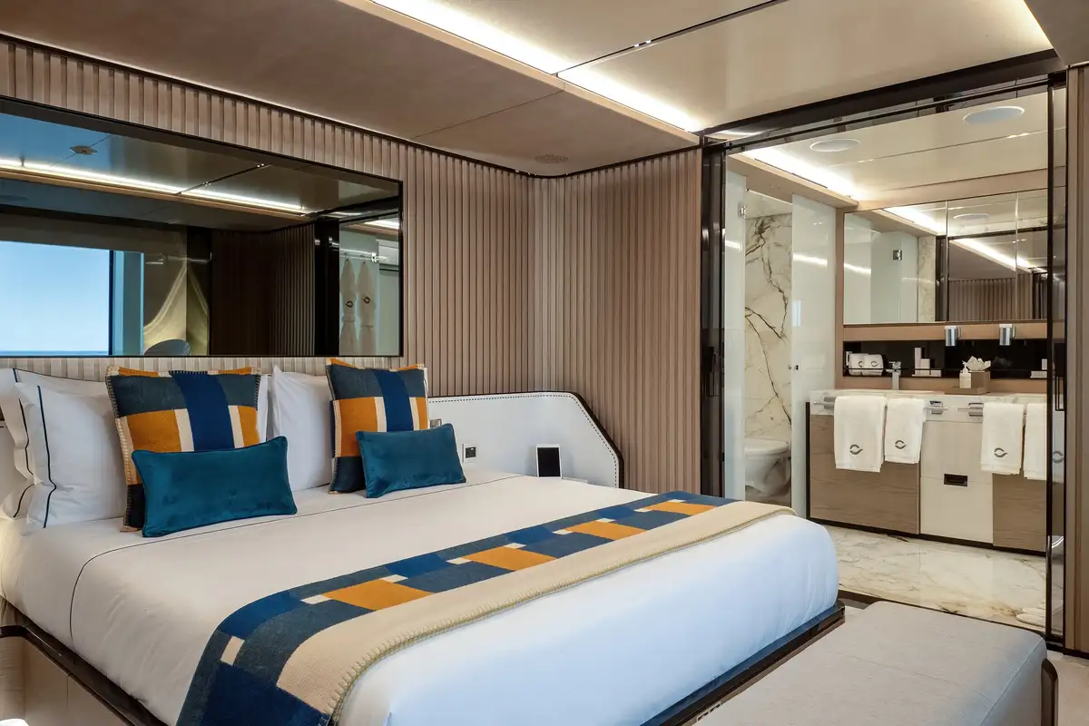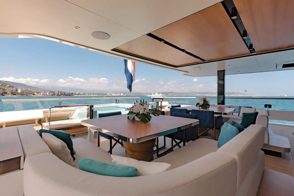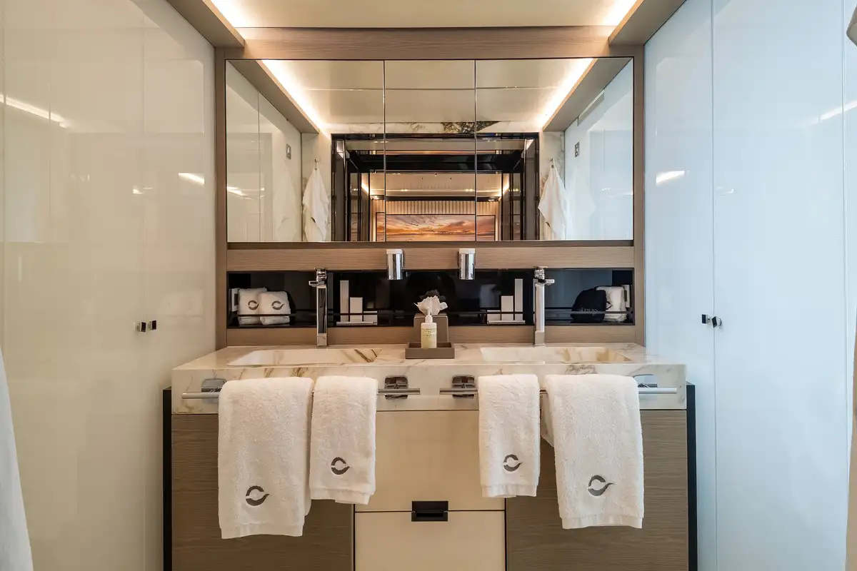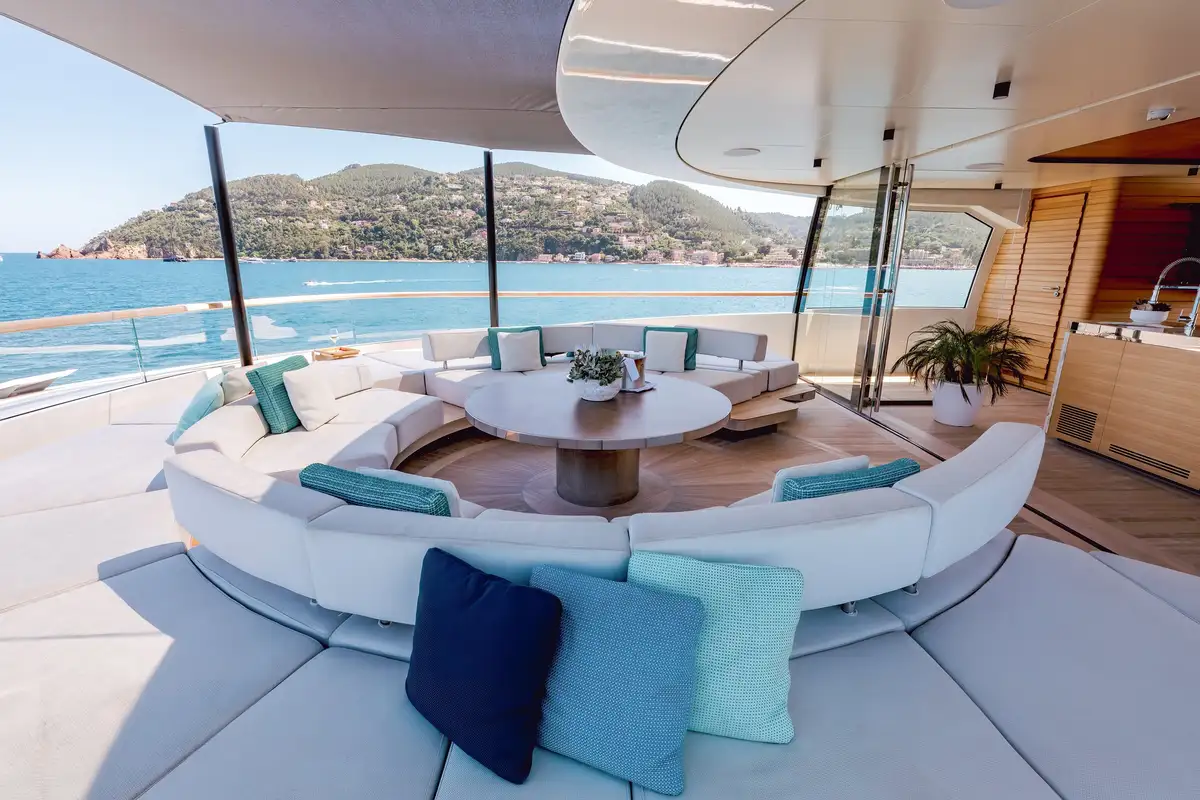 Outdoors, C reveals an entertainer’s dream. The main deck features a spectacular glass-fronted jacuzzi pool with panoramic views. On the upper deck, two extendable dining tables offer al fresco dining at its most luxurious, while the sun deck boasts a circular lounge area and a second jacuzzi on the aft, perfect for soaking in the sunset or sipping cocktails under the stars.