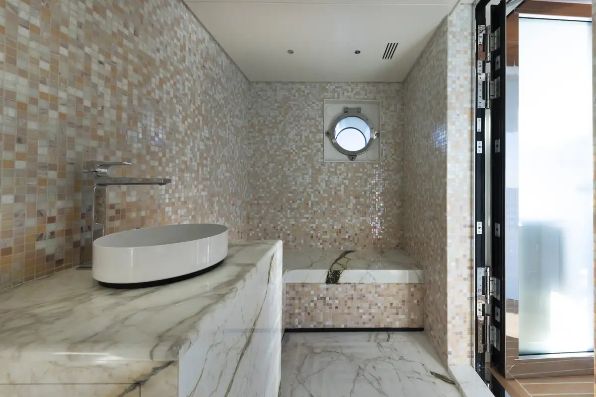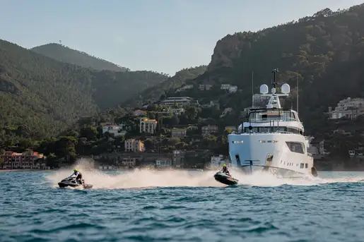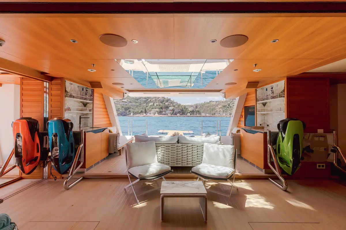 Yet perhaps C's most impressive feature is her exceptional beach club. Breezy and open via hydraulic platforms unfolding on three sides, it captures the essence of indoor-outdoor living. Stylishly furnished for lazy afternoons at the water’s edge, this space also houses a private gym, a serene massage room, and a traditional hammam, able to deliver the full spa experience just steps from the sea.
