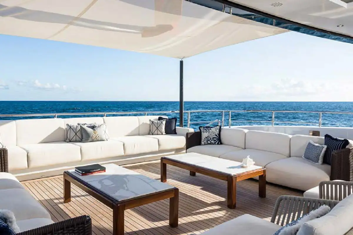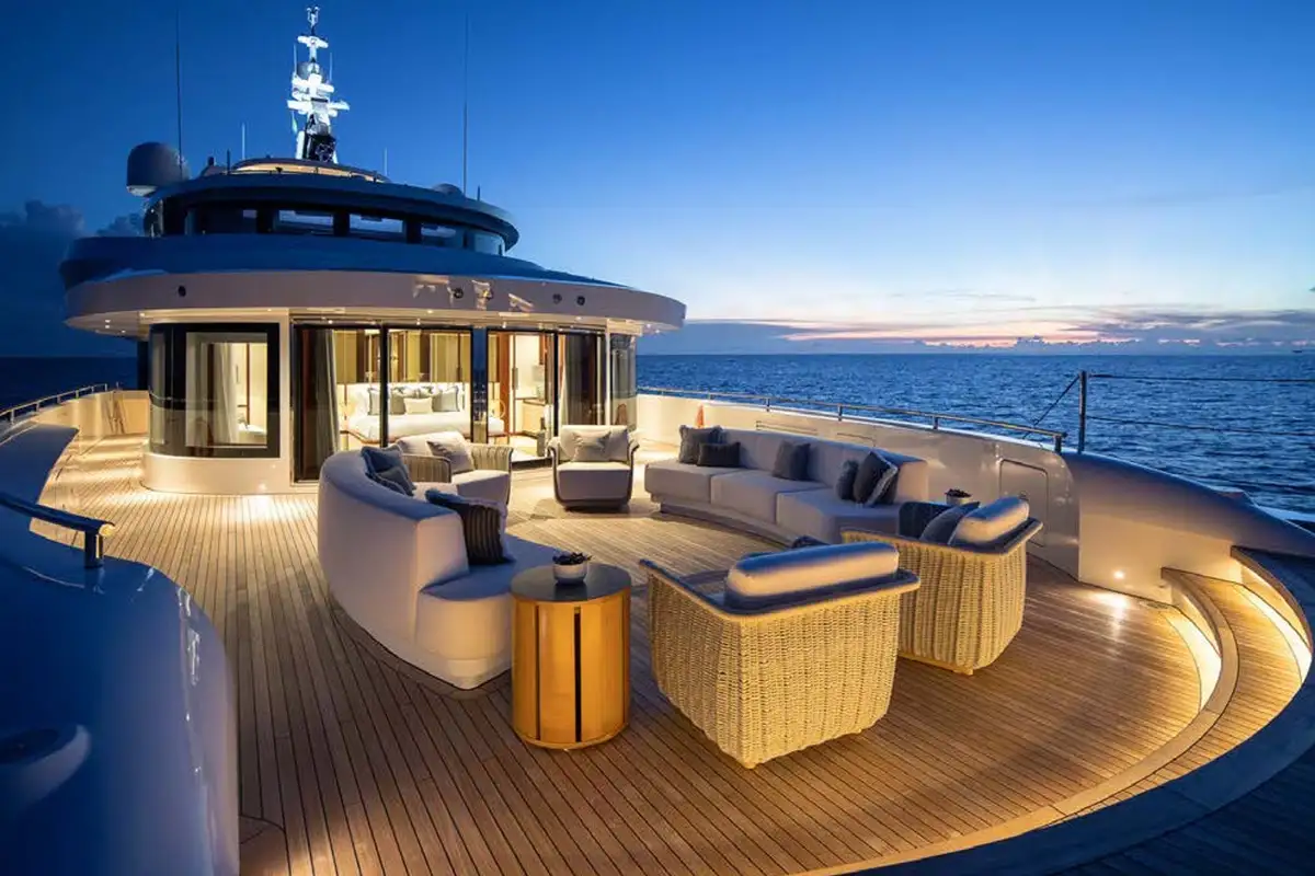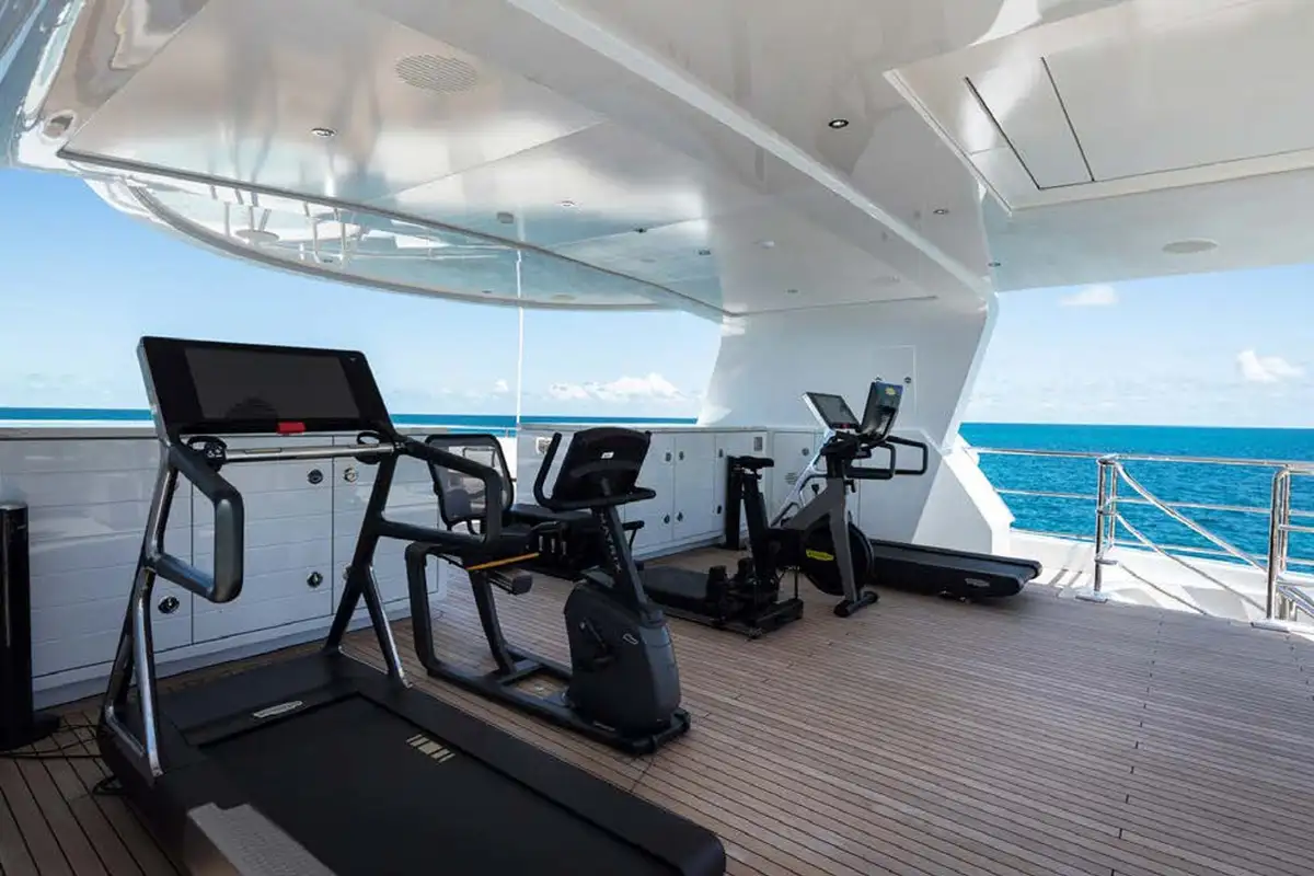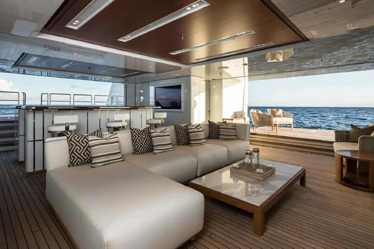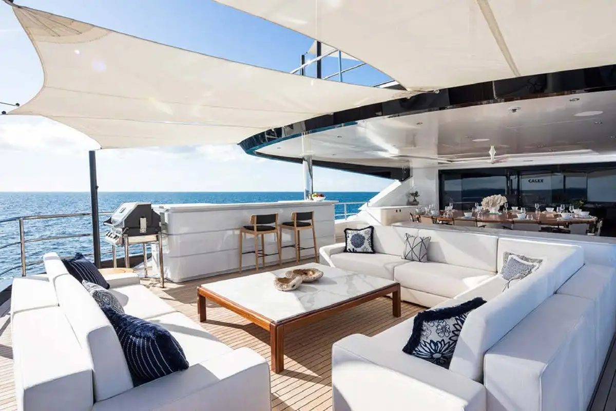 Outdoor living is at the core of the CALEX experience. Her sun deck offers a complete wellness escape with a jacuzzi, open-air gym and yoga area, while the upper and main aft decks provide shaded dining and lounge spaces for meals and celebrations under the stars. The bridge deck, too, transforms into an inviting entertainment zone, featuring a full-service bar and panoramic vistas.