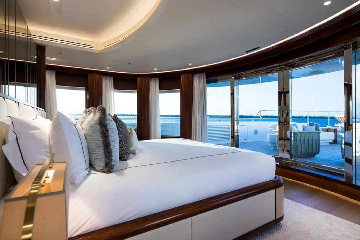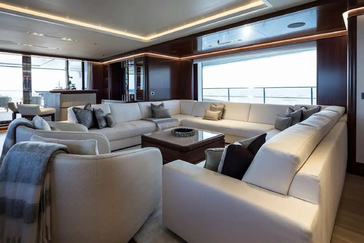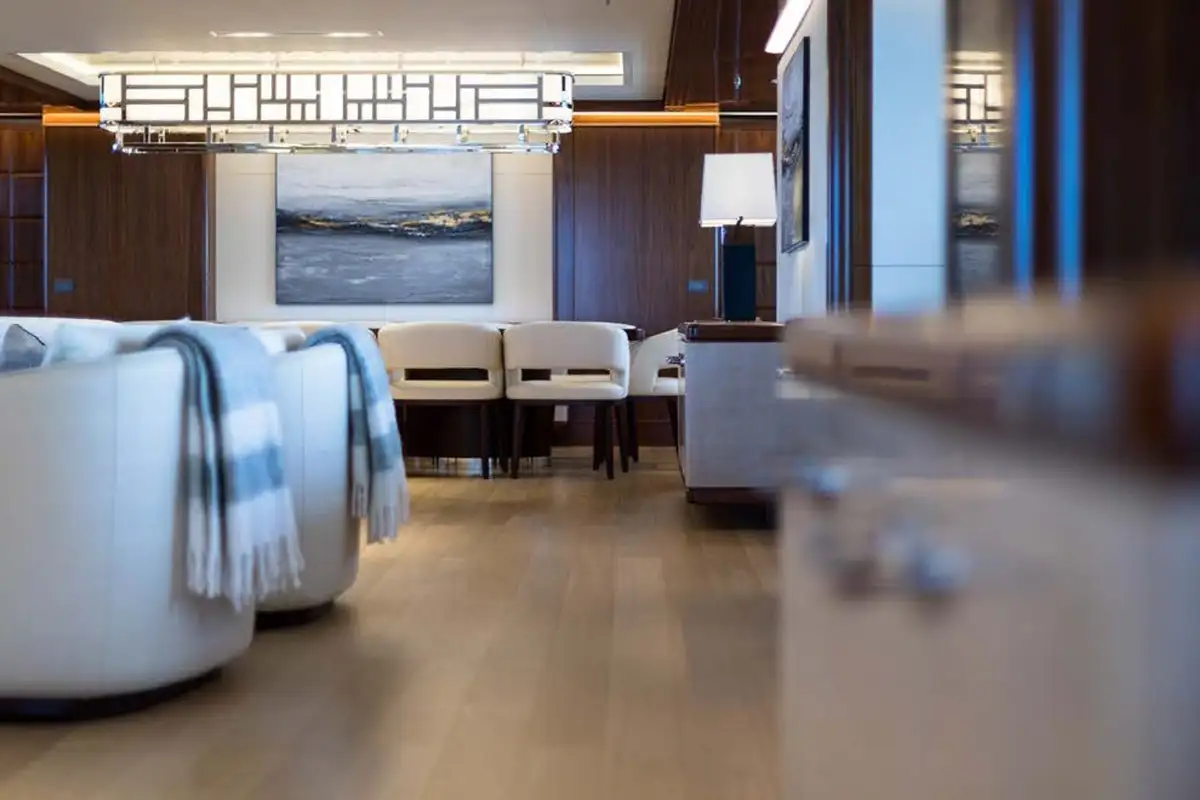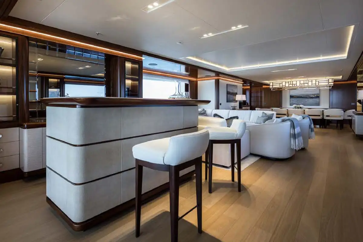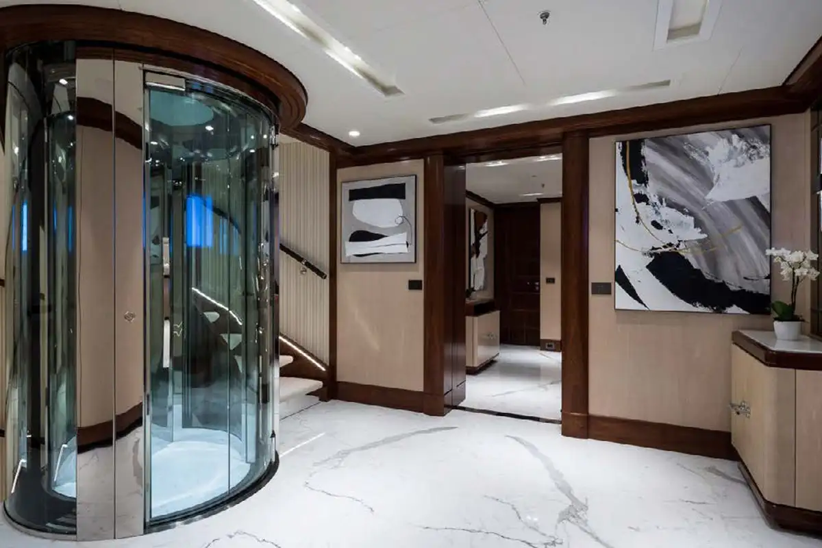 Inside, guests are welcomed into light-filled spaces where statuary marble, rich textures, and curated artwork evoke a refined, residential ambience. The main deck lounge invites sociable gatherings with its oversized U-shaped sofa, bar, and formal dining table, while accessibility is paramount thanks to a sleek glass elevator connecting all interior decks.