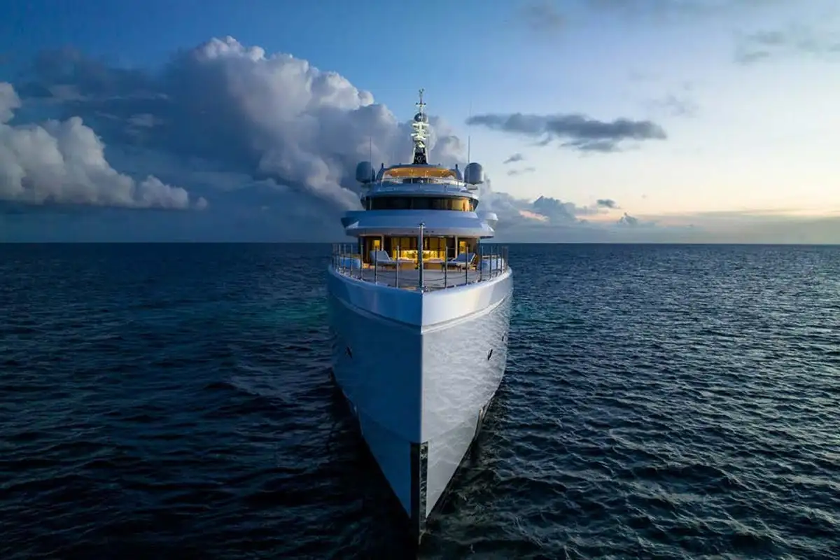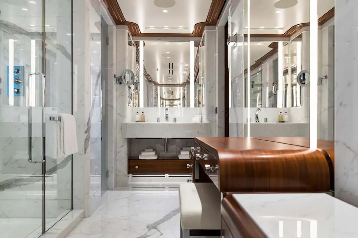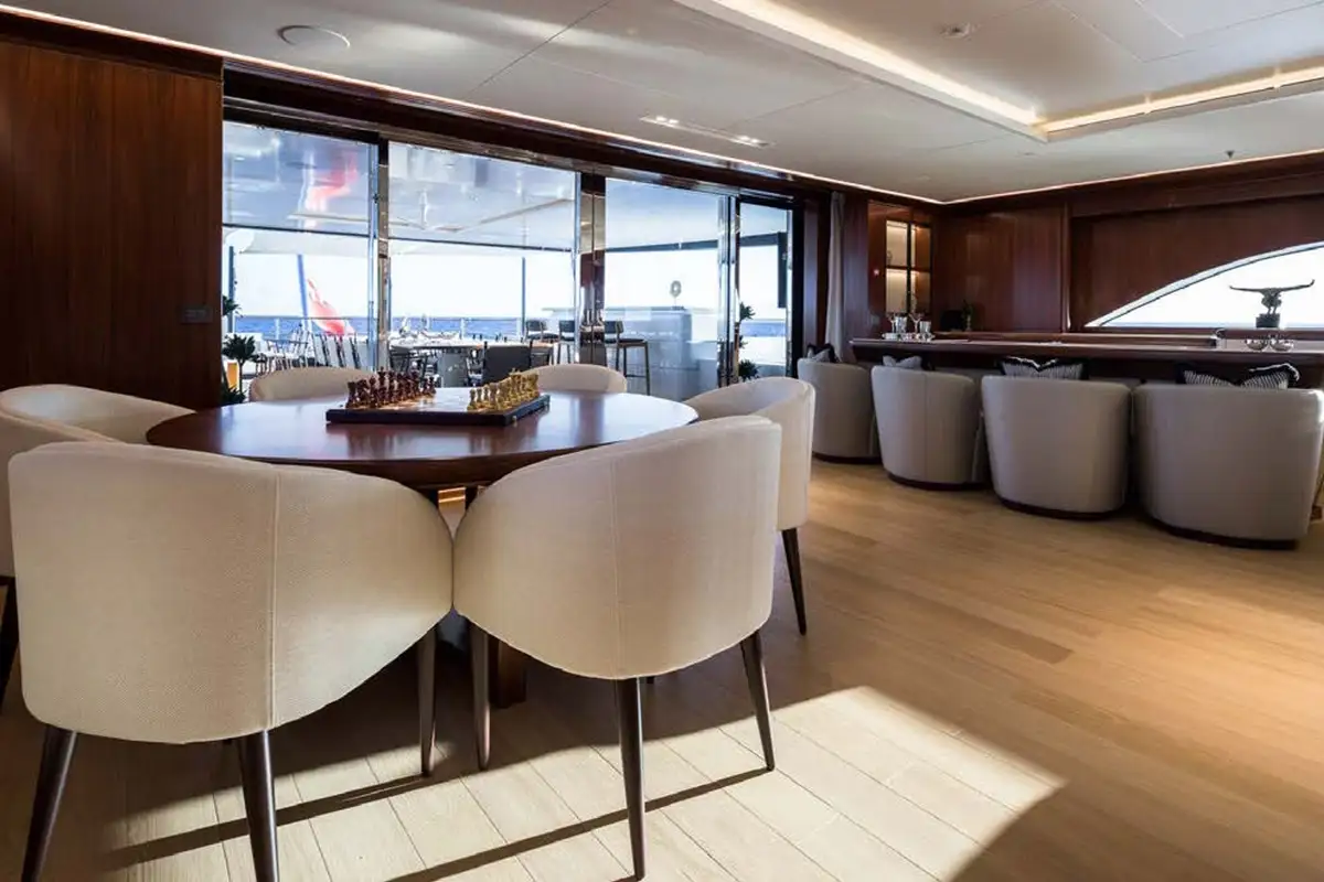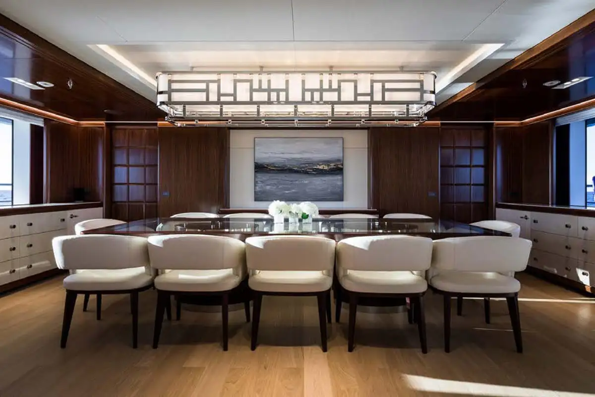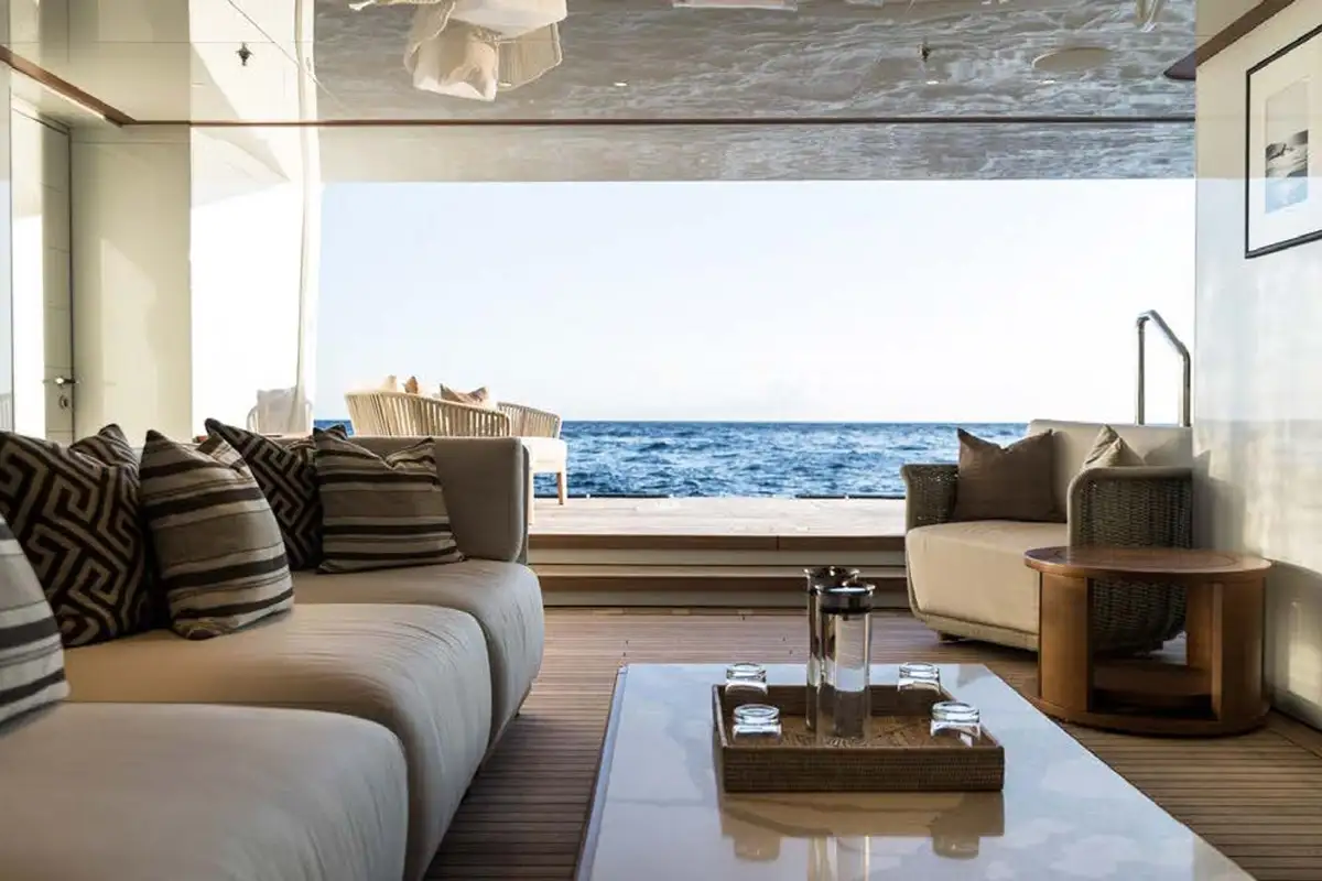 Inside, guests are welcomed into light-filled spaces where statuary marble, rich textures, and curated artwork evoke a refined, residential ambience. The main deck lounge invites sociable gatherings with its oversized U-shaped sofa, bar, and formal dining table, while accessibility is paramount thanks to a sleek glass elevator connecting all interior decks.