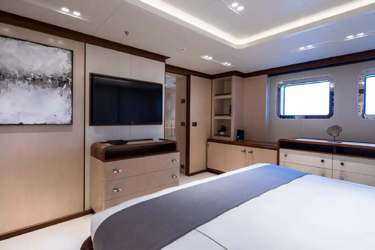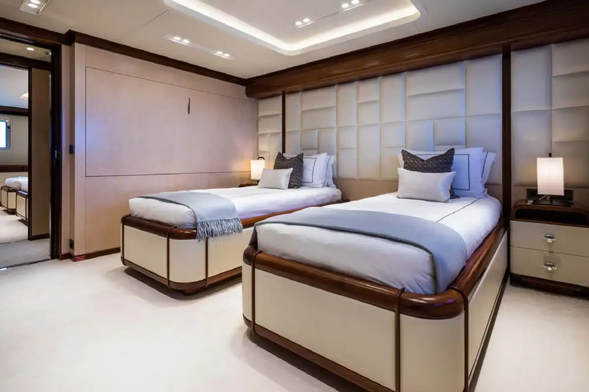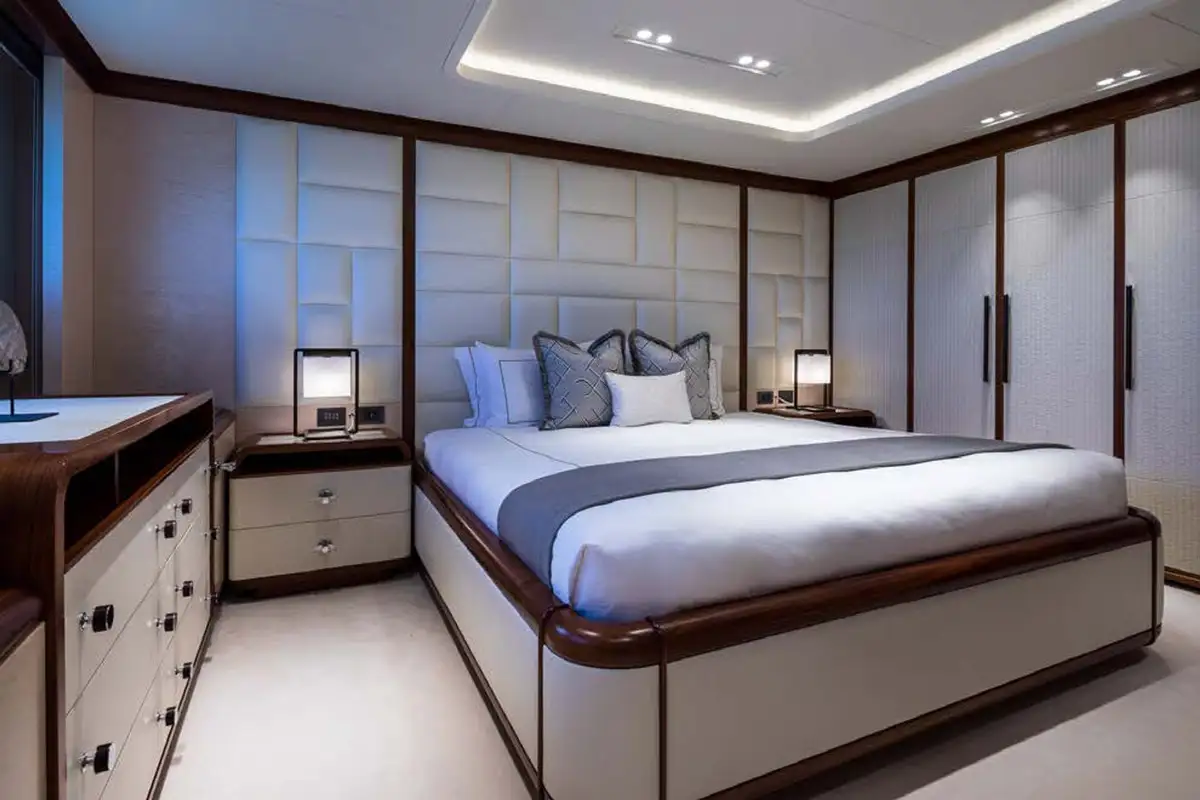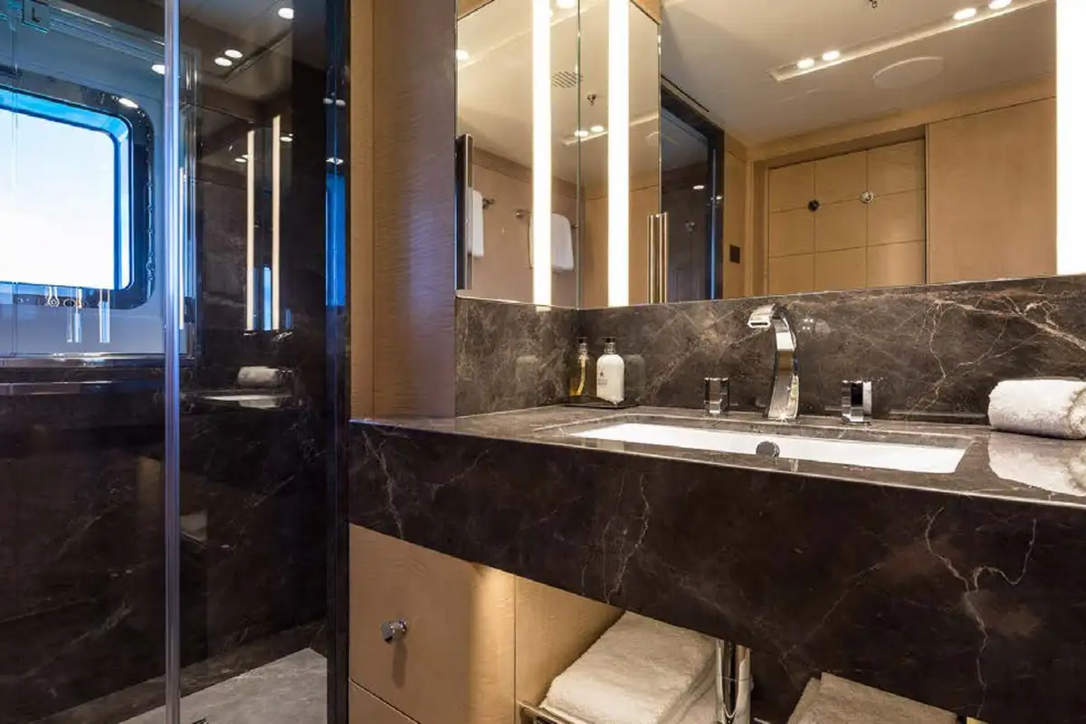 CALEX accommodates up to 12 guests across seven serene cabins, each with its own marble-clad en suite bathroom. Two VIP suites on the main deck and four flexible lower deck cabins, which include two convertible twins with pullman berths, make her ideal for mixed charter parties. Whether you're travelling with family or friends, CALEX’s charter-friendly layout ensures both privacy and togetherness, tailored to every moment on board.