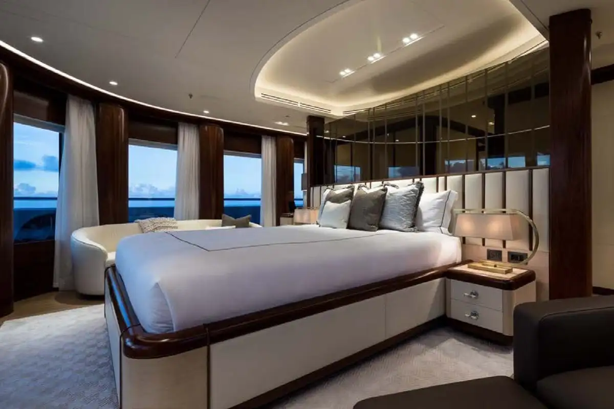 At the heart of CALEX is an uncompromising commitment to privacy and space. Her most prized asset is the upper deck owner’s suite, an expansive haven complete with a private office, spa-style double en suite, and its own secluded foredeck terrace. Panoramic 180-degree views, paired with direct access to an al fresco lounge via sliding doors, create an exclusive retreat unlike any other on the charter market.