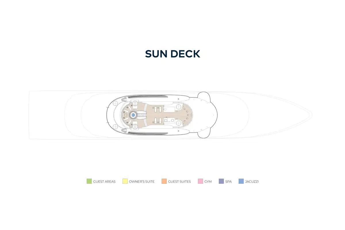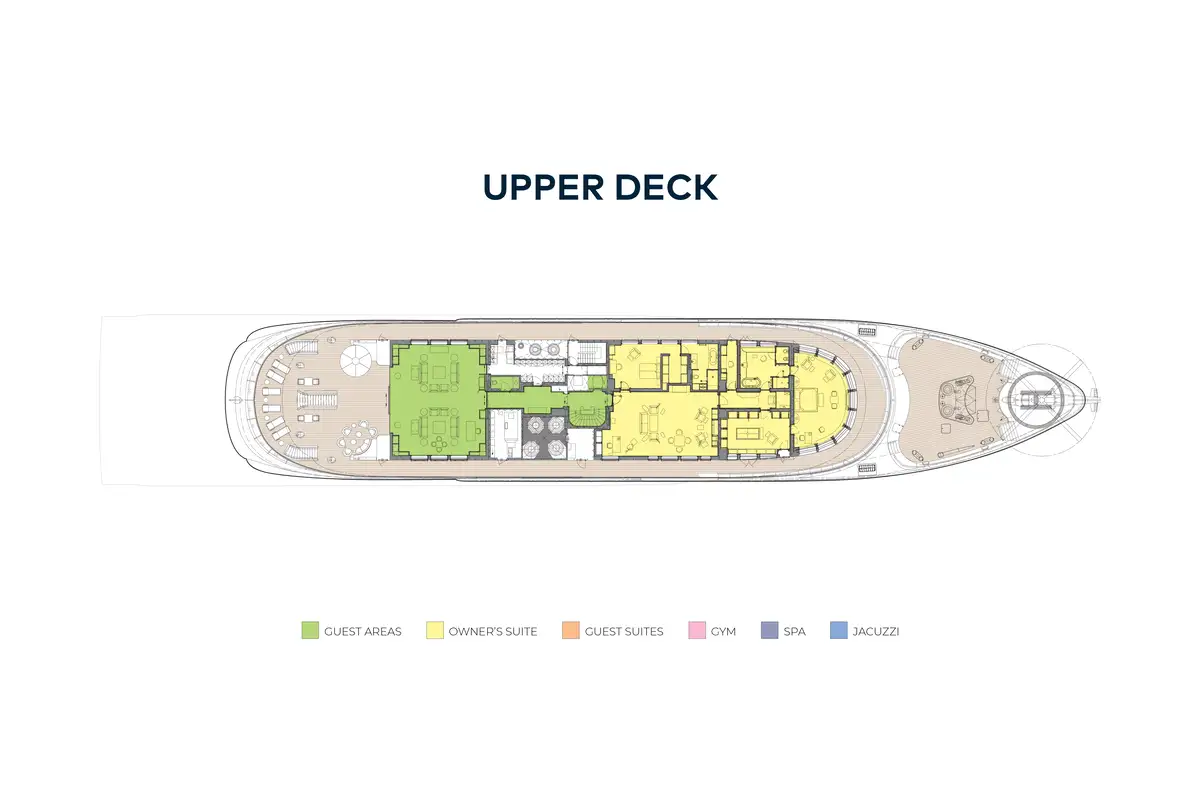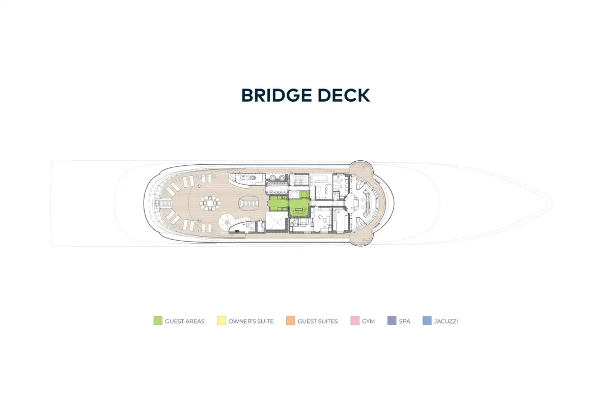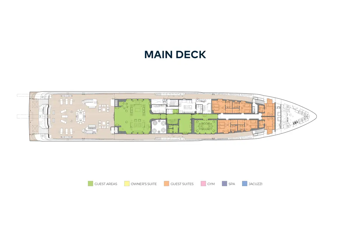 There are eight guest suites on board, plus separate quarters for six of your staff or servants. The master suite, on its own private deck, includes a VIP double as well as the owner’s cabin, which has a separate private living room and a commanding 180° view from its super king size bed. The owner’s deck also includes a club lounge and a spacious outside aft deck.