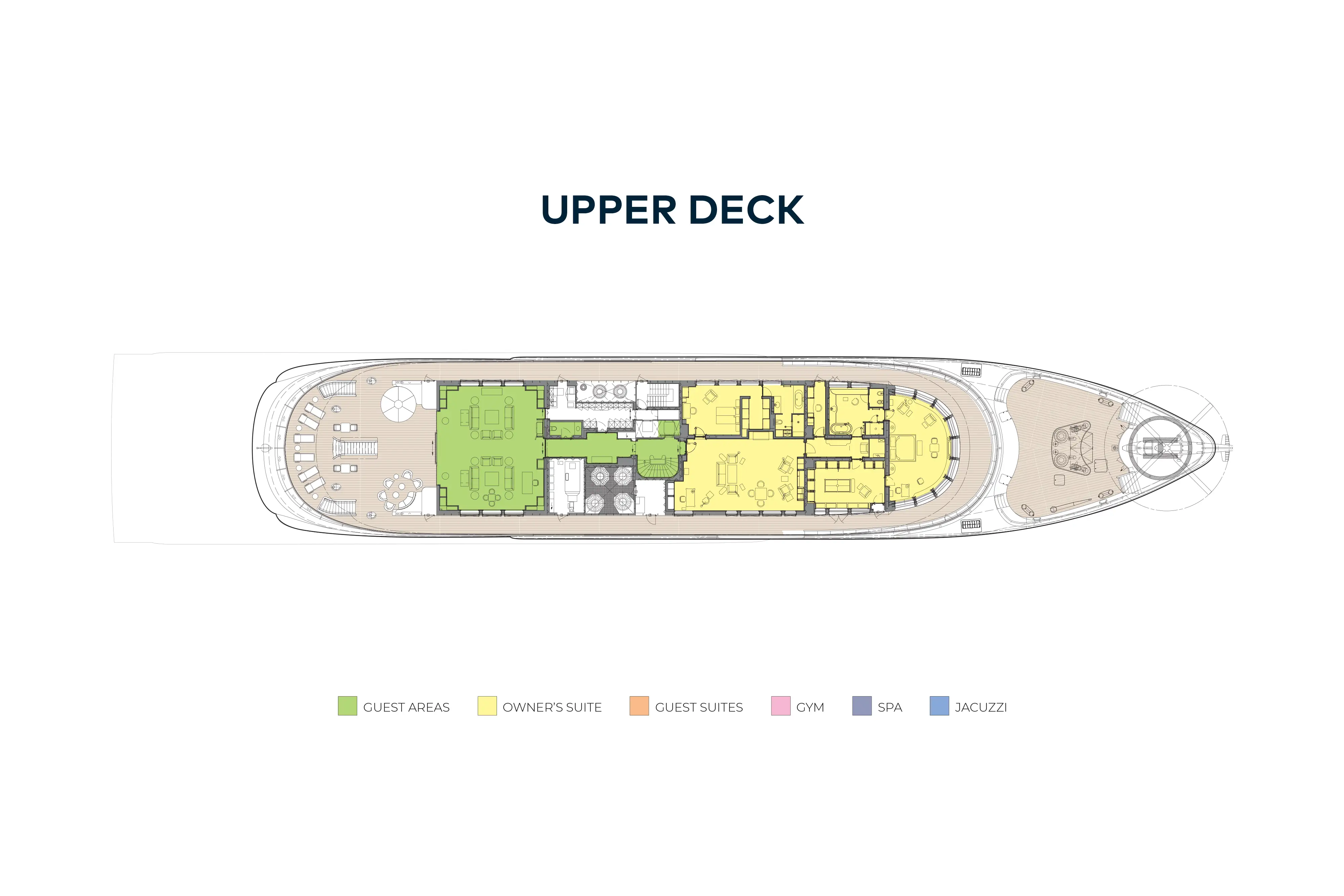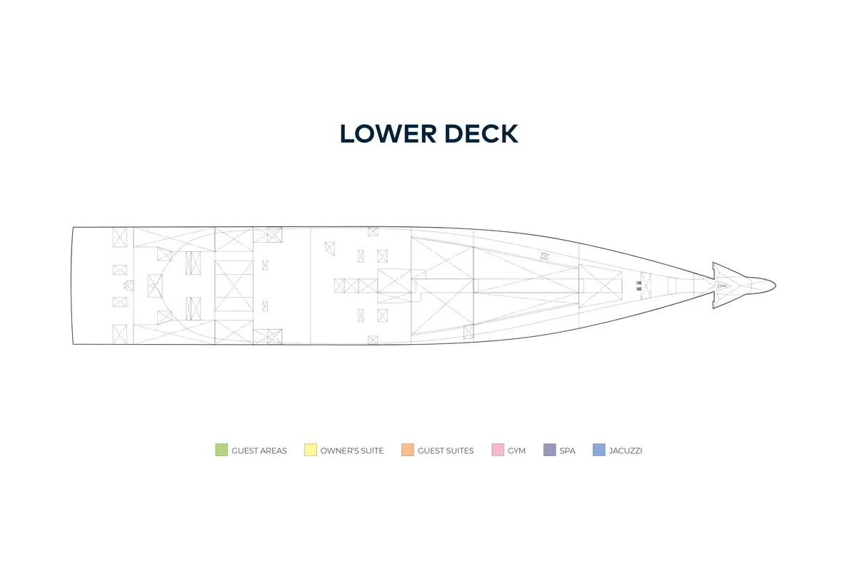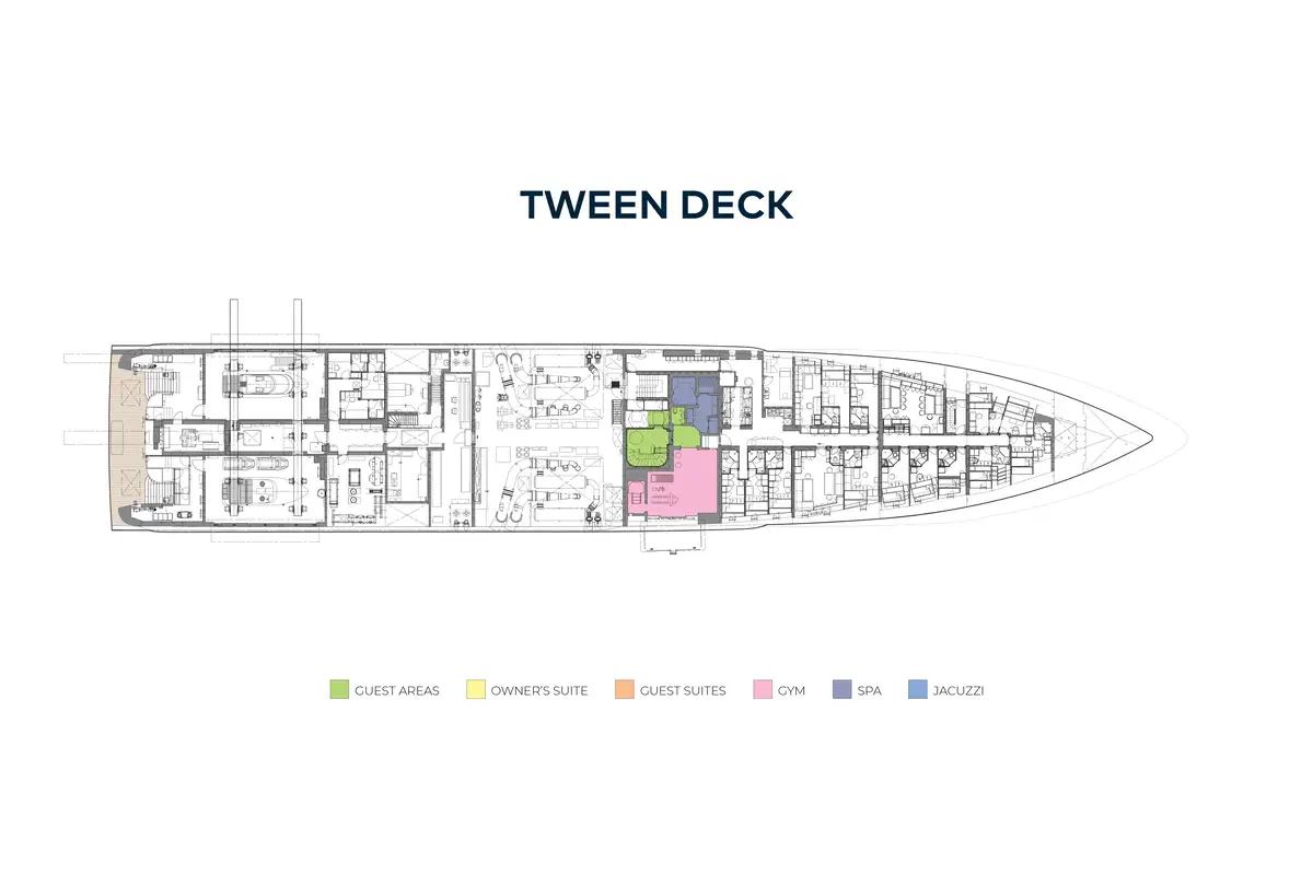 There are eight guest suites on board, plus separate quarters for six of your staff or servants. The master suite, on its own private deck, includes a VIP double as well as the owner’s cabin, which has a separate private living room and a commanding 180° view from its super king size bed. The owner’s deck also includes a club lounge and a spacious outside aft deck.