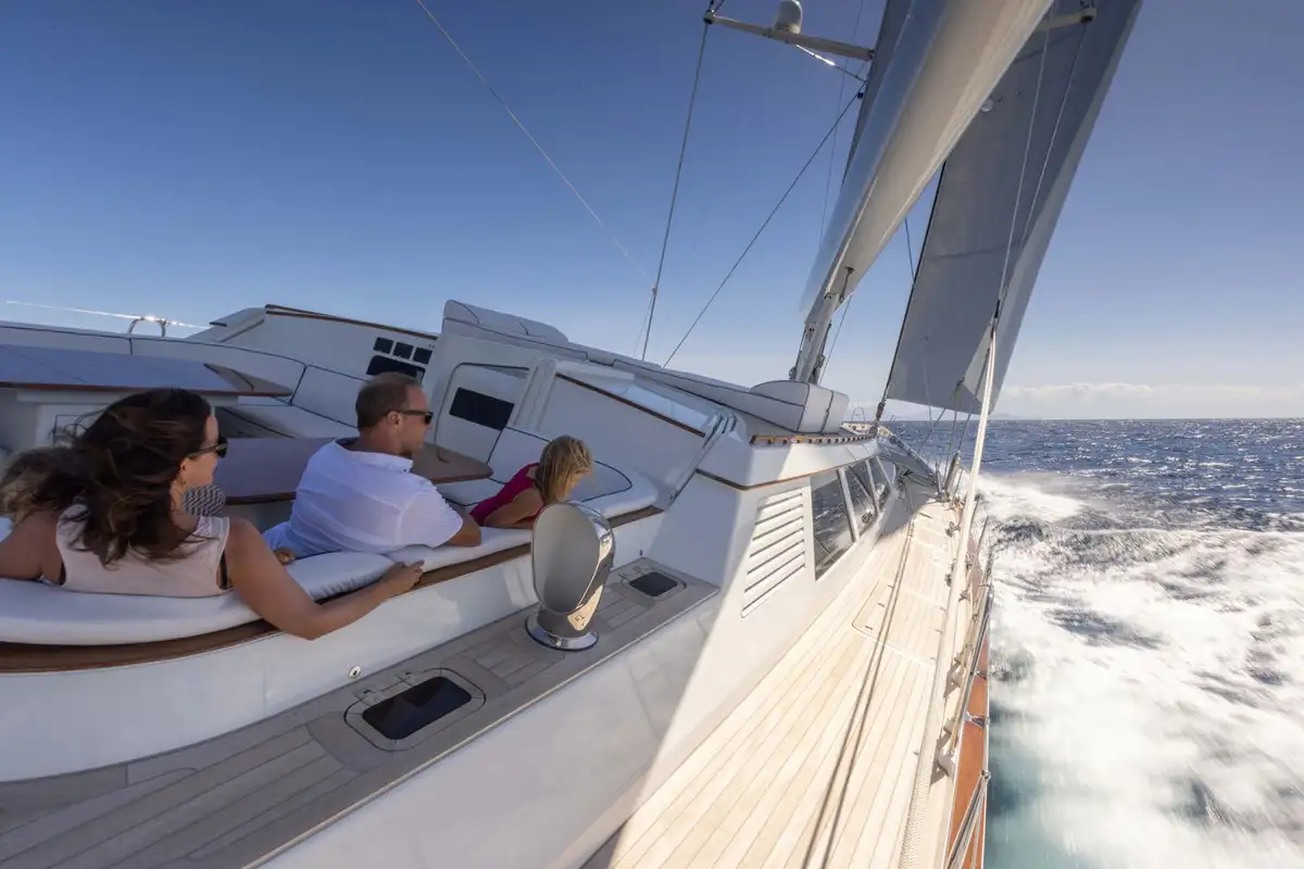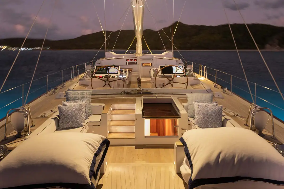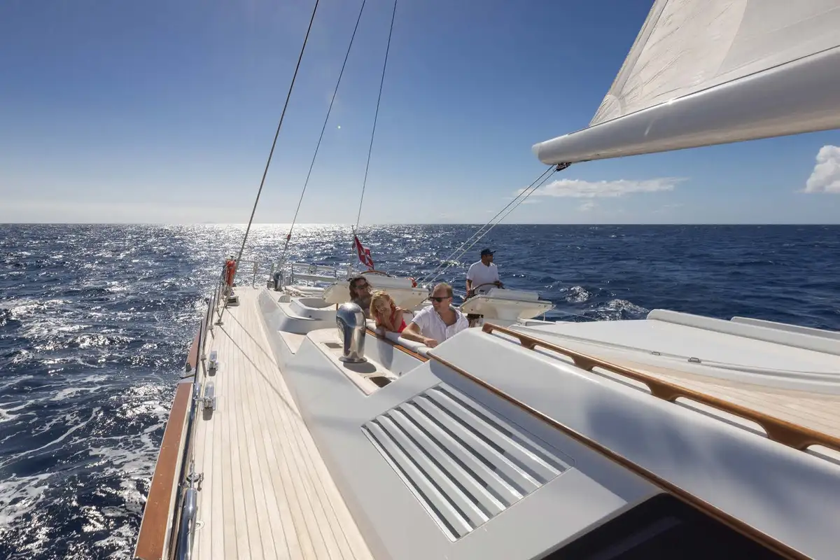 Under sail, the guest cockpit is a family-friendly place, free from any sail-control lines, where you can feel the exhilarating power sheltered from the elements by the pilot house. Head up to the bow to experience the sheer magic of dolphins weaving in and out of the bow wave or stretch out on the aft deck, where you can tan listening to the roar of the yacht’s wake.