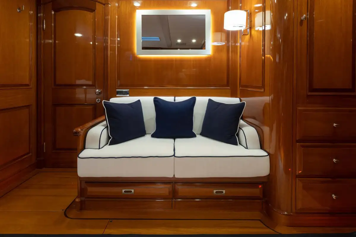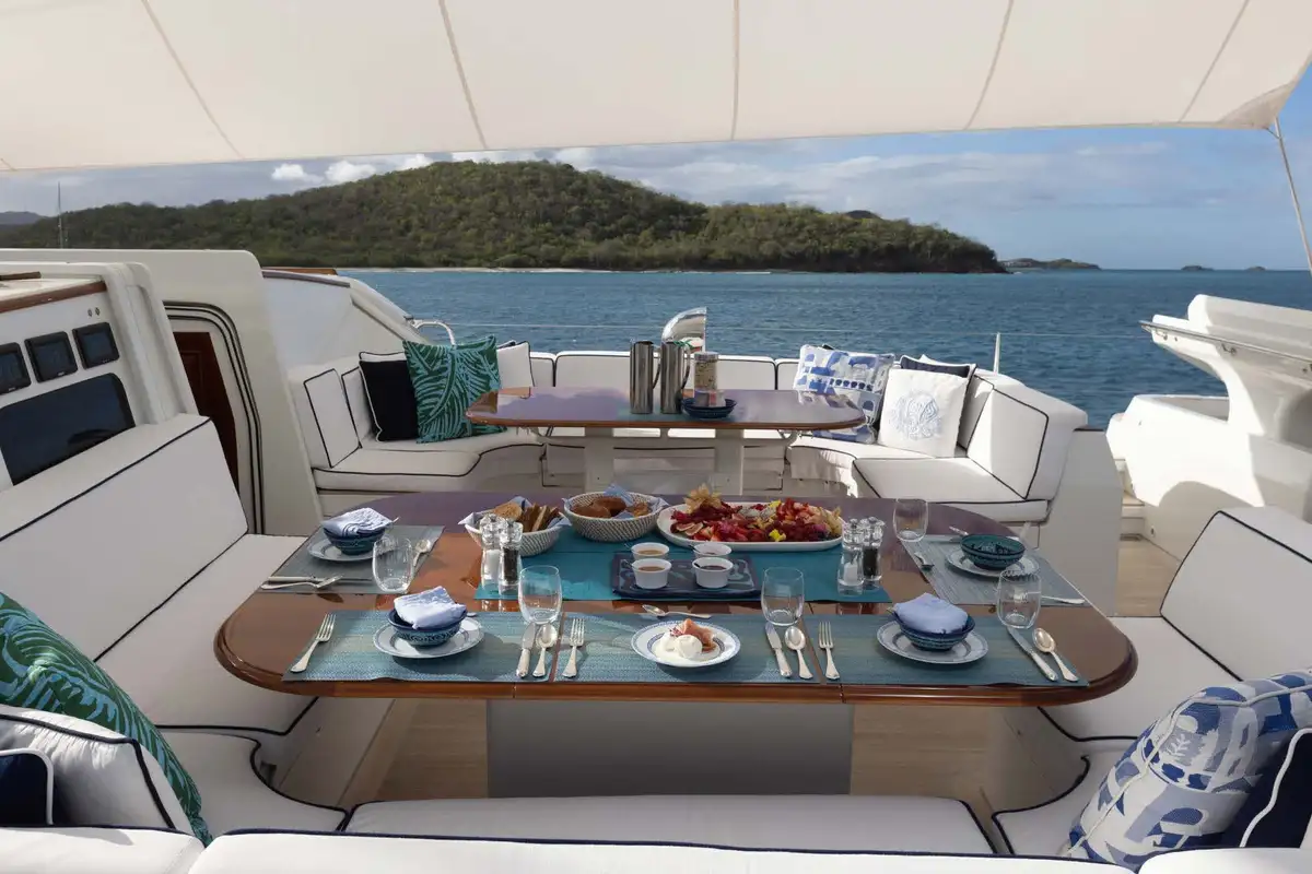 At anchor, the acres of deck space come into their own. There are sunpads on the pilot house roof, deck furniture forward of the mast where you can watch the sunset with your favourite cocktail, and a Bimini fits above the guest cockpit to create a shaded space.