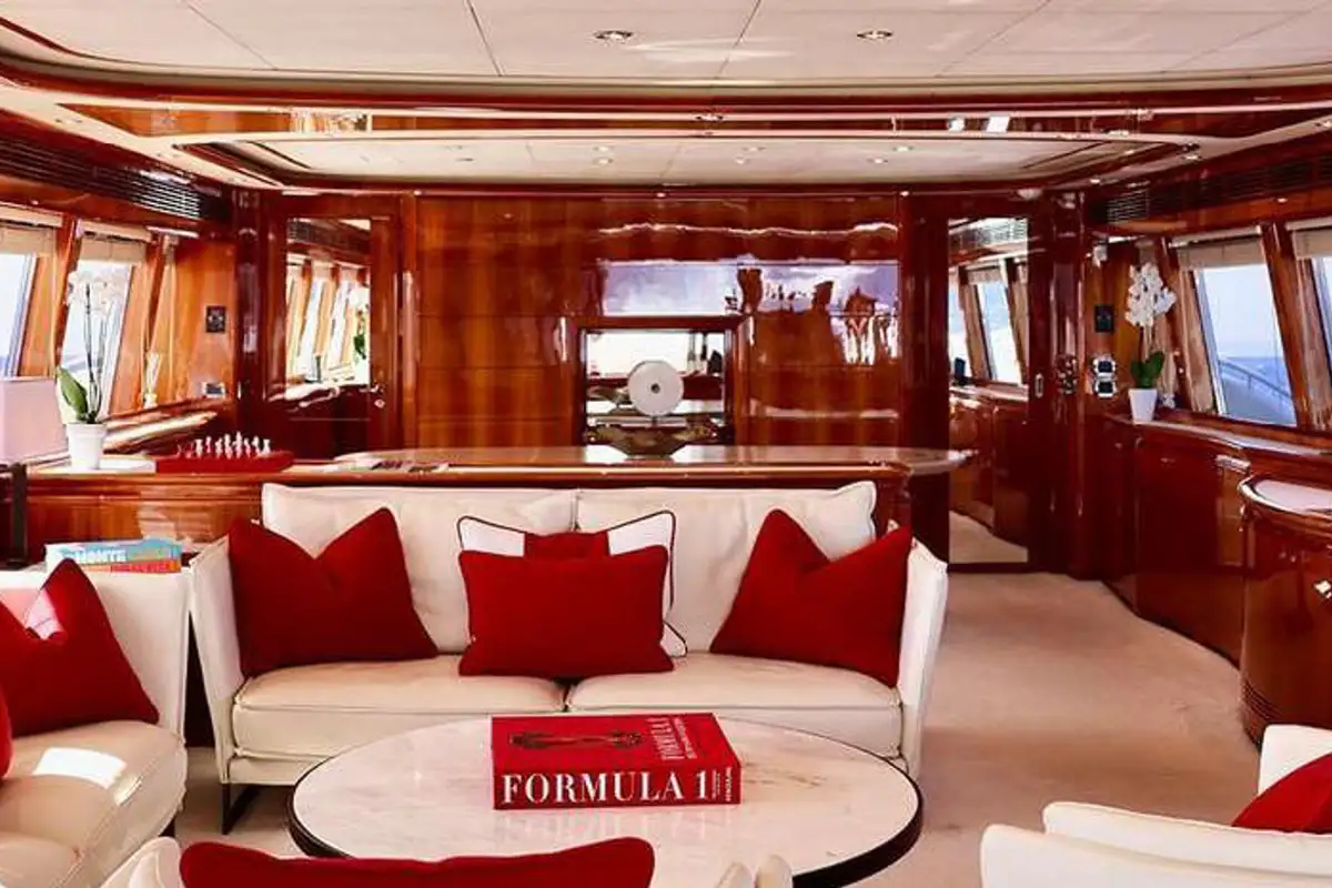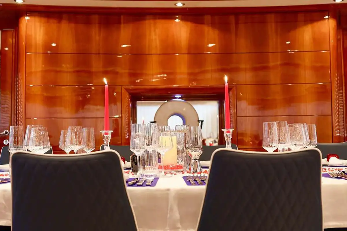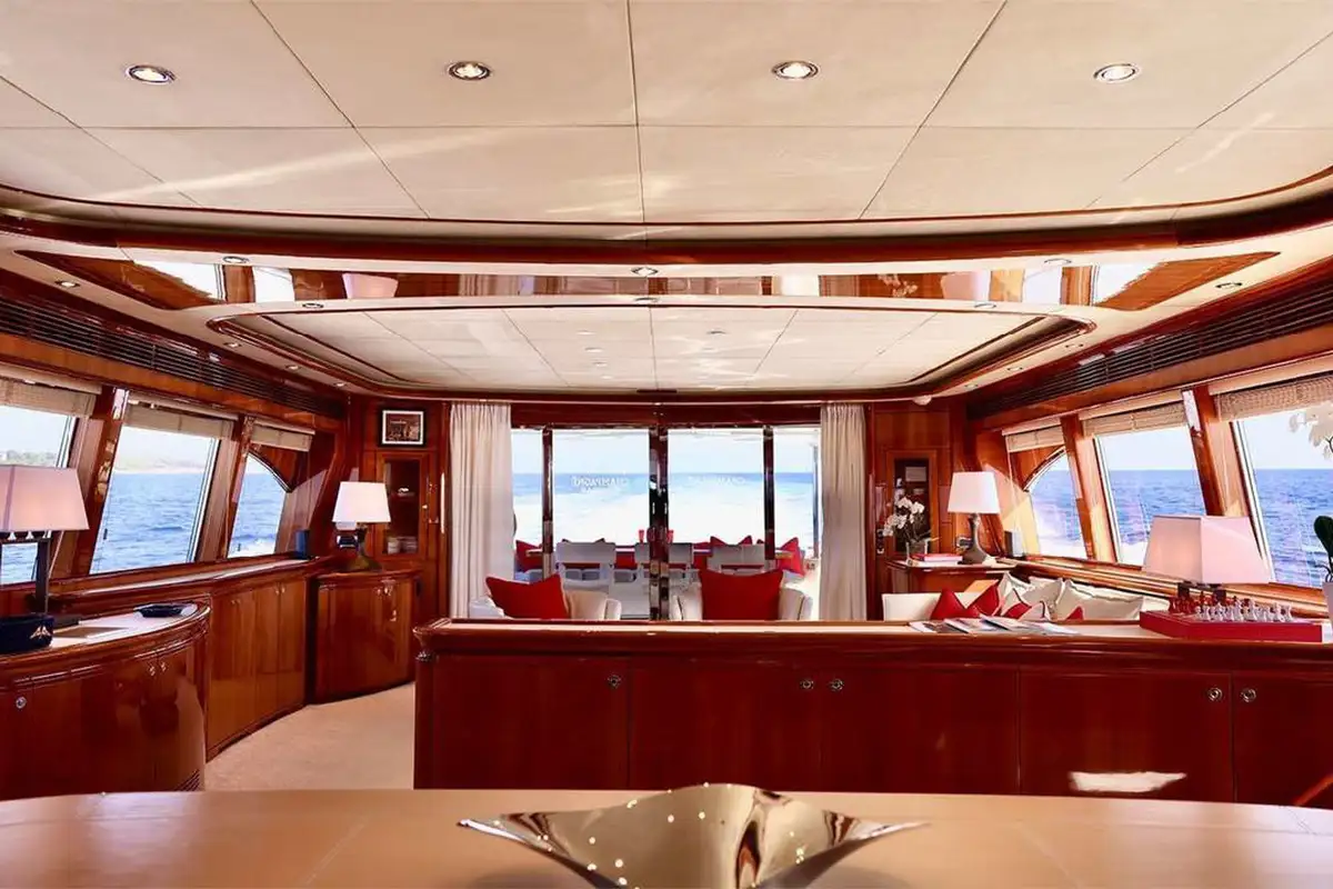 The main deck lounge is a warm and inviting space, featuring rich walnut finishes, expansive windows, and curated décor, including original Slim Aarons photography. The lounge offers plush U-shaped seating, a bar, and a full entertainment system. Forward, a striking glass dining table sets the scene for both intimate dinners and formal dining occasions.