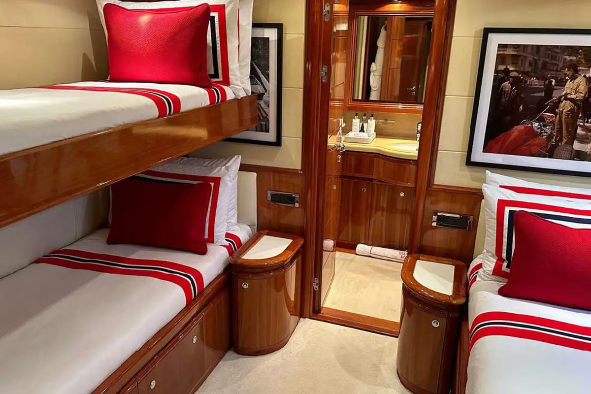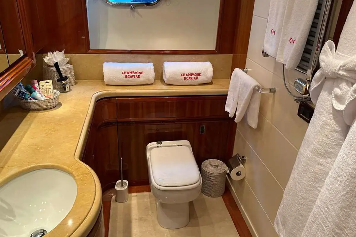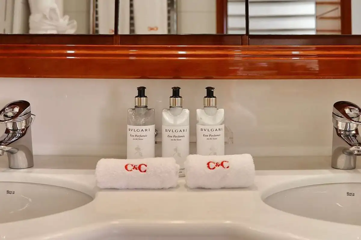 CHAMPAGNE AND CAVIAR accommodates 12 guests across five cabins, including a full-beam master, two doubles, and two twins with pullman berths. Each cabin is en suite, offering a well-appointed and spacious retreat for guests to enjoy in full. When it’s time to play, CHAMPAGNE AND CAVIAR’s toybox is ready with an exciting selection of tenders and watertoys for all ages. And for those with an active cruising itinerary, her top speed of 23 knots ensures swift, comfortable travel between destinations.