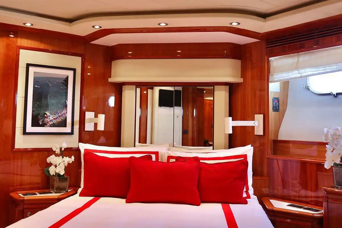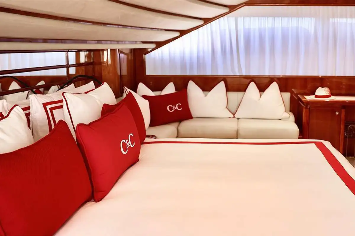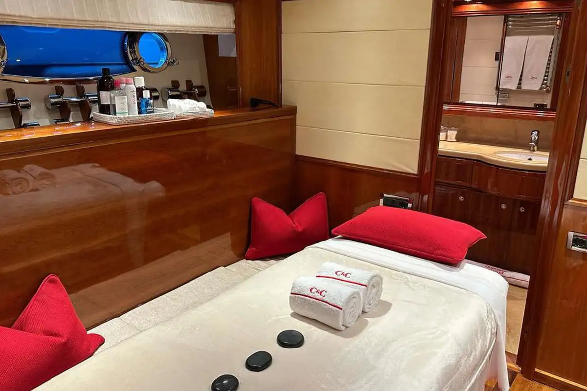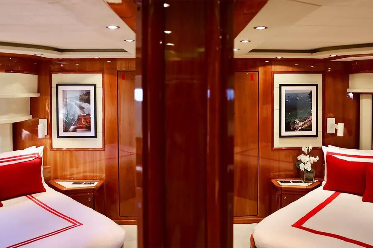 CHAMPAGNE AND CAVIAR accommodates 12 guests across five cabins, including a full-beam master, two doubles, and two twins with pullman berths. Each cabin is en suite, offering a well-appointed and spacious retreat for guests to enjoy in full. When it’s time to play, CHAMPAGNE AND CAVIAR’s toybox is ready with an exciting selection of tenders and watertoys for all ages. And for those with an active cruising itinerary, her top speed of 23 knots ensures swift, comfortable travel between destinations.