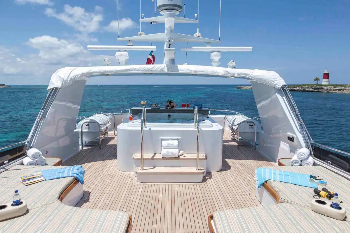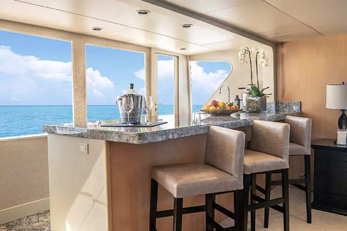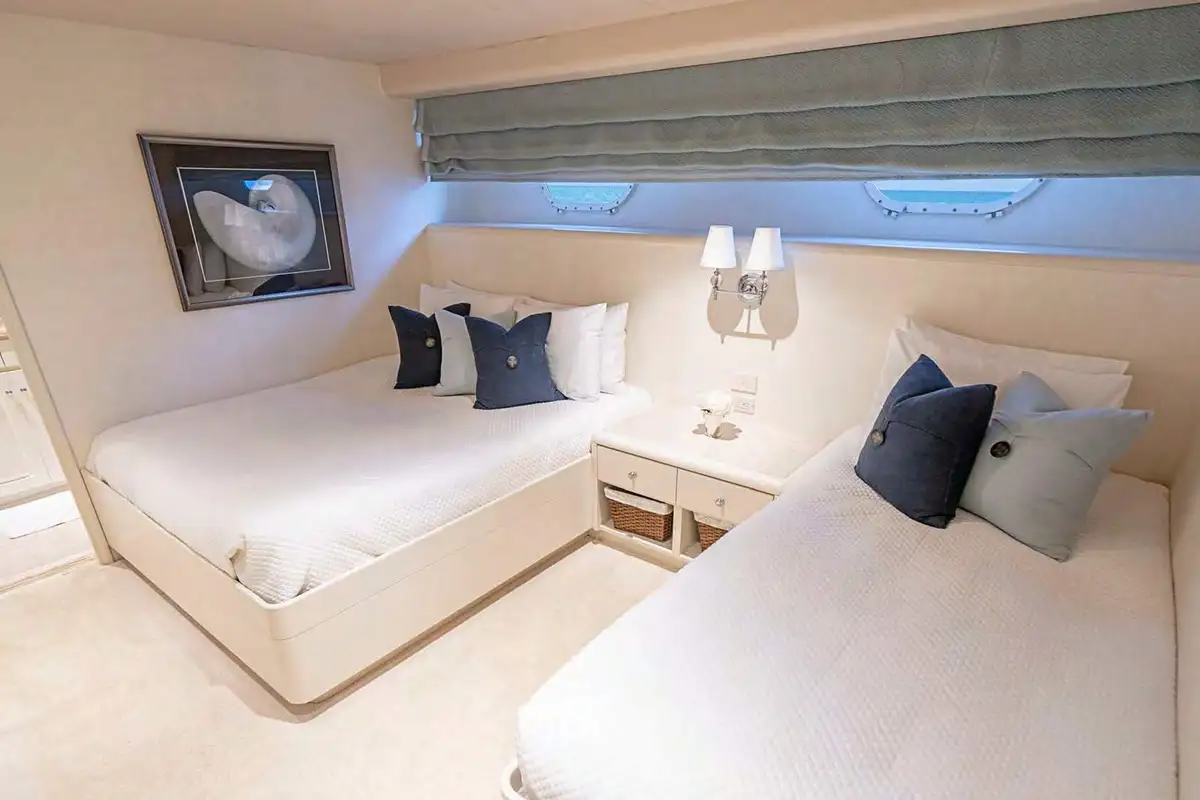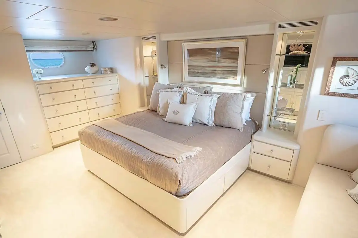 Venture up to the flybridge, where you’ll find an inviting Jacuzzi with built-in bar stools, a sun lounge, and a Bimini top, perfect for both sun-soaked and shaded relaxation. CHANSON accommodates up to 8 guests across 4 well-appointed staterooms. The on-deck VIP stateroom features large windows, a king bed, and an en-suite bath with shower. The full-beam master suite includes a king bed and private his-and-hers bathrooms, with a shower in one and a Jacuzzi in the other. Two additional guest cabins, each with spacious en-suite bathrooms, complete the accommodations—one with a full and twin bed, and the other with two twin beds. Beyond her elegant interior, CHANSON boasts an impressive range of water toys, including wave runners, Brownies third lung, and a fully rigged center console tender for endless adventure. With an experienced, energetic crew of six dedicated to providing an exceptional charter experience, CHANSON is your luxurious home on the water, ready to exceed your every expectation.